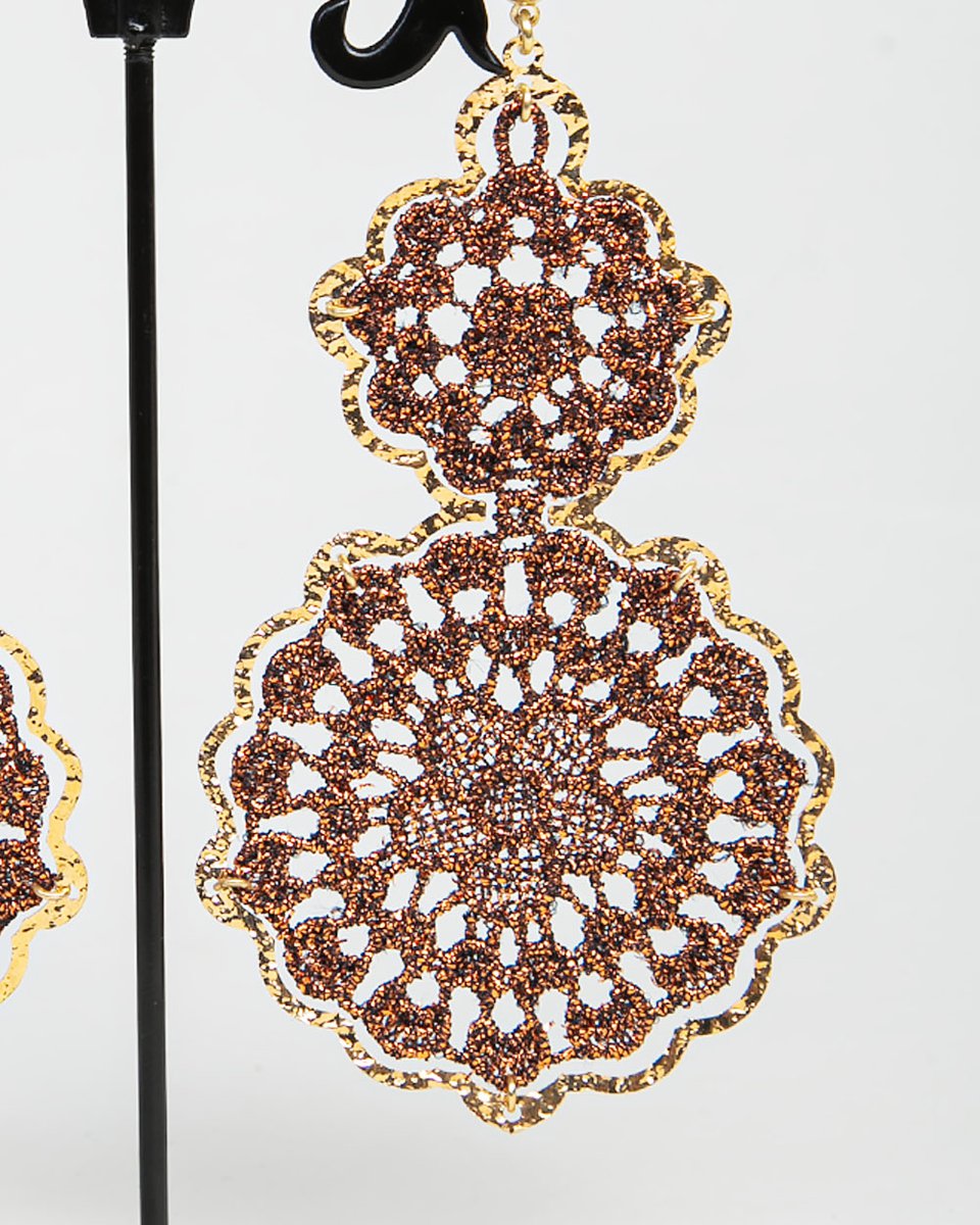 Серьги выполнены из изящного ажурного кружева-макраме, создающего эффект лёгкого, воздушного узора в позолоченном фигурном обрамлении. Швензы изготовлены из медицинского сплава, который безопасен даже для чувствительной кожи, обеспечивая комфорт при длительной носке. Элегантный дизайн добавляет образу тонкую детализацию и романтичное настроение, идеально дополняя как повседневные, так и вечерние образы.