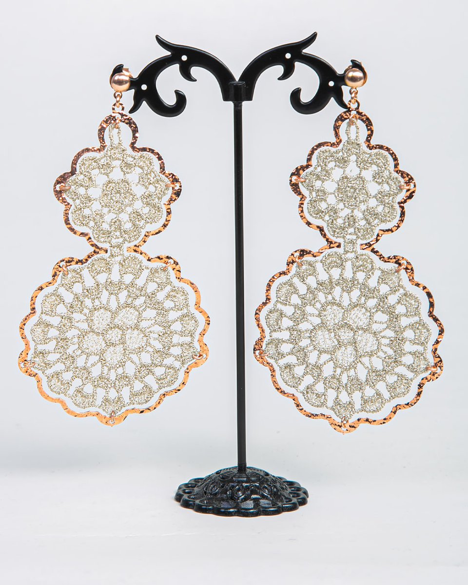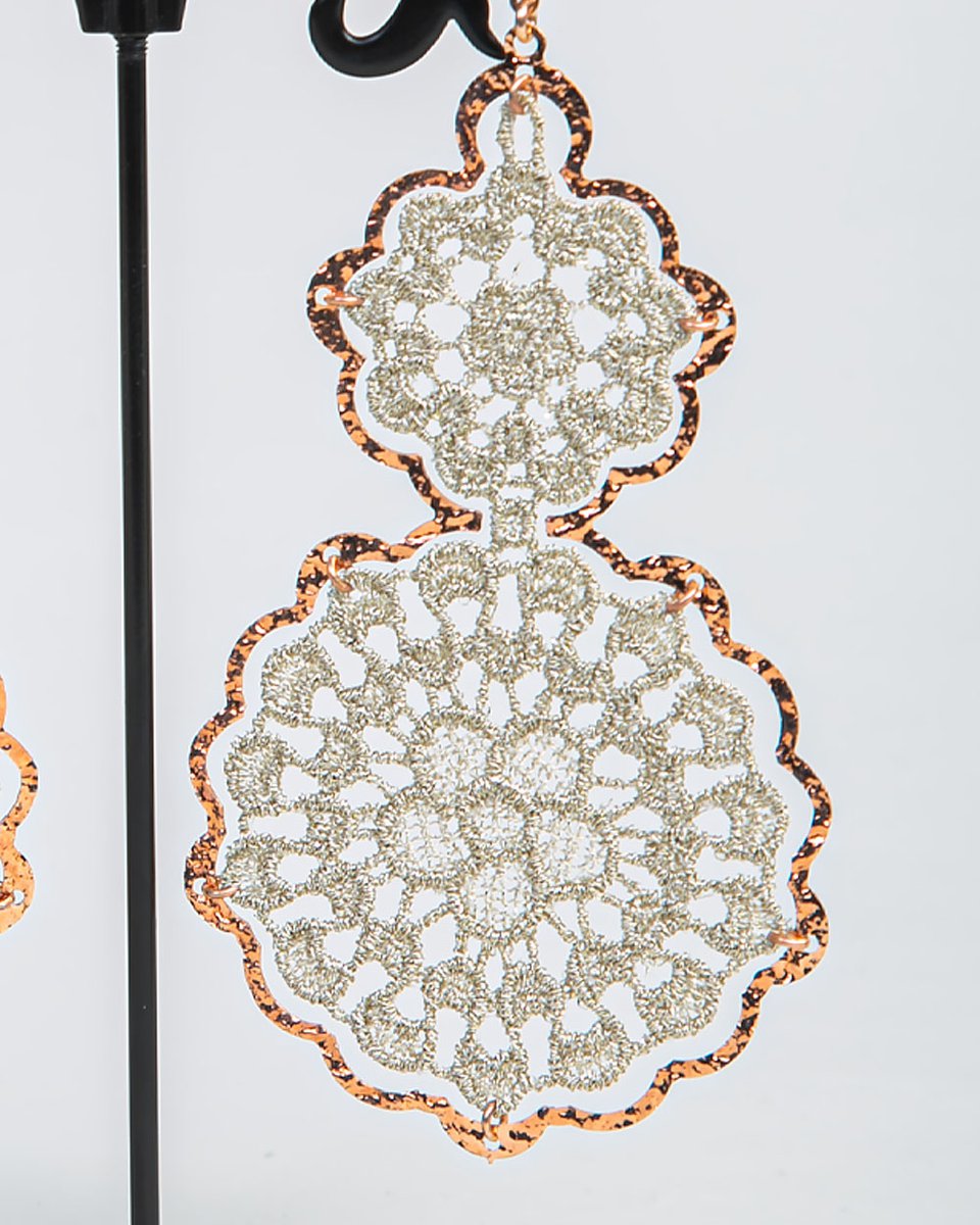 Серьги выполнены из изящного ажурного кружева-макраме, создающего эффект лёгкого, воздушного узора в позолоченном фигурном обрамлении. Швензы изготовлены из медицинского сплава, который безопасен даже для чувствительной кожи, обеспечивая комфорт при длительной носке. Элегантный дизайн добавляет образу тонкую детализацию и романтичное настроение, идеально дополняя как повседневные, так и вечерние образы.