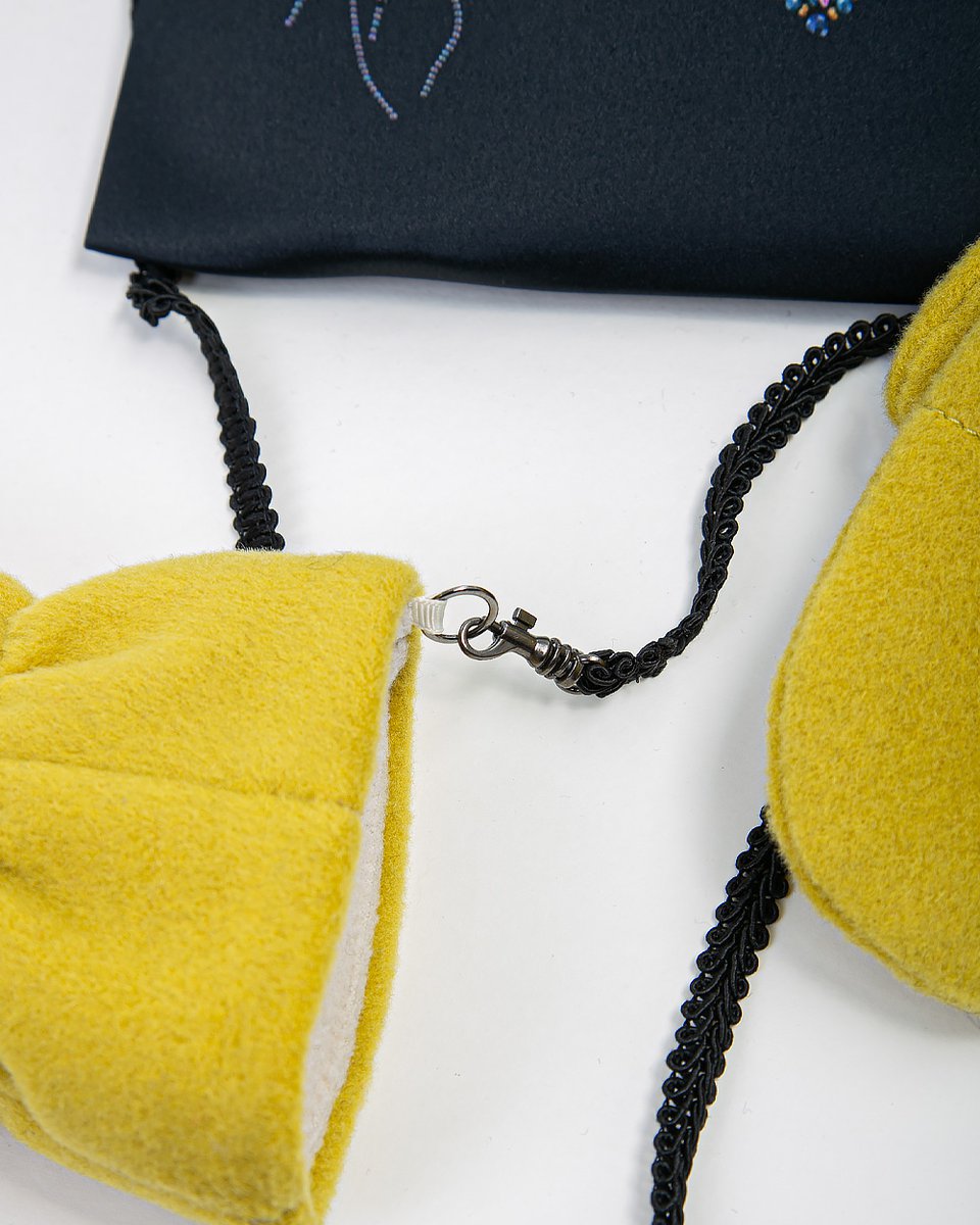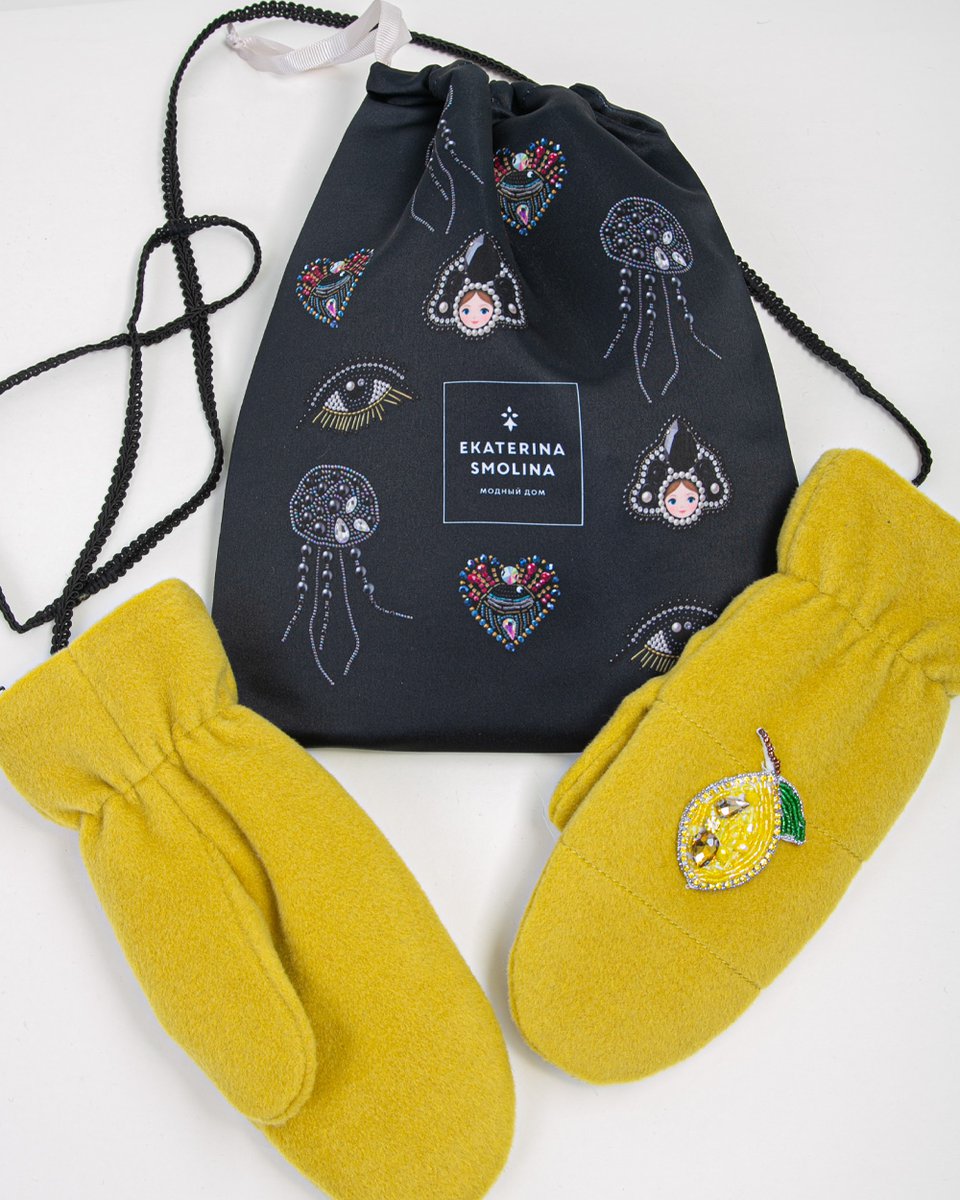 Варежки из шерстяного драпа, превращённые в изысканный аксессуар с помощью фигурной нашивки в виде лимона, украшенной россыпью кристаллов, бусин и бисера. Практичный элемент — съёмная лента, которая крепится к рукавам верхней одежды, чтобы варежки всегда были при вас. Каждая пара упакована в фирменный дизайнерский пыльник, делая её готовым элегантным подарком. Яркий акцент для новогодних образов, который добавит блеска и индивидуальности любому пальто или куртке.