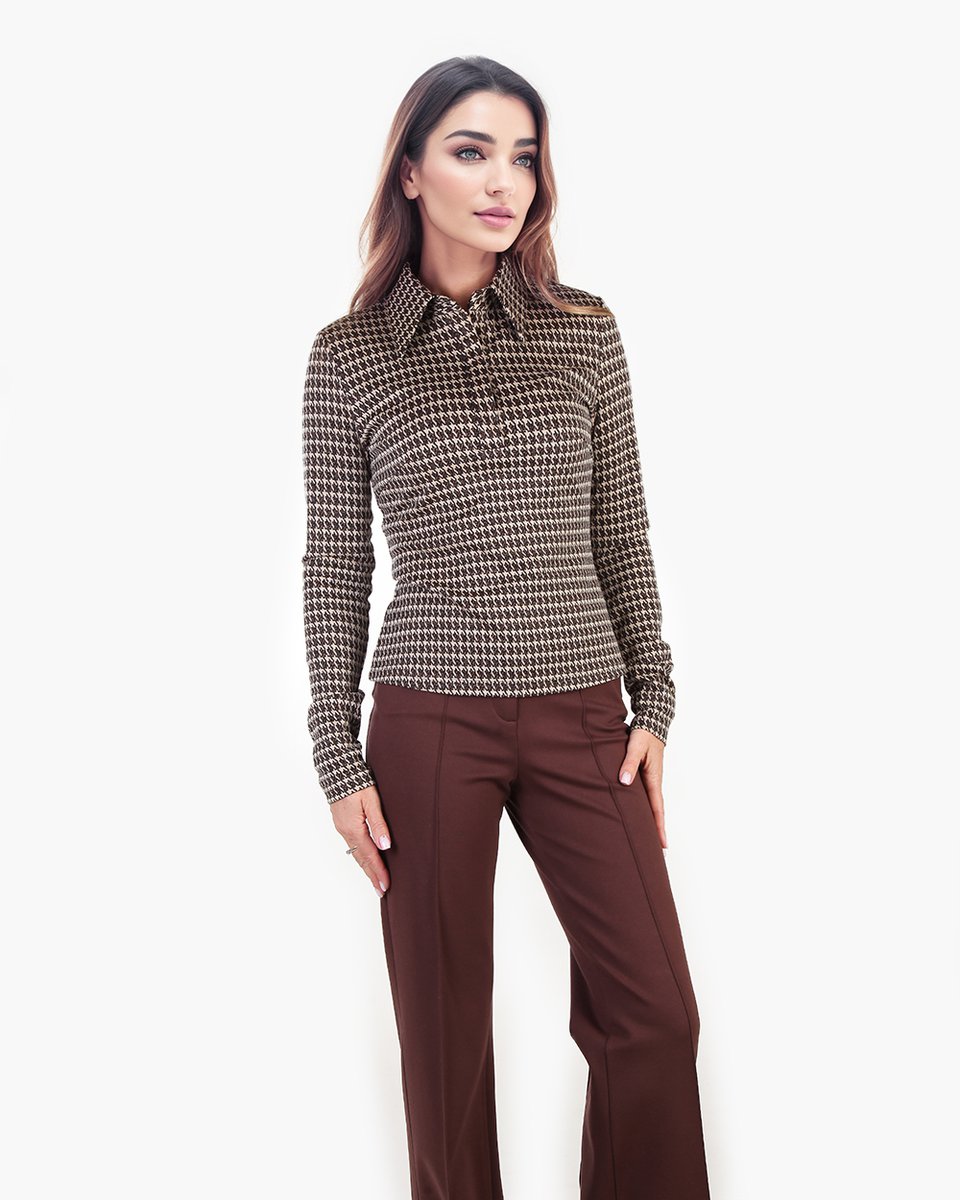 Блуза-лонгслив с застежкой поло из трикотажного жаккарда в мелкий принт “Гусиная лапка” в бежево-шоколадных оттенках. Лаконичная и яркая модель из эластичной, облегающей и приятной тактильно мягкой ткани. Классическая клетка “Гусиная лапка” в теплых оттенках подойдет для деловых образов с костюмами и легко впишется в повседневный гардероб с бланковыми джинсами или юбками.