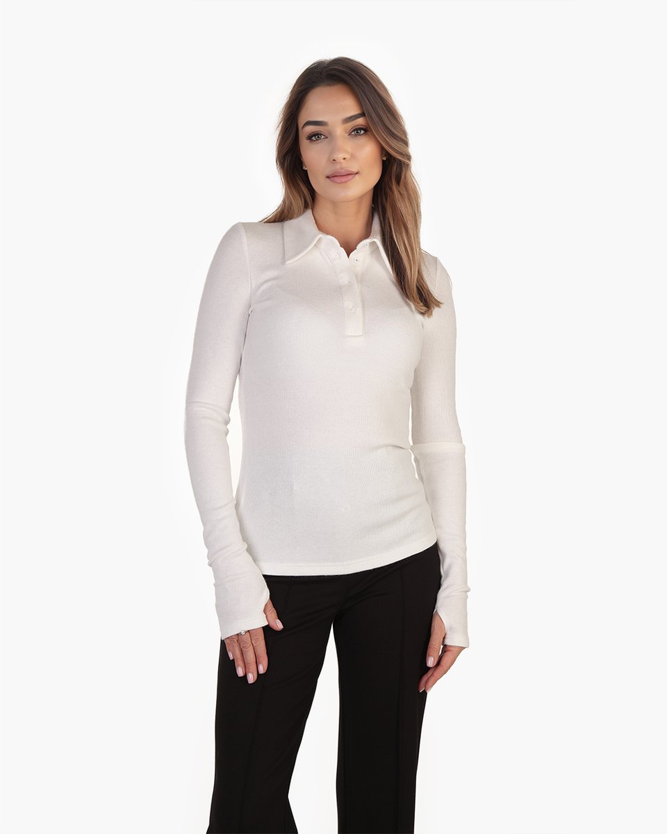 Блуза-лонгслив с застежкой поло из трикотажного жаккарда в мелкий рубчик белоснежного цвета. Базовая модель из эластичной, облегающей и приятной тактильно мягкой вискозы. Лонгслив дополнит деловые обарзы с костюмами, а также повседневный гардероб с бланковыми джинсами, юбками и брюками.