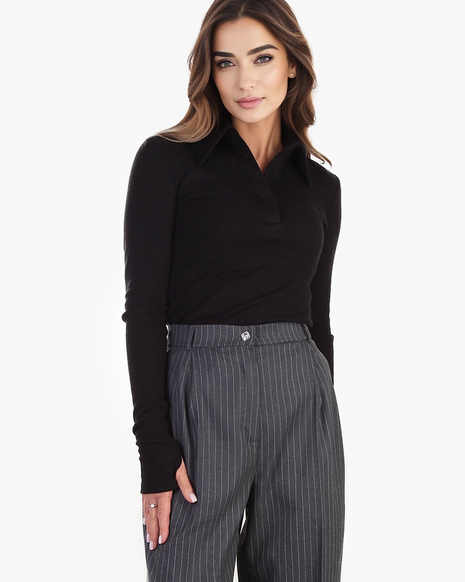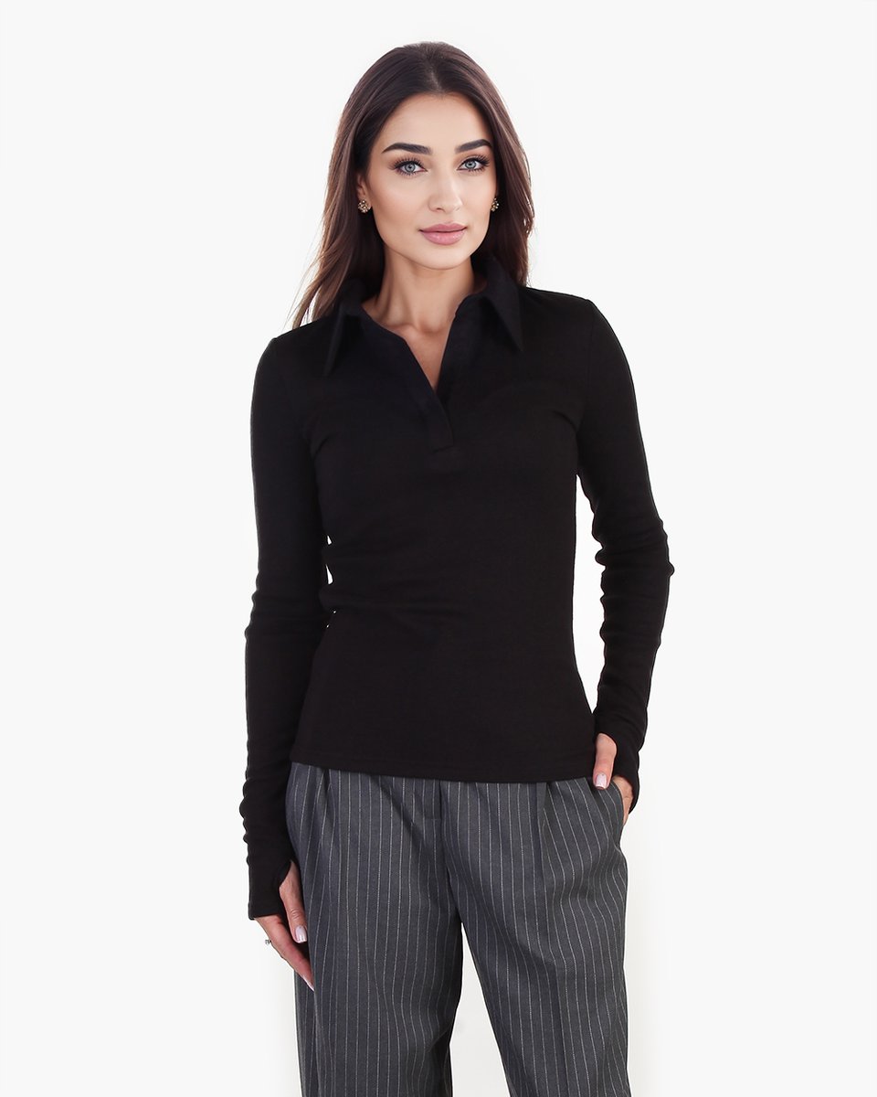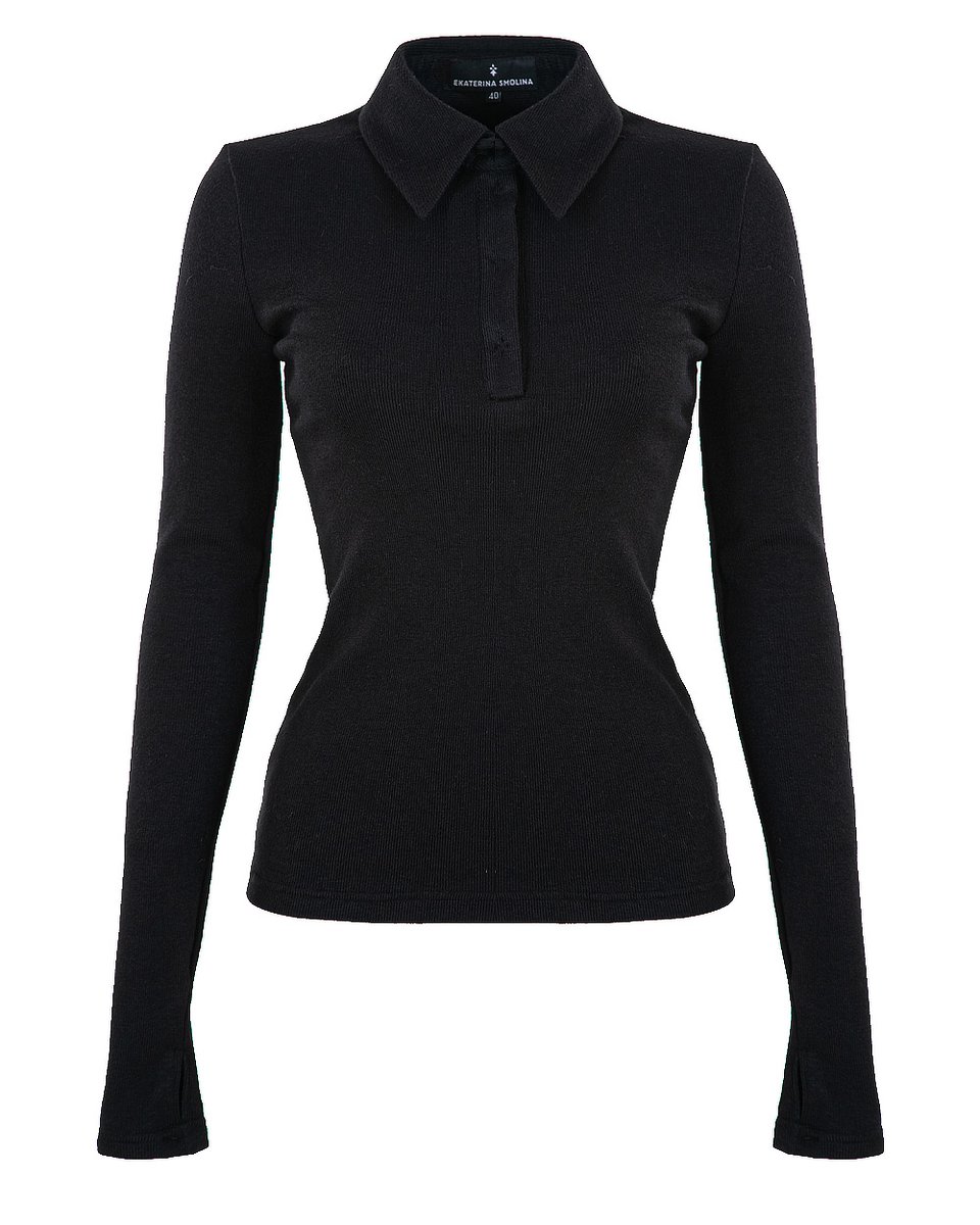 Трикотажная блуза-лонгслив с застежкой поло. Лаконичная модель из эластичной, облегающей и приятной тактильно мягкой ткани в уютный мелкий рубчик. Удлиненные рукава акцентированы митенками на манжетах. Базовая модель в черном цвете активно впишется в ваш гардероб для офисных, повседневных и спортшик образов.