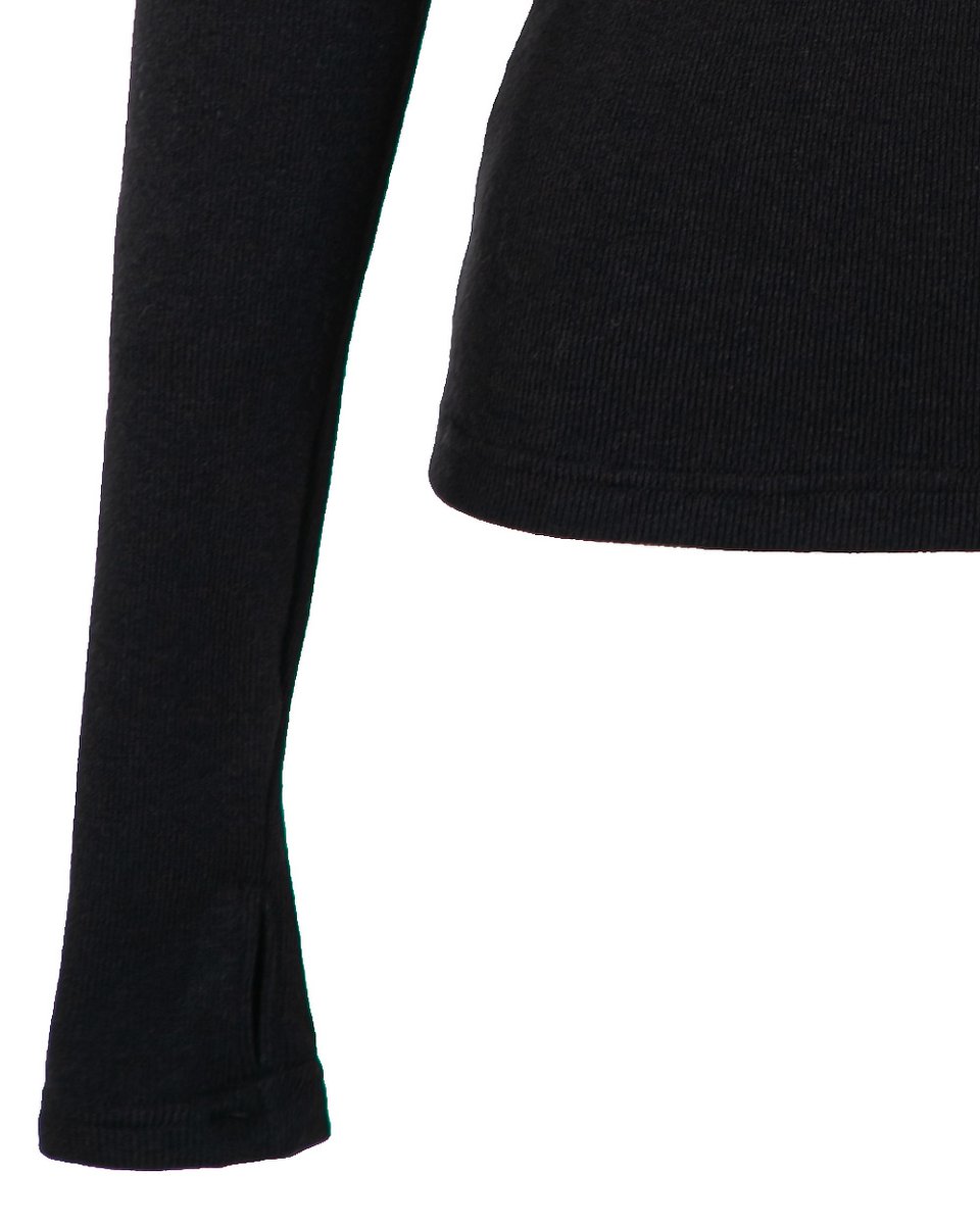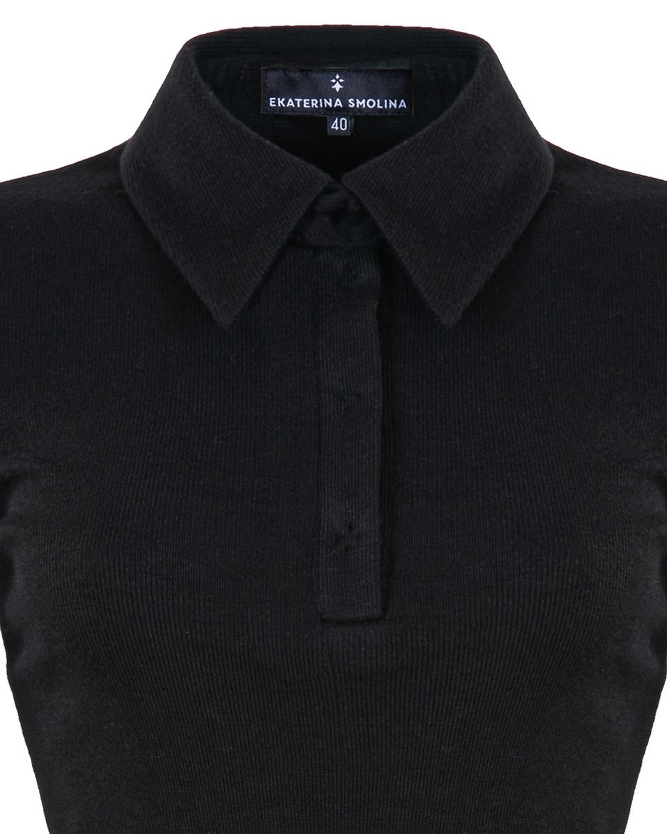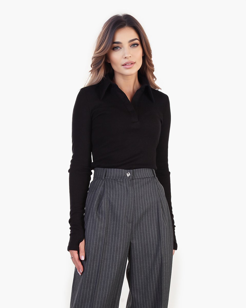 Трикотажная блуза-лонгслив с застежкой поло. Лаконичная модель из эластичной, облегающей и приятной тактильно мягкой ткани в уютный мелкий рубчик. Удлиненные рукава акцентированы митенками на манжетах. Базовая модель в черном цвете активно впишется в ваш гардероб для офисных, повседневных и спортшик образов.