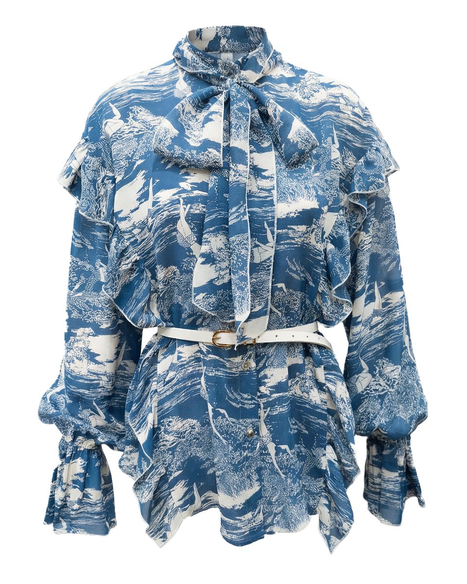 Блуза из легчайшего итальянского шелка с художественным принтом «Купальщицы» — сюжет создает игривое, легкое и романтичное настроение. Невероятно женственная модель свободного кроя с многочисленными рюшами и воланами — они спускаются от плечевого шва до низа, добавляя легкость и движение. Декоративная съемная лента на воротнике-стойке завязывается в бант или ниспадает свободно, меняя настроение образа. Блузу можно носить на выпуск или заправленной, а при желании акцентировать талию кожаным ремешком белого цвета — он уже в комплекте. Модель из лимитированной коллекции итальянской вискозы — каждая вещь существует в ограниченном количестве.