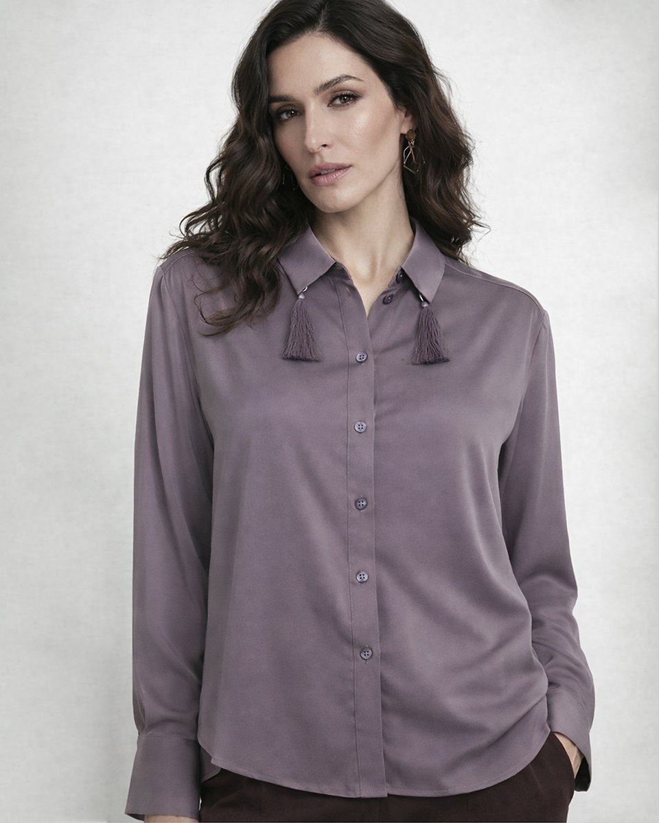 Легкая струящаяся блуза из вискозы с расслабленной посадкой и спущенным плечом. Модель с отложным воротничком и съемными декоративными кисточками — эту деталь можно убрать для более строгого образа или оставить для кокетливого акцента. Приглушенный лиловый оттенок, словно вечерние сумерки, добавляет романтичности. Закругленные разрезы по бокам дают возможность носить блузу навыпуск и добавляют свободы движений. Универсальная база для деловых и повседневных комплектов.