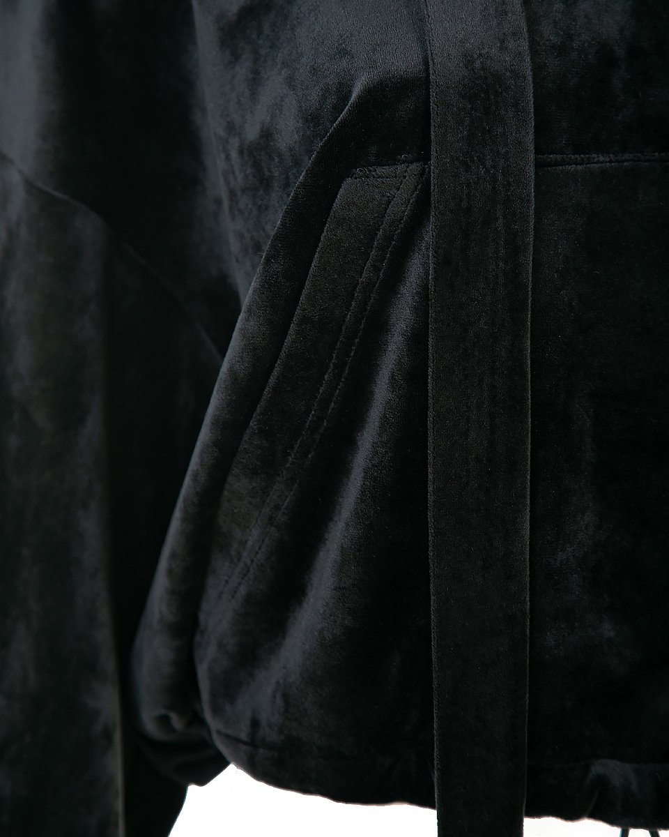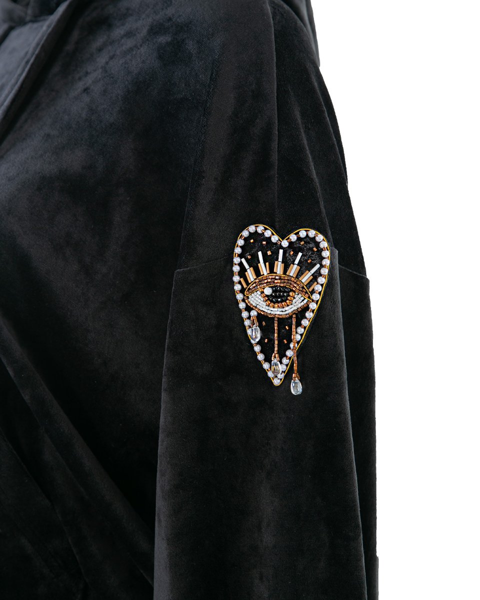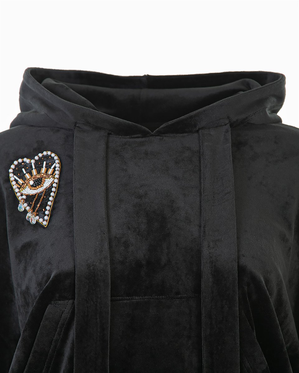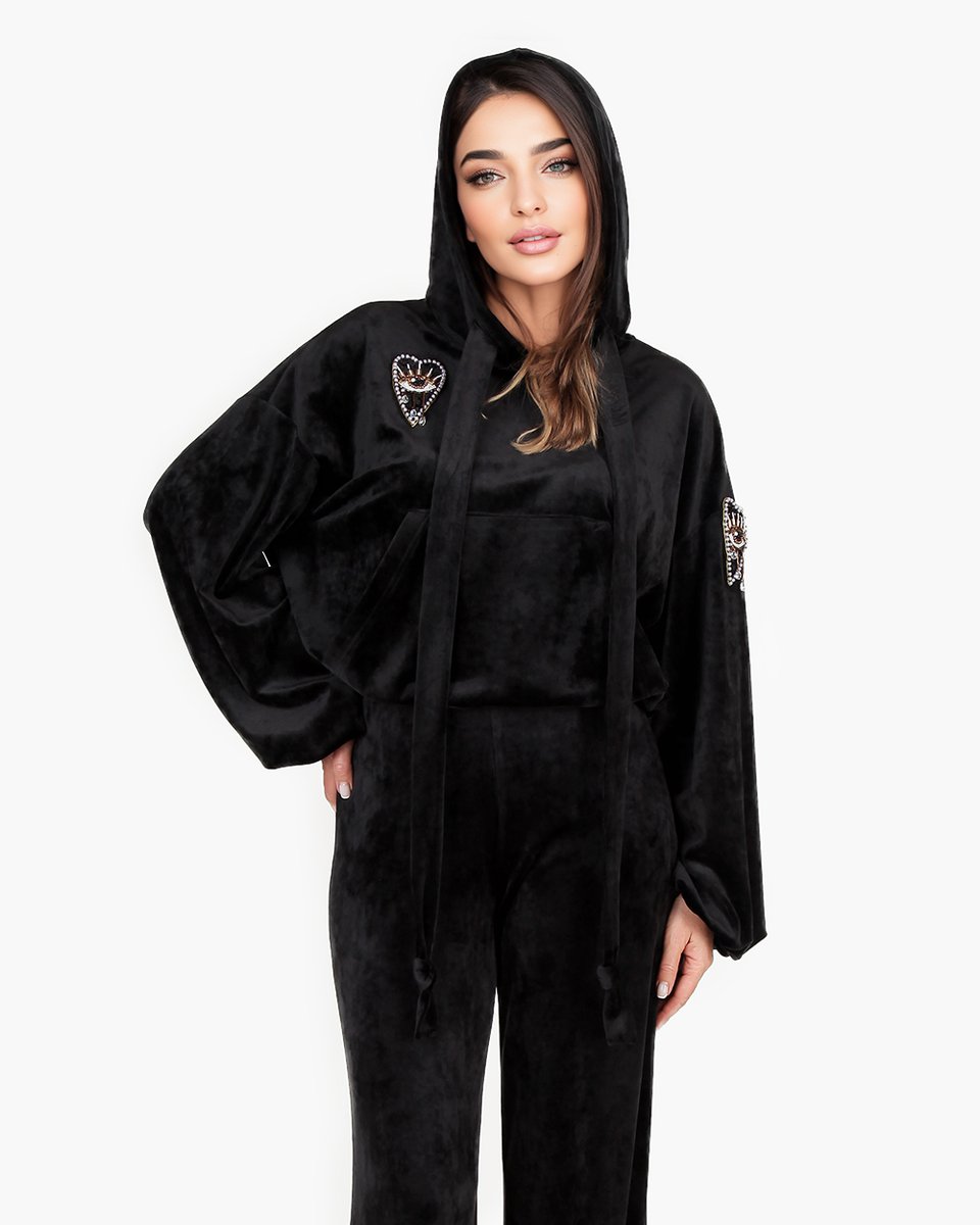Спортшик-костюм из мягчайшего бархата глубокого чёрного оттенка — современная комфортная спортшик классика в нарядном стиле.Идеальный выбор для ценителей тактильной роскоши и уютного шика. Комплект из худи и широких брюк легко трансформируется из повседневного ансамбля для отдыха в элегантный вечерний образ благодаря благородной фактуре ткани. Бархат роскошно сочетается с жемчугом, кристаллами и шёлком, позволяя создать лук для особого случая. При этом костюм практичен: не мнётся, легко ухаживается и сохраняет безупречный вид.