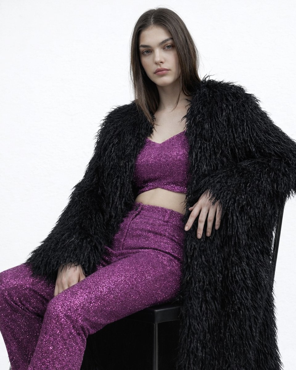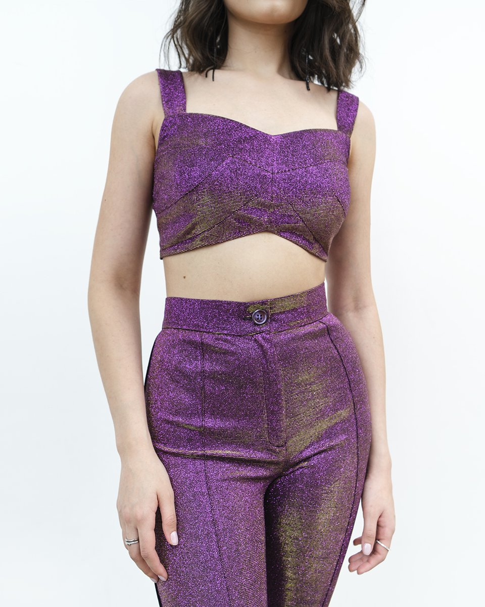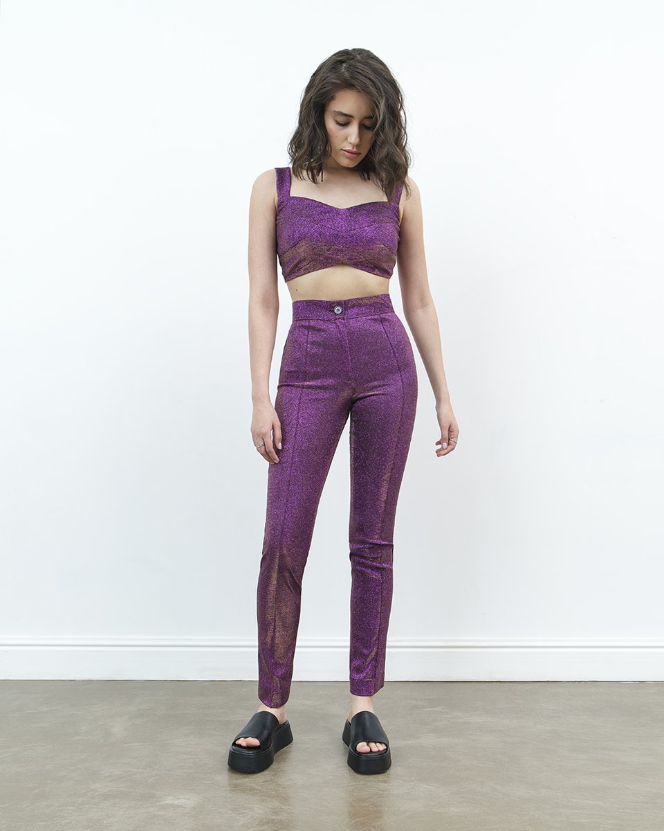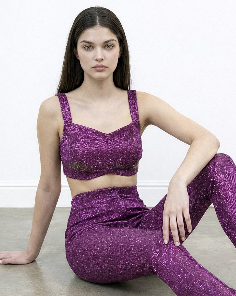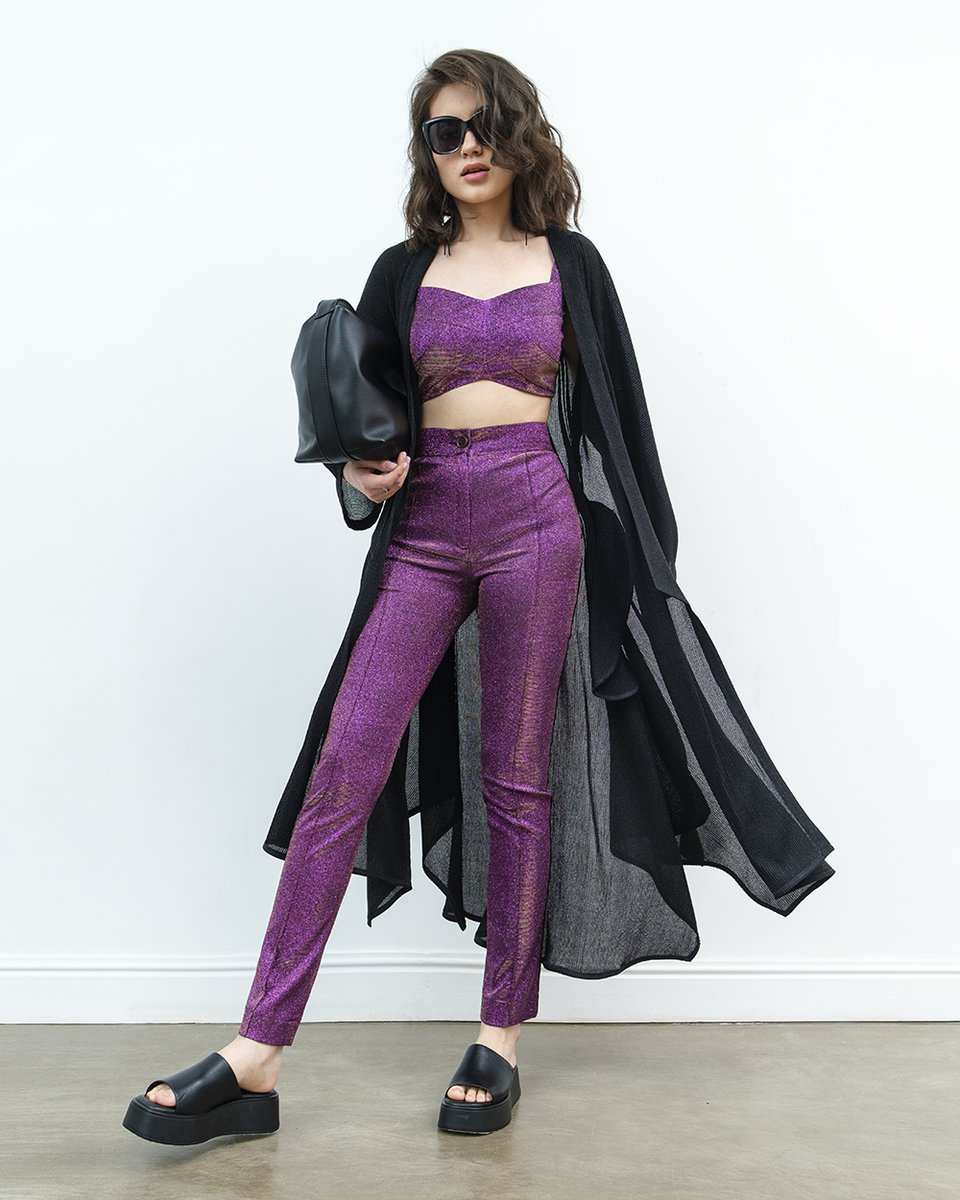 Облегающий кроп-топ с блеском люрекса в розовом цикламеновом цвете. В коллекции представлен в комплекте с облегающими брюками в тон (арт.1926-01). Топ-бра с эффектным декольте и на широких бретелях ярко дополнит классический деловой костюм, превращая его в вечерний акцентный аутфит. А также составит самые нарядные образы на выход для рейвов и вечеринок. Монохромный блестящий цикламеновый комплект мы дополнили черной туникой (арт.1949-02) с легким мерцанием ткани, массивными шлепками на плоском ходу и солнечными очками. Идеально, чтобы без устали танцевать до утра и встречать рассветы.