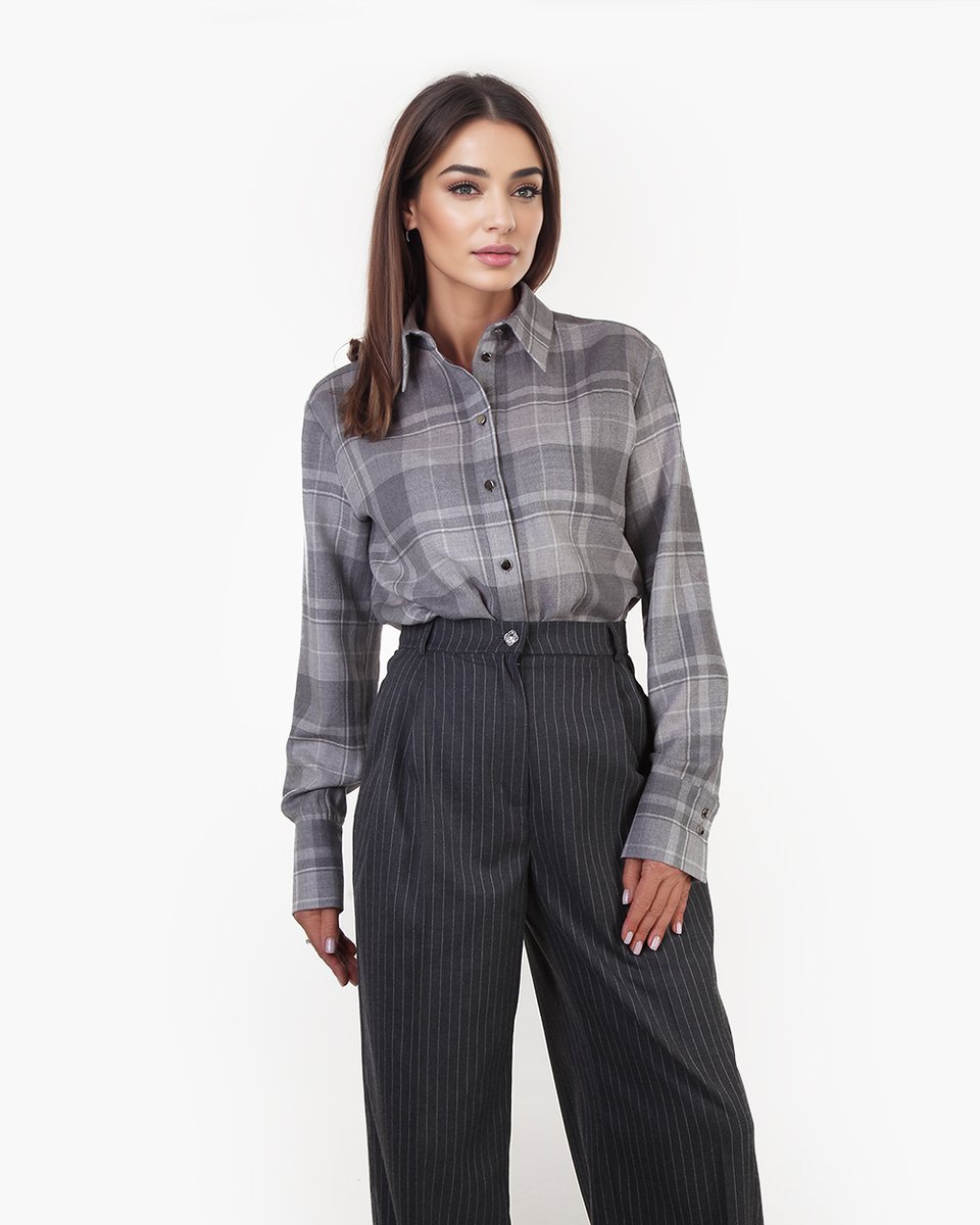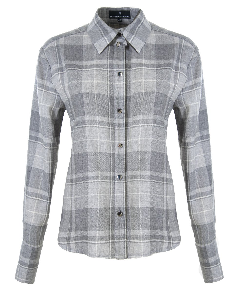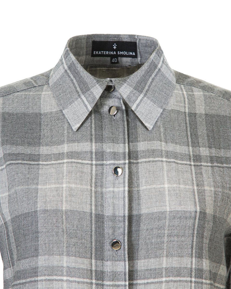 Рубашка в крупную клетку в серых оттенках. Широкий прямой крой, чуть спущенная линия плеча и заложенные складки на спинке создают нужный расслабленный объем модели. Рубашку можно носить самостоятельно или ипользовать как дополнительный слой на футболку, лонгслив и другую рубашку, а также завязывать на поясе. Клетку в нескольких серых оттенках акцентиует фурнитура - маленькие металлические серебряные пуговички. Яркая и одновременно базовая рубашка станет деликатным акцентом вашего повседневного casual гардероба.