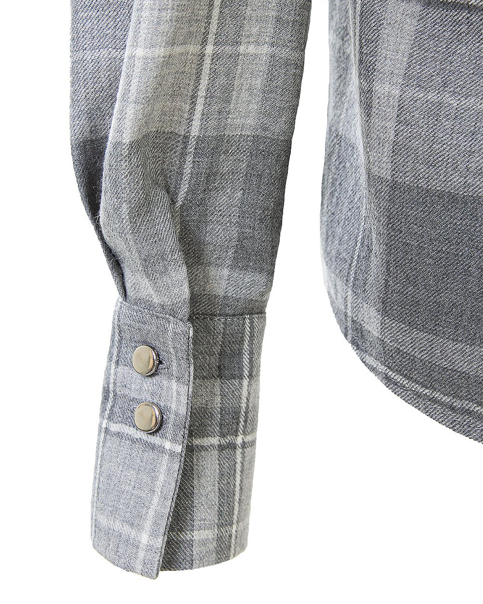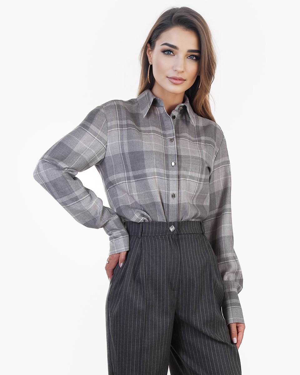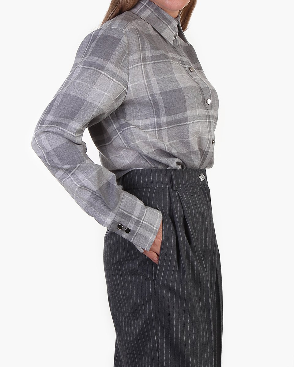 Рубашка в крупную клетку в серых оттенках. Широкий прямой крой, чуть спущенная линия плеча и заложенные складки на спинке создают нужный расслабленный объем модели. Рубашку можно носить самостоятельно или ипользовать как дополнительный слой на футболку, лонгслив и другую рубашку, а также завязывать на поясе. Клетку в нескольких серых оттенках акцентиует фурнитура - маленькие металлические серебряные пуговички. Яркая и одновременно базовая рубашка станет деликатным акцентом вашего повседневного casual гардероба.