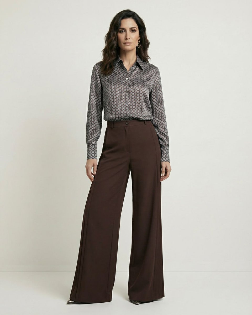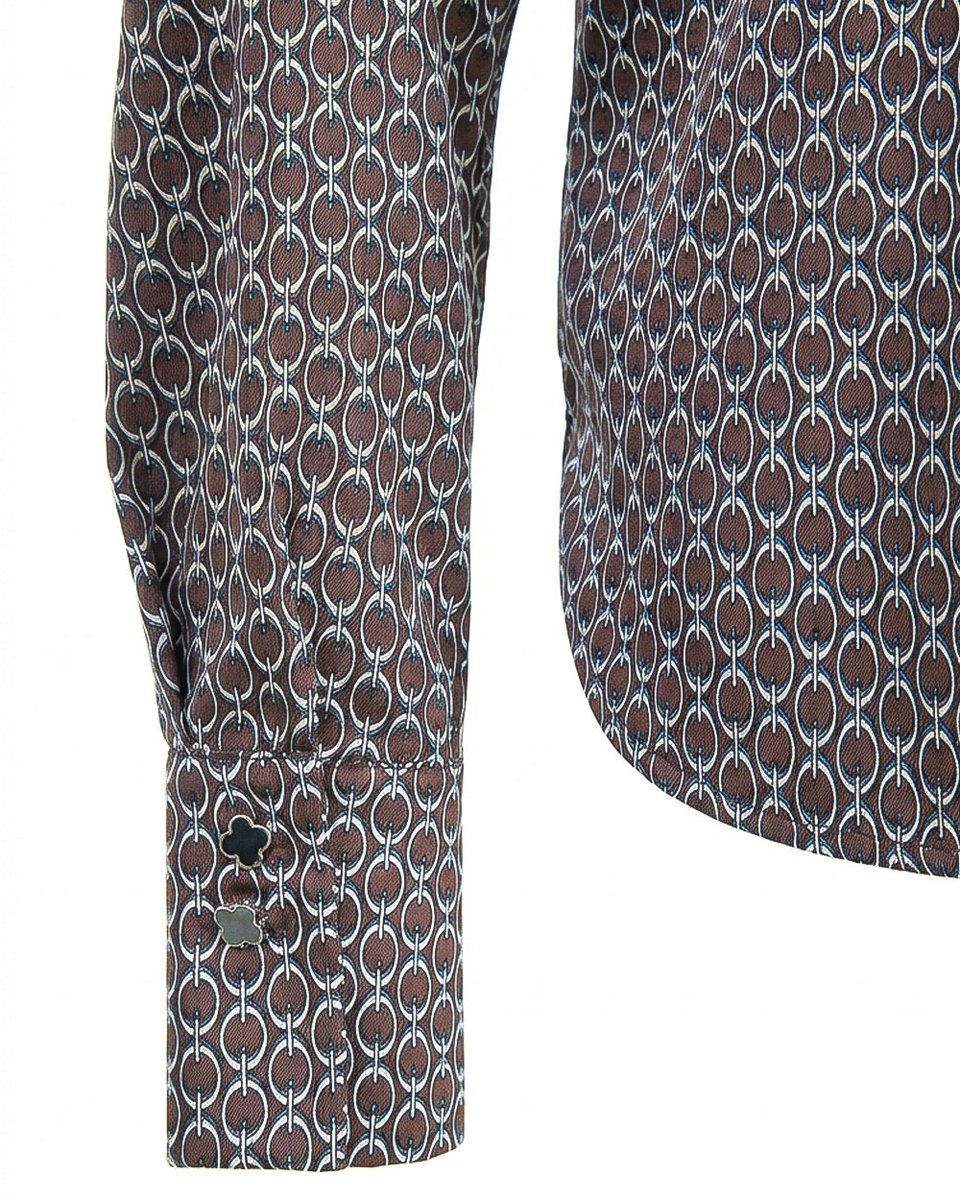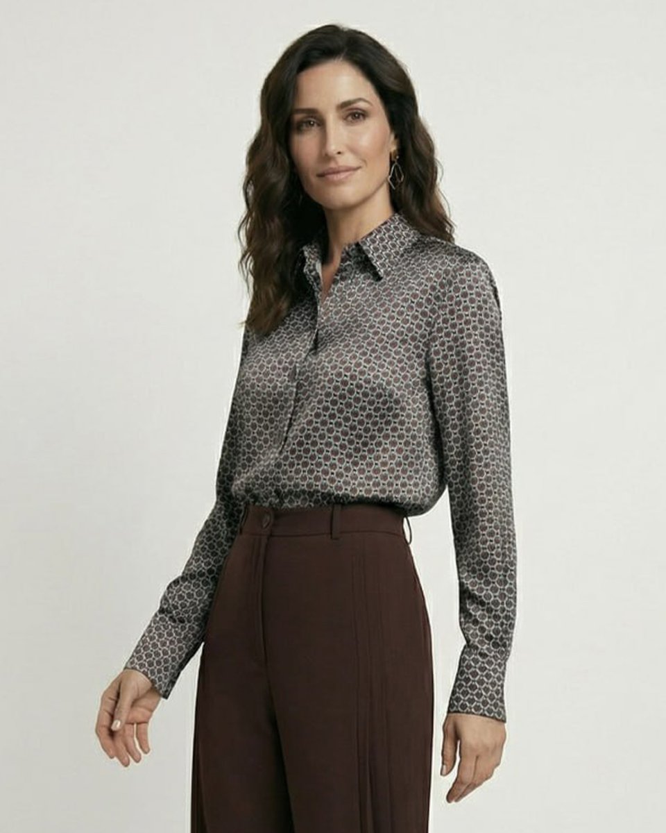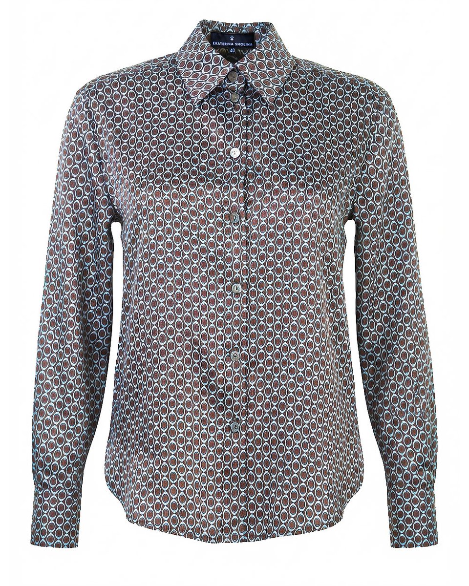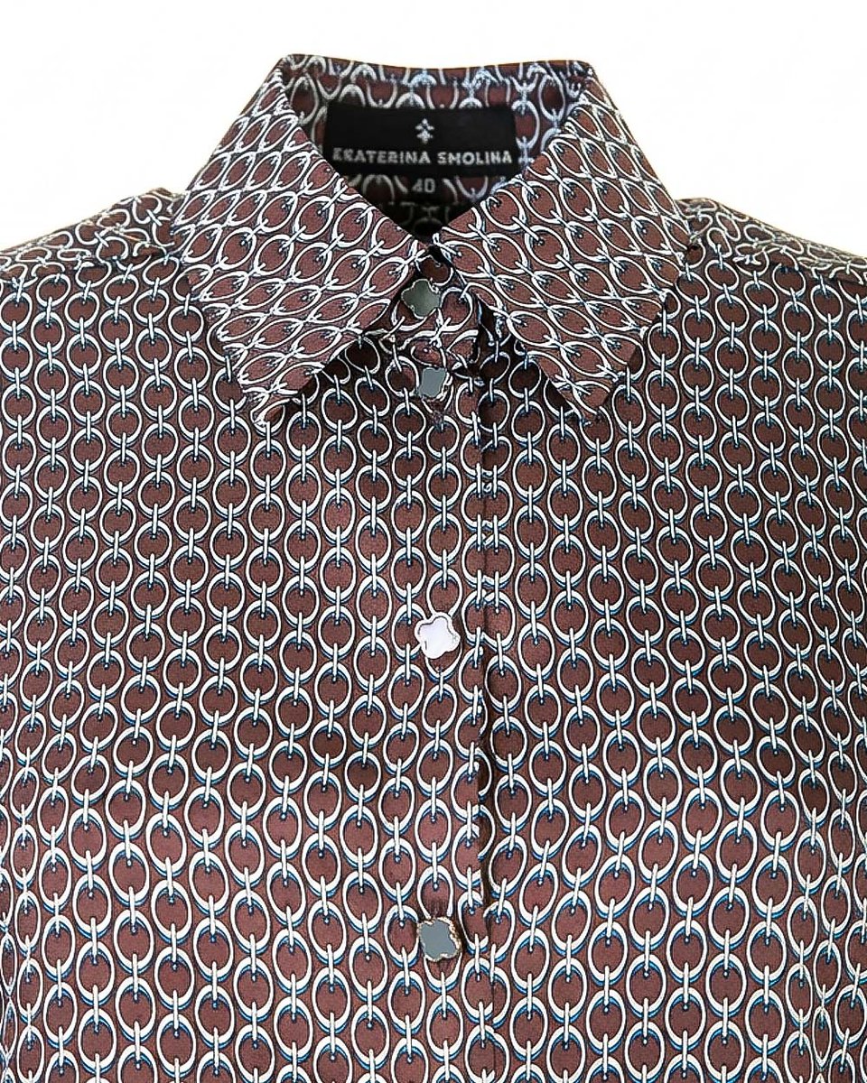 Легкая блуза прямого классического кроя. Акцент модели – мелкий геометричный принт в виде колечек цепи в свежем сочетании оттенков мяты и шоколада. Активная графика добавляет образу ритм и характер, не перегружая силуэт. Универсальная модель для офиса и повседневных образов, которая легко комбинируется с однотонными брюками, юбками или денимом.