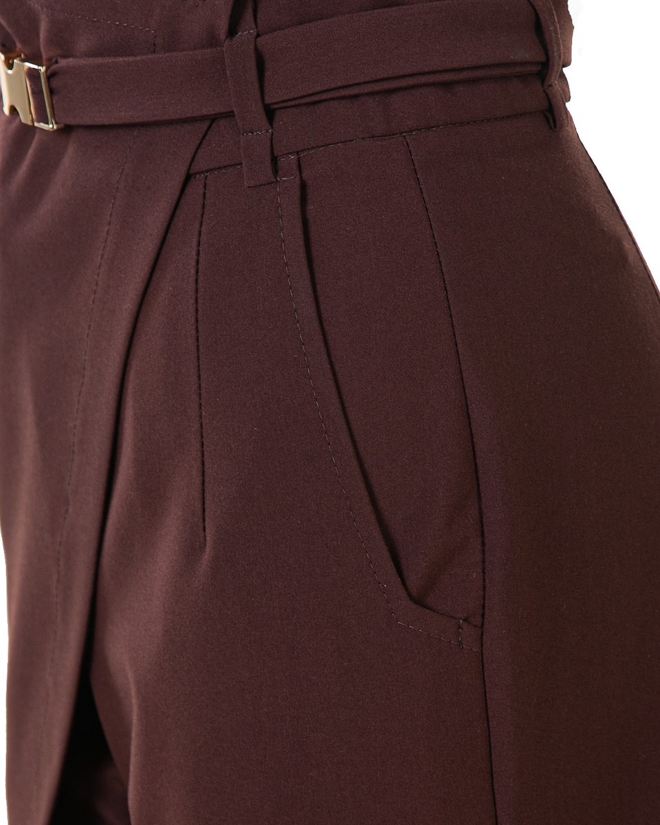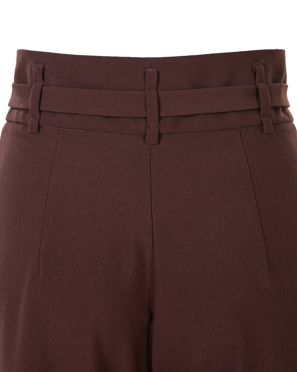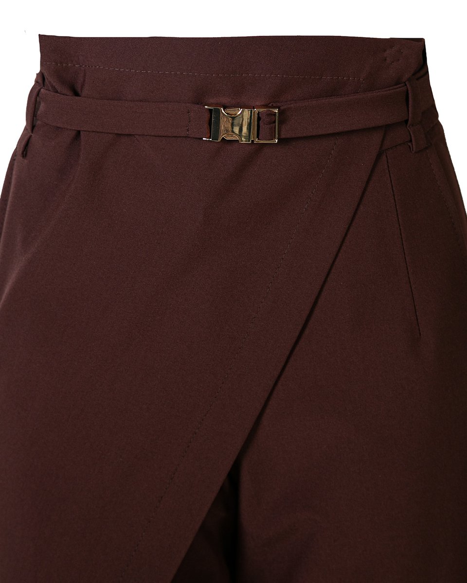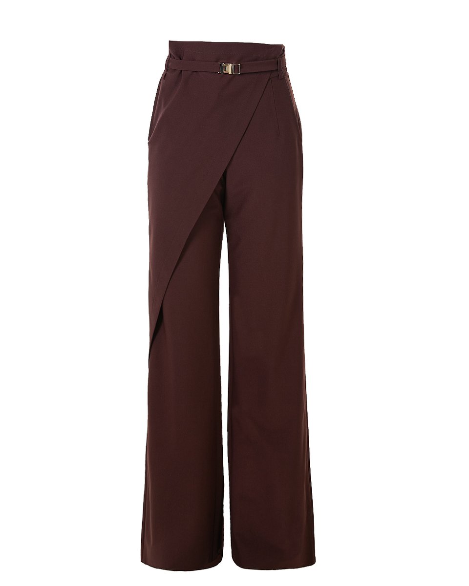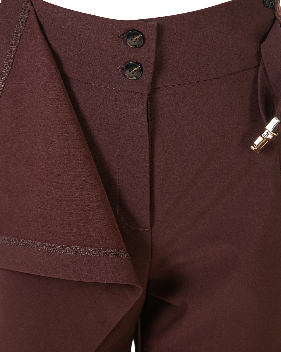 Многослойные брюки-клеш шоколадного цвета со стрелками и асимметричной полубаской. Баска не съемная и притачена к поясу с правой стороны, образуя асимметричную мини-юбку. Модель дополнена тонким поясом с металлической пряжкой фастекс. Эти детали делают классические брюки акцентными в рамках делового гардероба и подчеркивают индивидуальный стиль. Носим с сорочками и струящимися блузами или трикотажем.