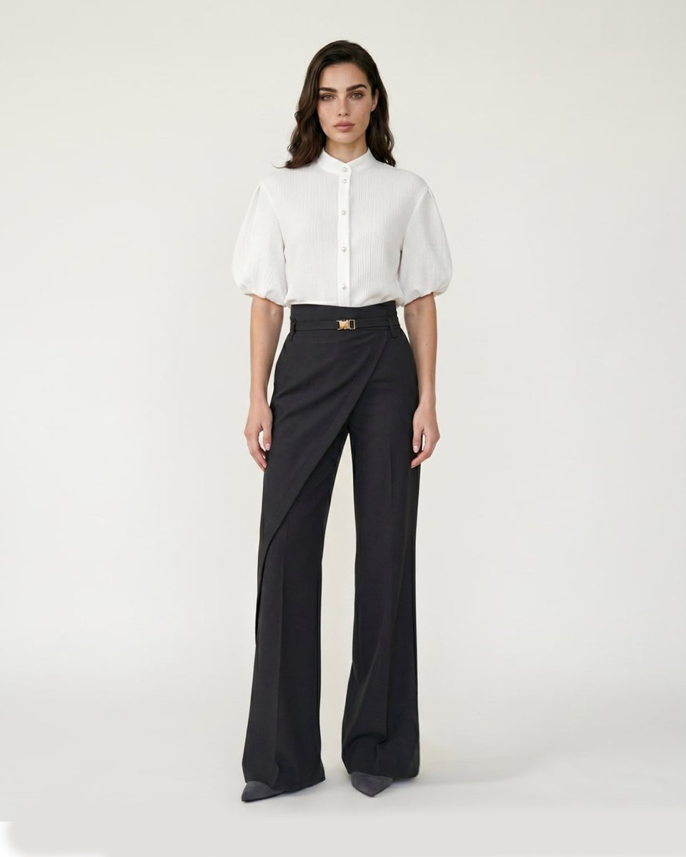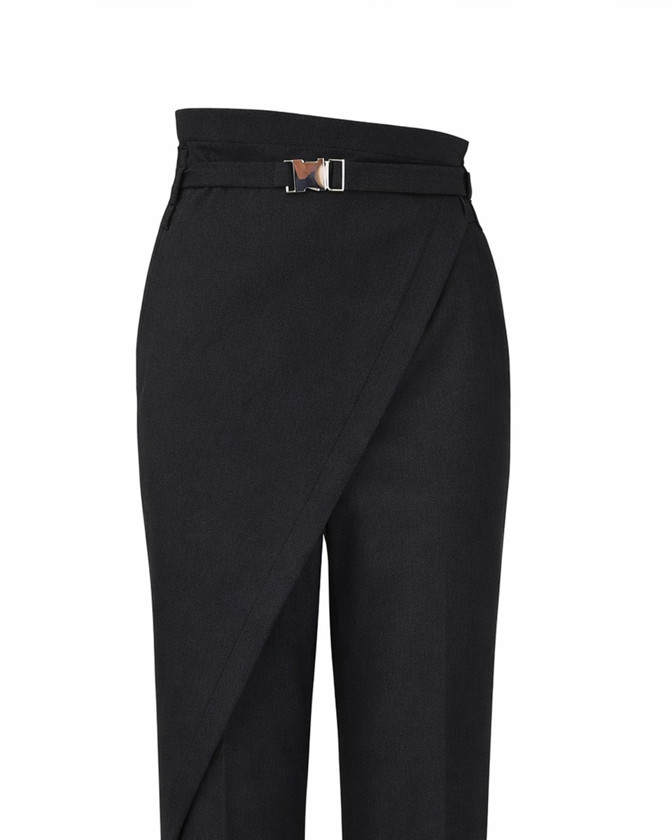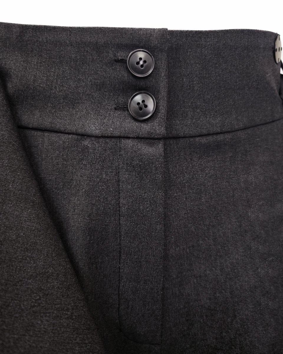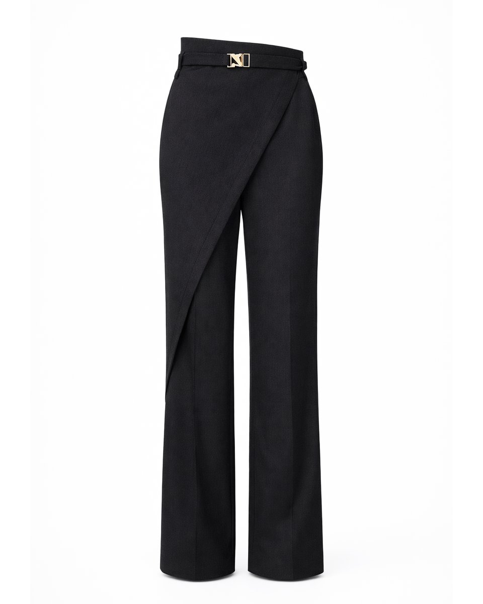 Многослойные брюки-клеш с асимметричной полубаской. Баска не съемная и притачена к поясу с правой стороны, образуя асимметричную мини-юбку. Модель дополнена тонким поясом с металлической пряжкой фастекс. Эти детали делают классические брюки акцентными в рамках делового гардероба и подчеркивают индивидуальный стиль. Брюки темно-серого цвета подойдут для деловых и smart-casual образов.