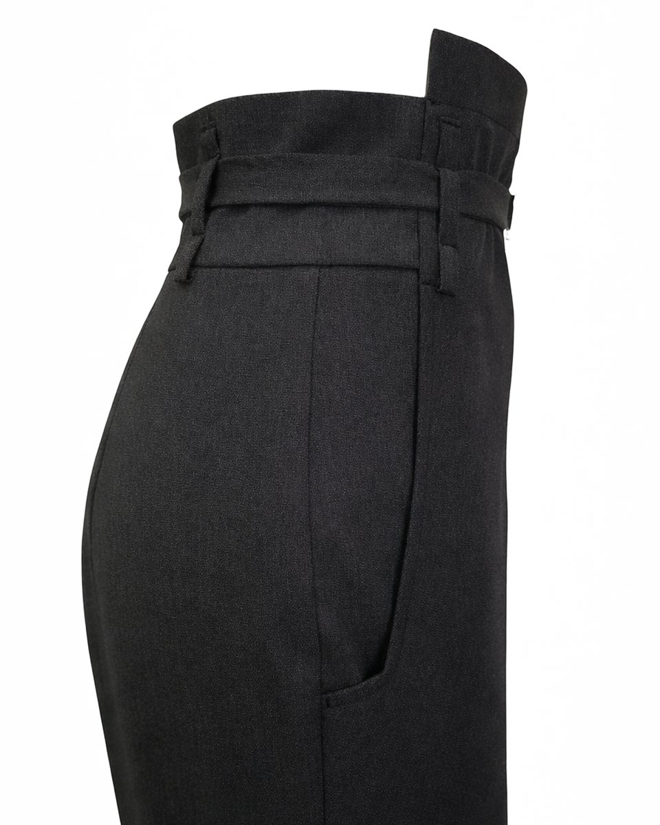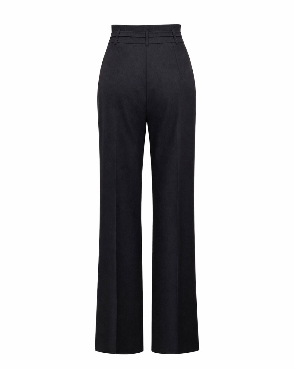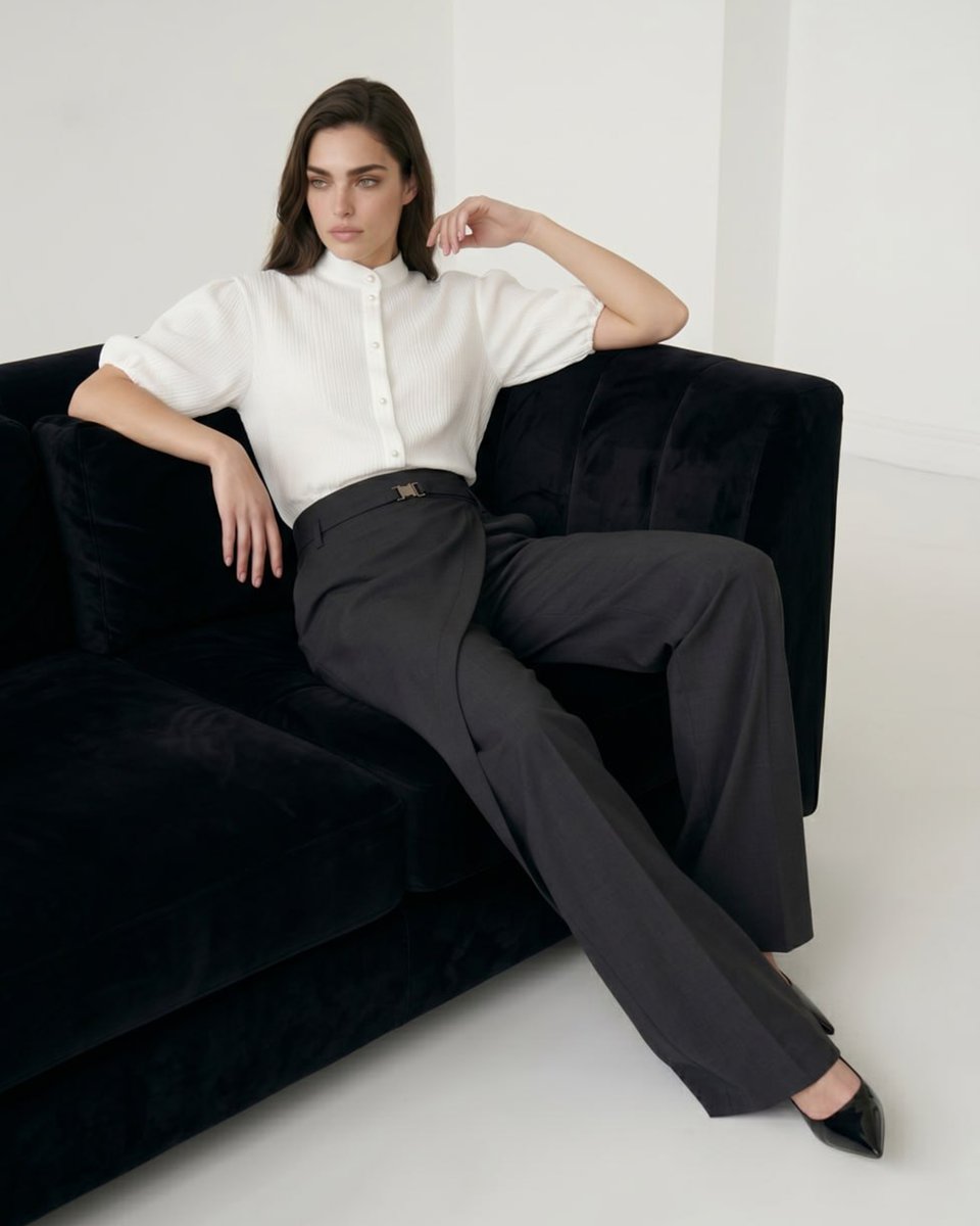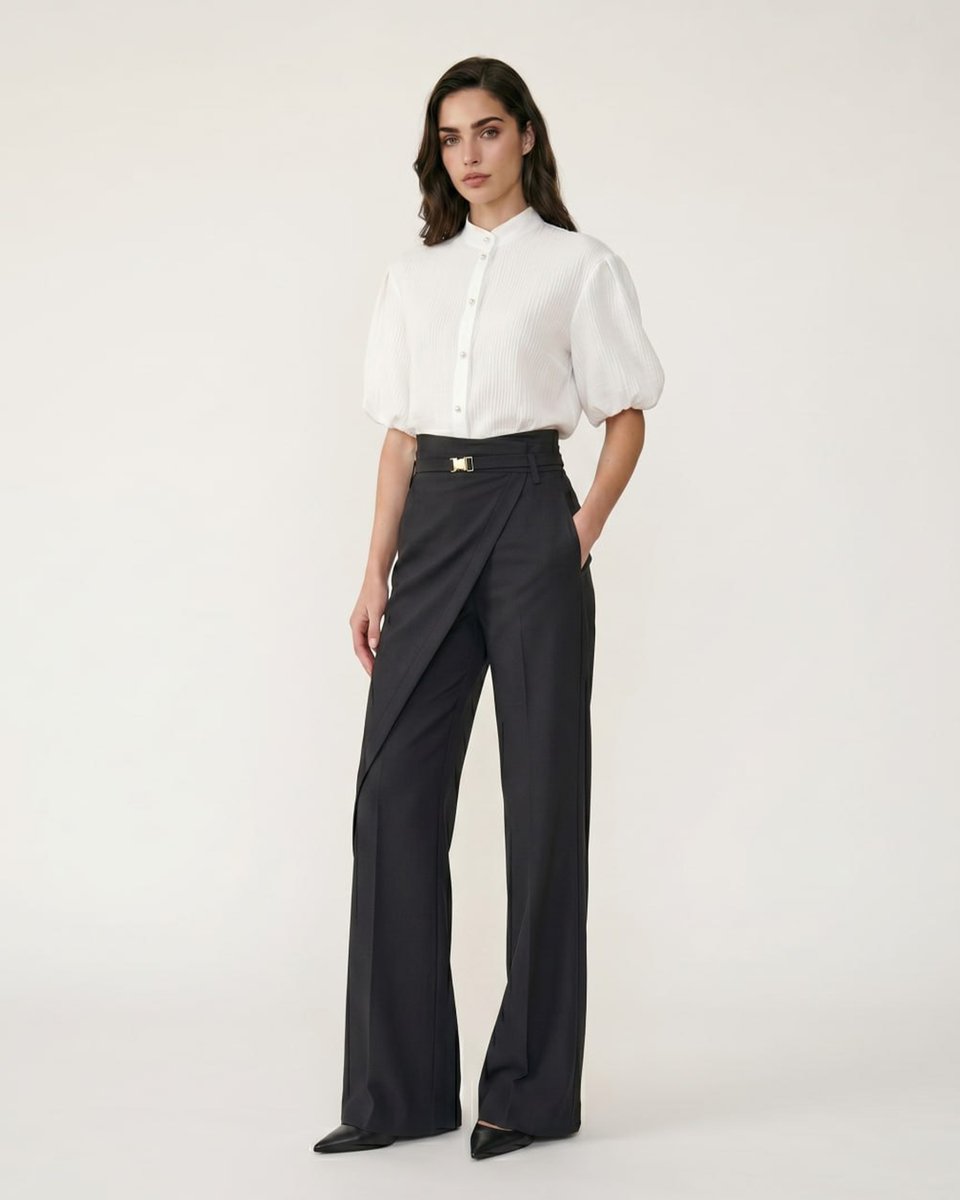 Многослойные брюки-клеш с асимметричной полубаской. Баска не съемная и притачена к поясу с правой стороны, образуя асимметричную мини-юбку. Модель дополнена тонким поясом с металлической пряжкой фастекс. Эти детали делают классические брюки акцентными в рамках делового гардероба и подчеркивают индивидуальный стиль. Брюки темно-серого цвета подойдут для деловых и smart-casual образов.