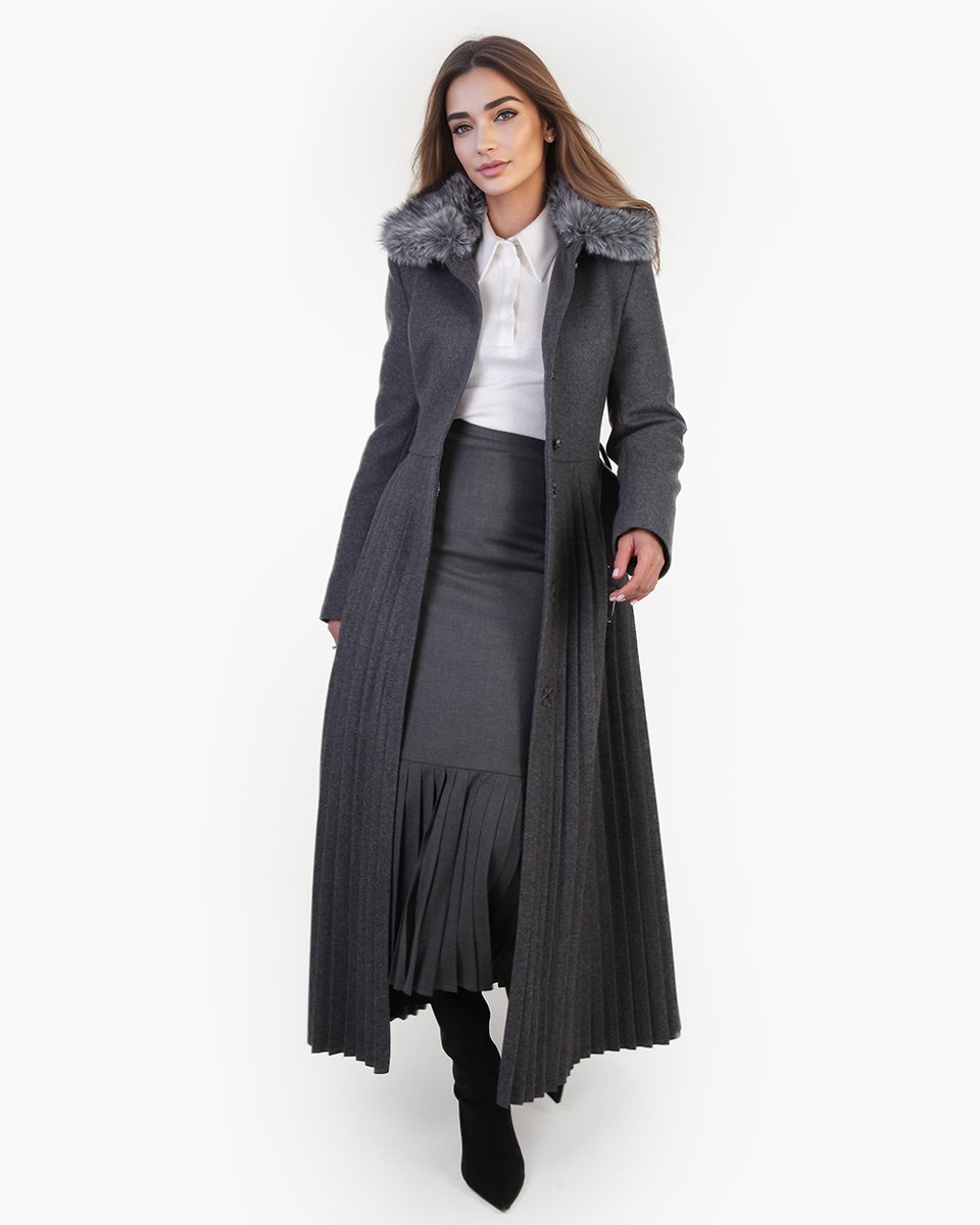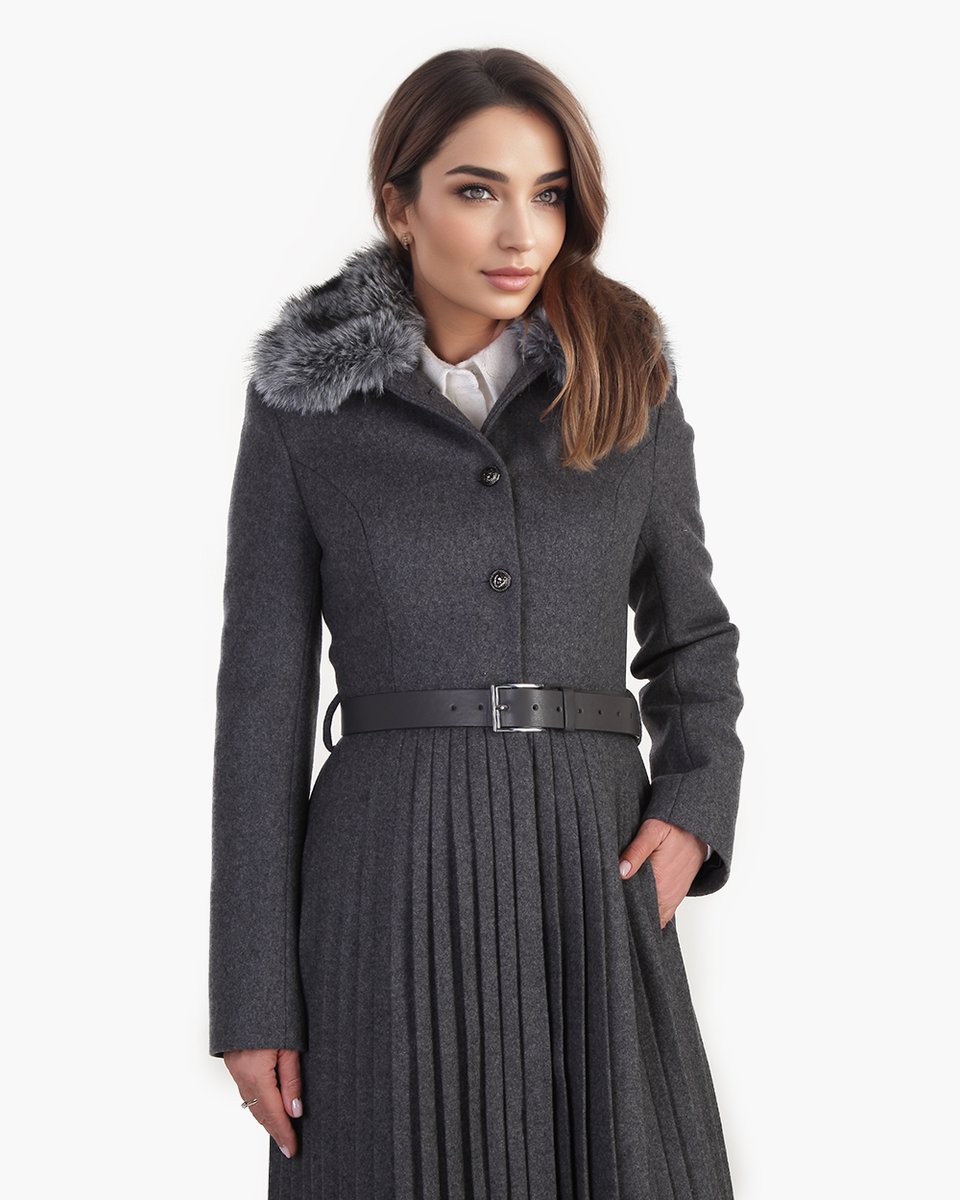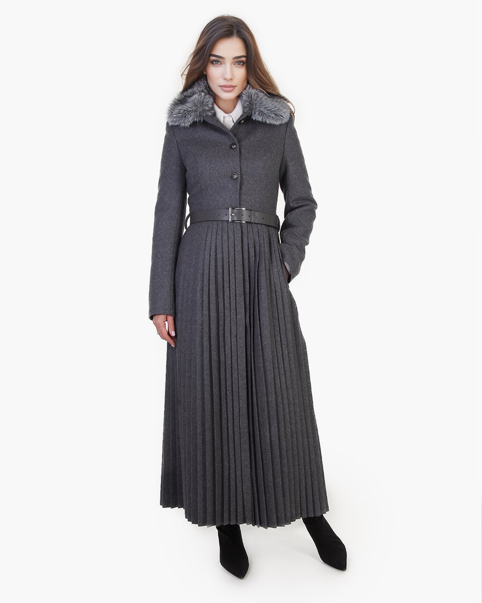 Бестселлер линии “Пальто как платье” длины макси дымчатого цвета. Пальто из плотного драпа со скульптурным кроем, что делает посадку изящной и утонченной. И с пышной юбкой макси длины в структурные складки-плиссе. Пальто с отложным воротничком, а также съемным воротником из эко-меха в цвете светлой дымки. Талию акцентирует ремень из эко-кожи в тон пальто со стальной пряжкой. Сезонность: осень, зима.
