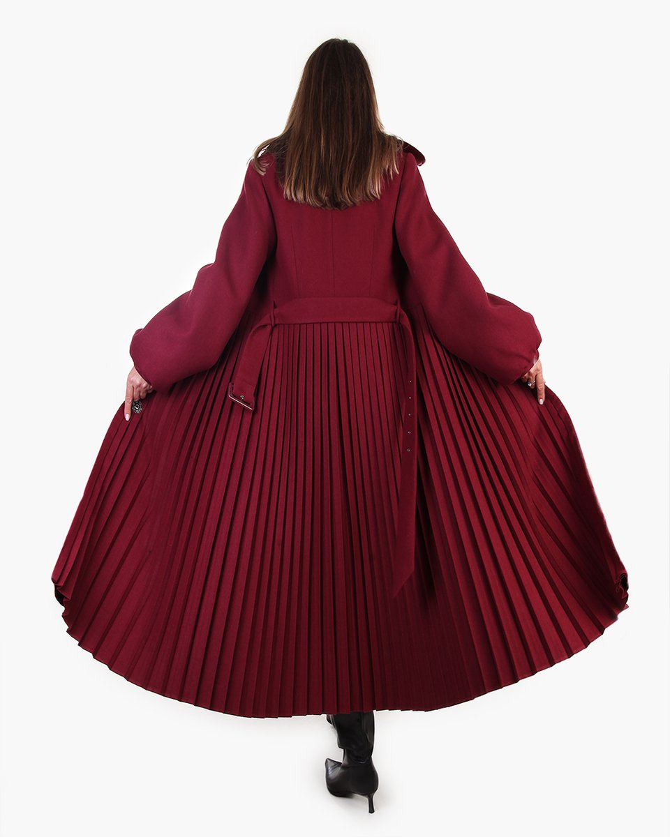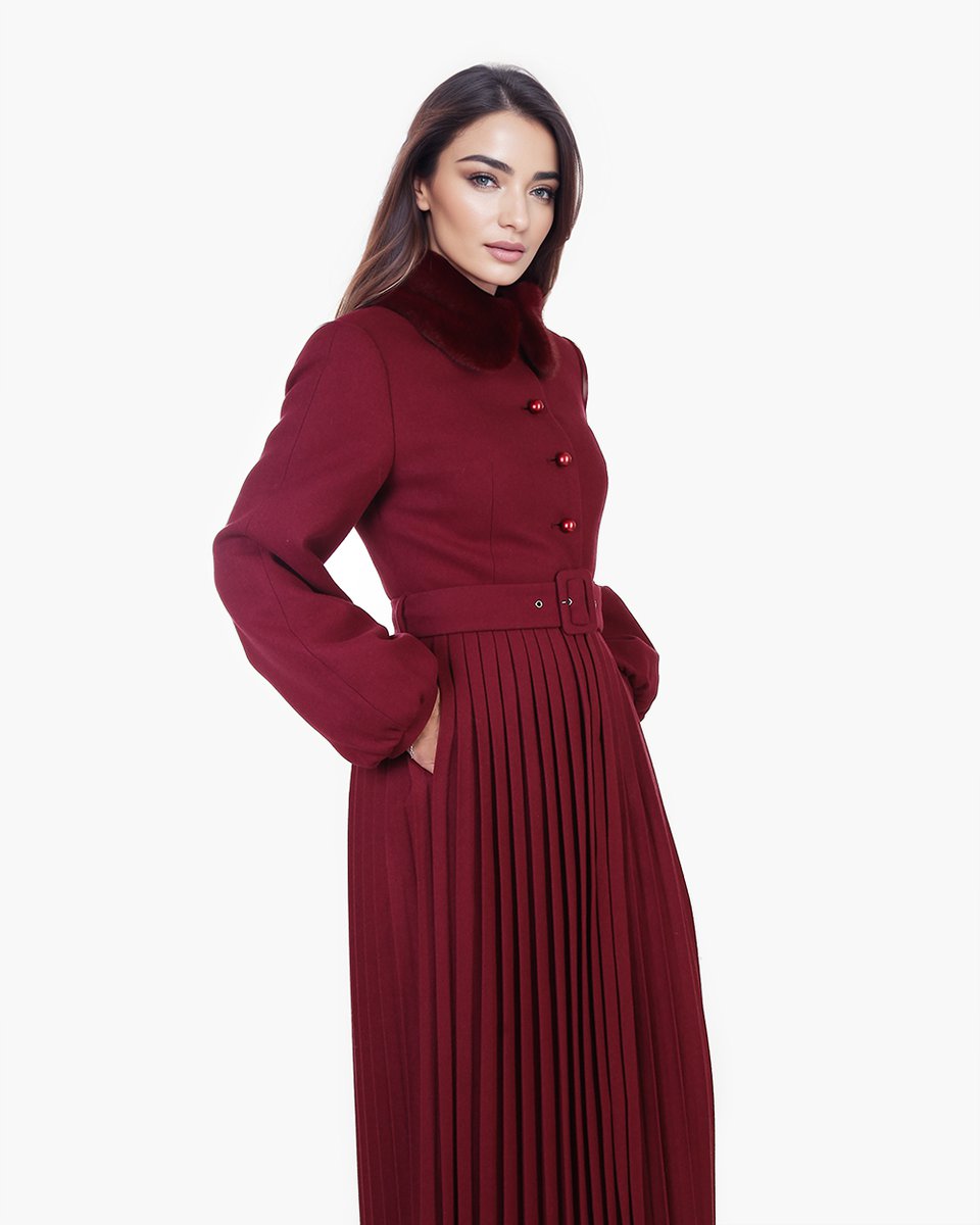 Бестселлер линии “Пальто как платье” длины макси в цвете спелой брусники. Приталенное пальто из плотного драпа с макси юбкой-плиссе по отрезной линии талии и с пышными рукавами со сборками на манжетах, что делает образ изящным и изысканным. Верхняя часть изделия застегивается на пуговицы под горло, плотно закрывая грудь. Пуговицы-бусины в тон пальто с перламутровым блеском, который деликатно акцентирует монохромный образ. А юбка застегивается на потайные кнопки. Пальто со съемным отложным воротничком из эко-меха в тон. В комплекте к пальто идет текстильный ремень с обтяжной пряжкой в тон. Сезонность: осень, зима.