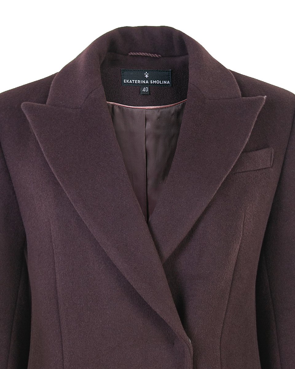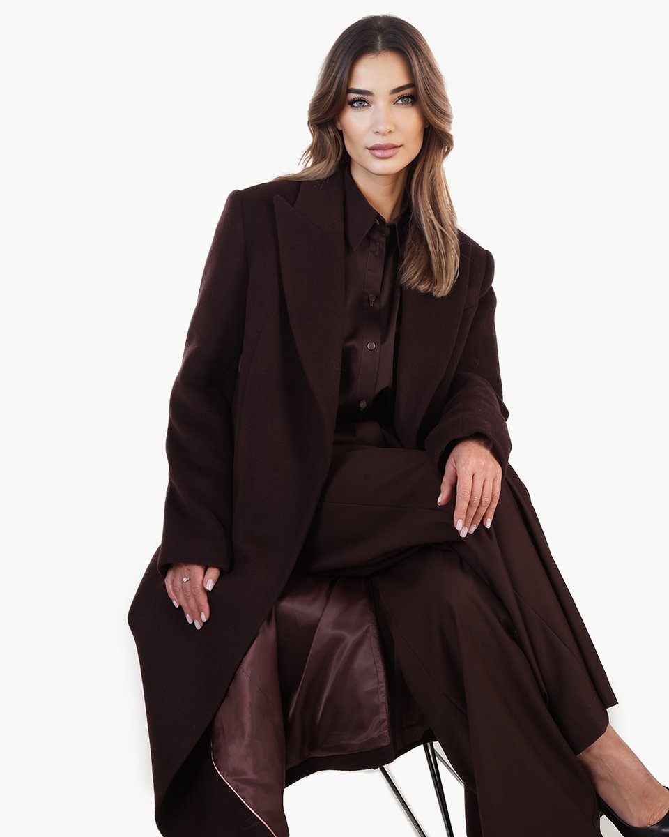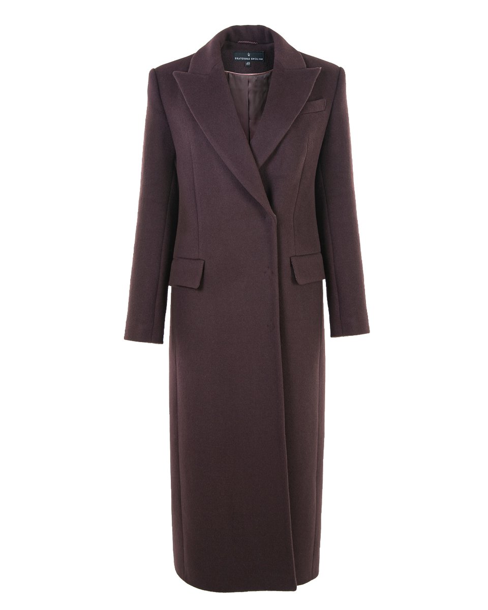 Пальто классического прямого кроя с английским воротником. Базовая модель с острой линией плеч и посадкой по фигуре в длине миди. В более мягком чем черном, но также базовом и трендовом благородном оттенке горького шоколада пальто станет уверенной основой вашего верхнего гардероба на осень и зиму. Строгая и лаконичная модель подойдет и к деловым костюмам, и к уютным трикотажным образам.