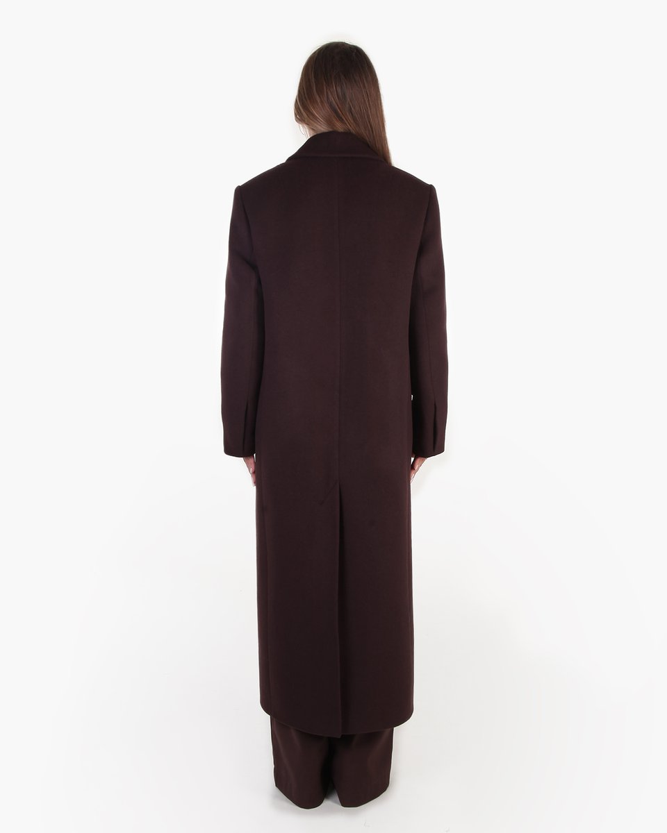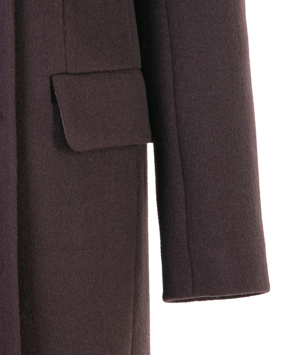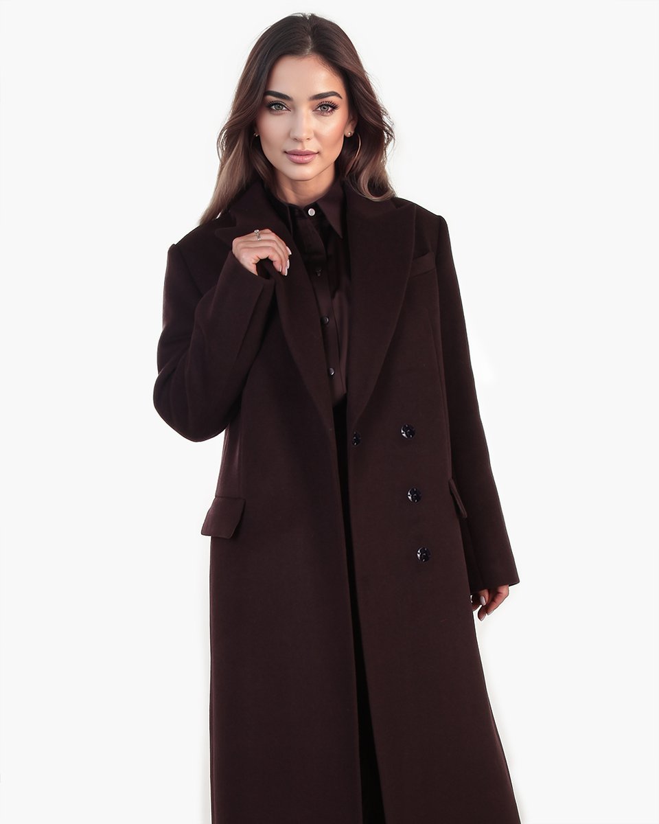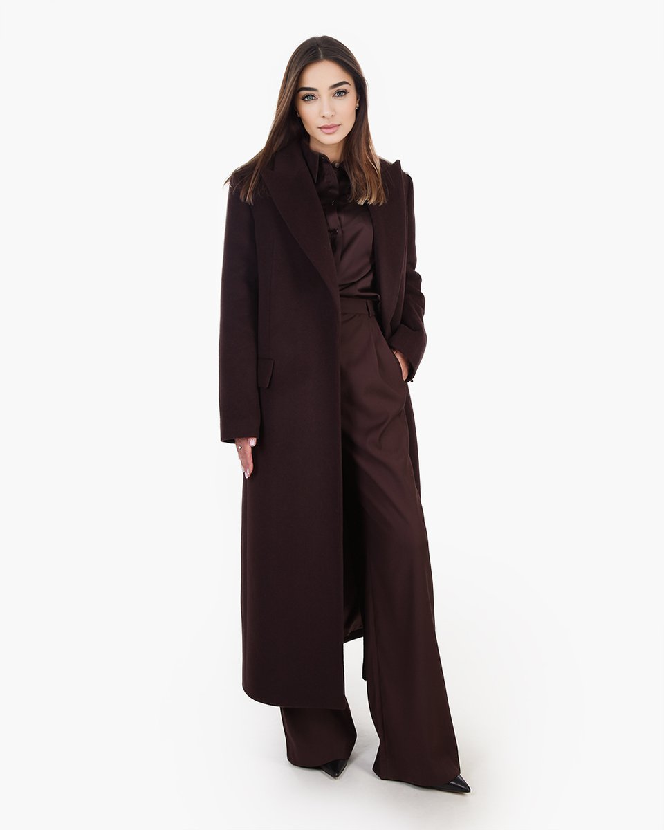 Пальто классического прямого кроя с английским воротником. Базовая модель с острой линией плеч и посадкой по фигуре в длине миди. В более мягком чем черном, но также базовом и трендовом благородном оттенке горького шоколада пальто станет уверенной основой вашего верхнего гардероба на осень и зиму. Строгая и лаконичная модель подойдет и к деловым костюмам, и к уютным трикотажным образам.