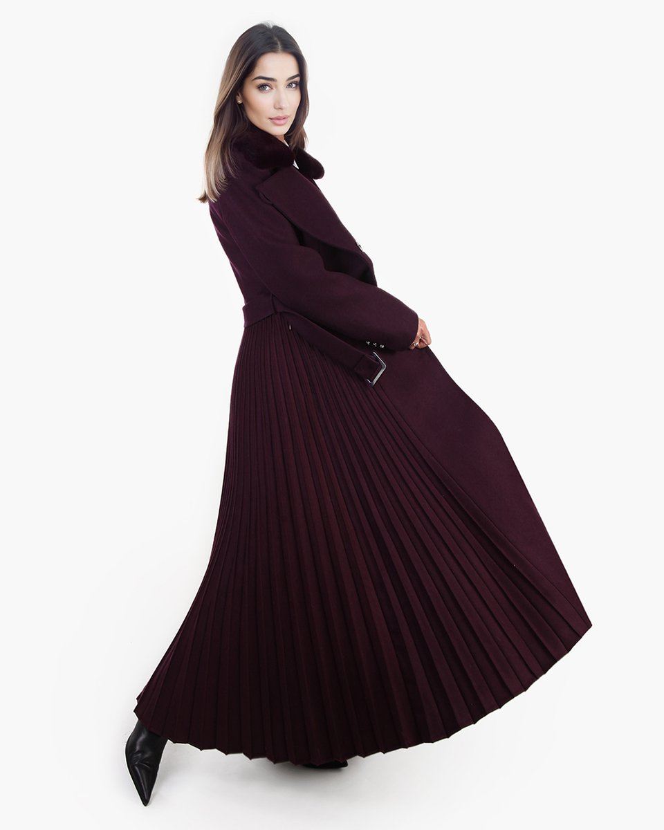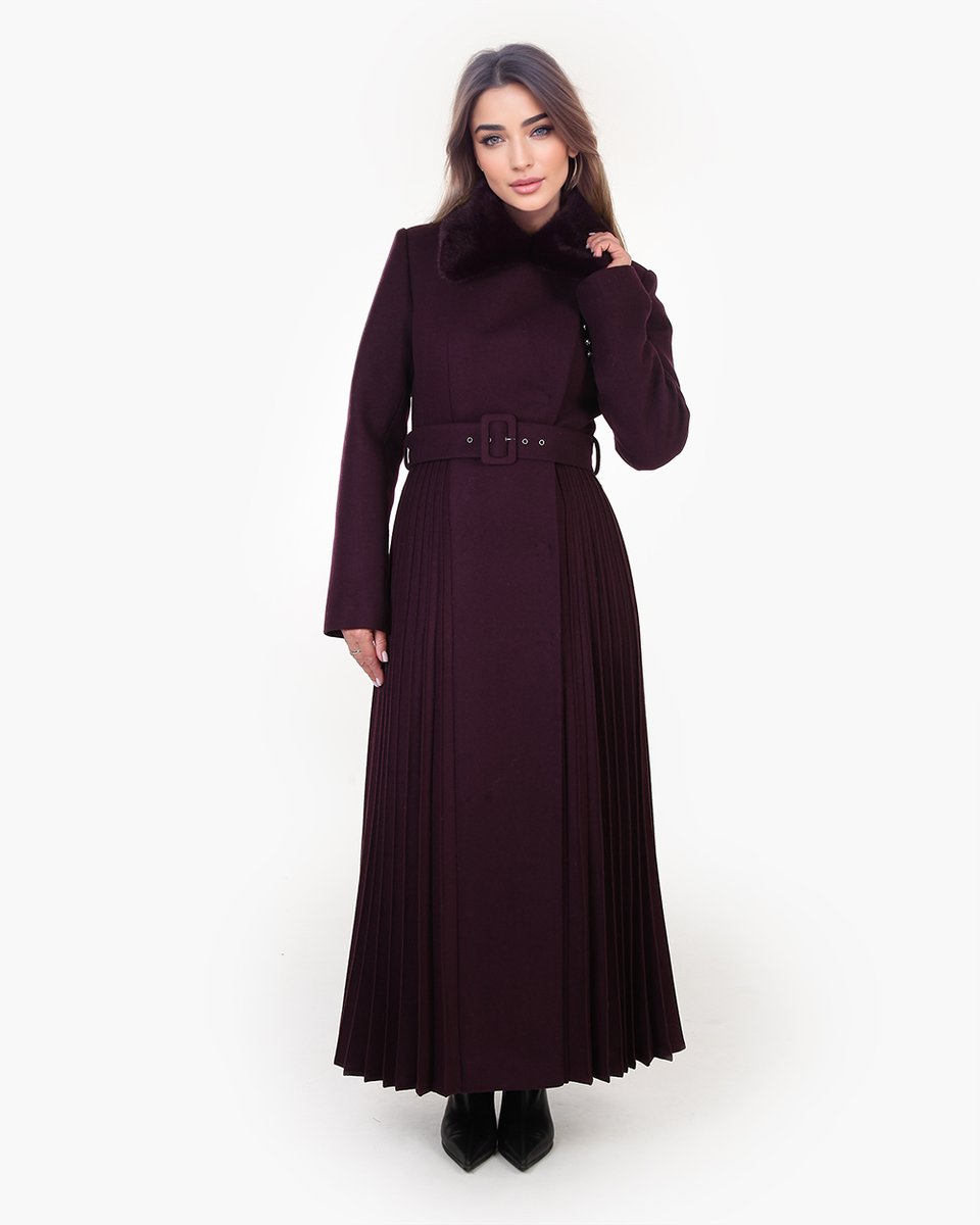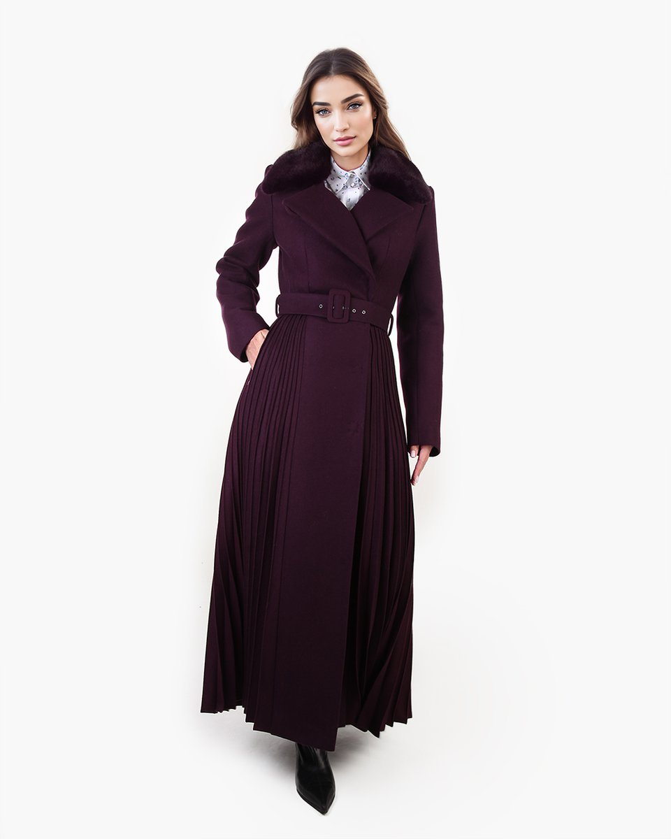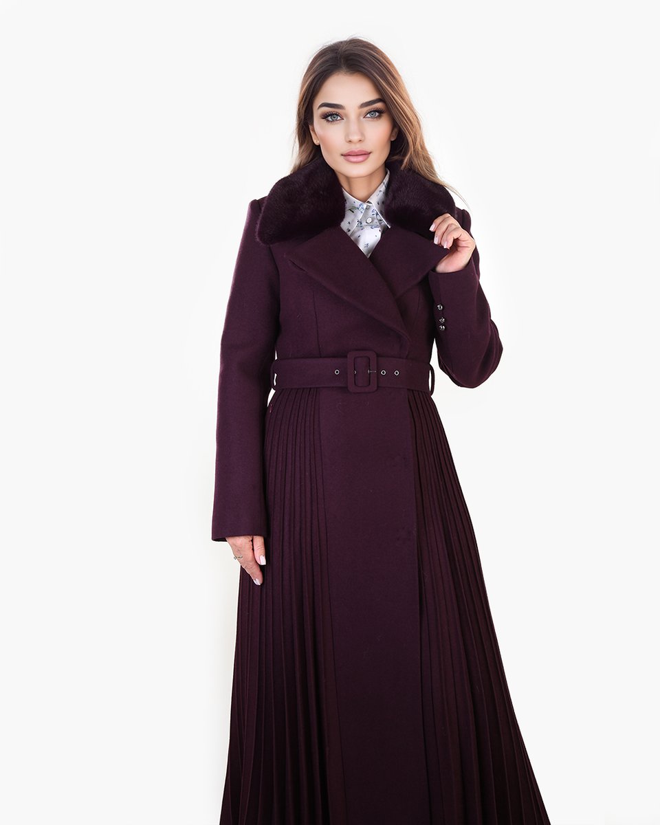 Бестселлер линии “Пальто как платье” длины макси цвета темный пурпур. Пальто из плотного драпа со скульптурным кроем, что делает посадку изящной и утонченной. Пальто с английским воротником, лацканы которого можно застегнуть на пуговицу, плотно закрыв грудь. Отложная часть воротничка из съемного эко-меха под норку в тон. Юбка-гофре длины макси, где каждая складка прострочена по краю, что делает юбку более струящейся, структурной и долговечной. Строчка закрепляет складку, не давая ей распрямиться со временем. В комплекте к пальто идет широкий текстильный ремень с обтяжной пряжкой в тон, который акцентирует талию. Сезонность: осень, зима.
