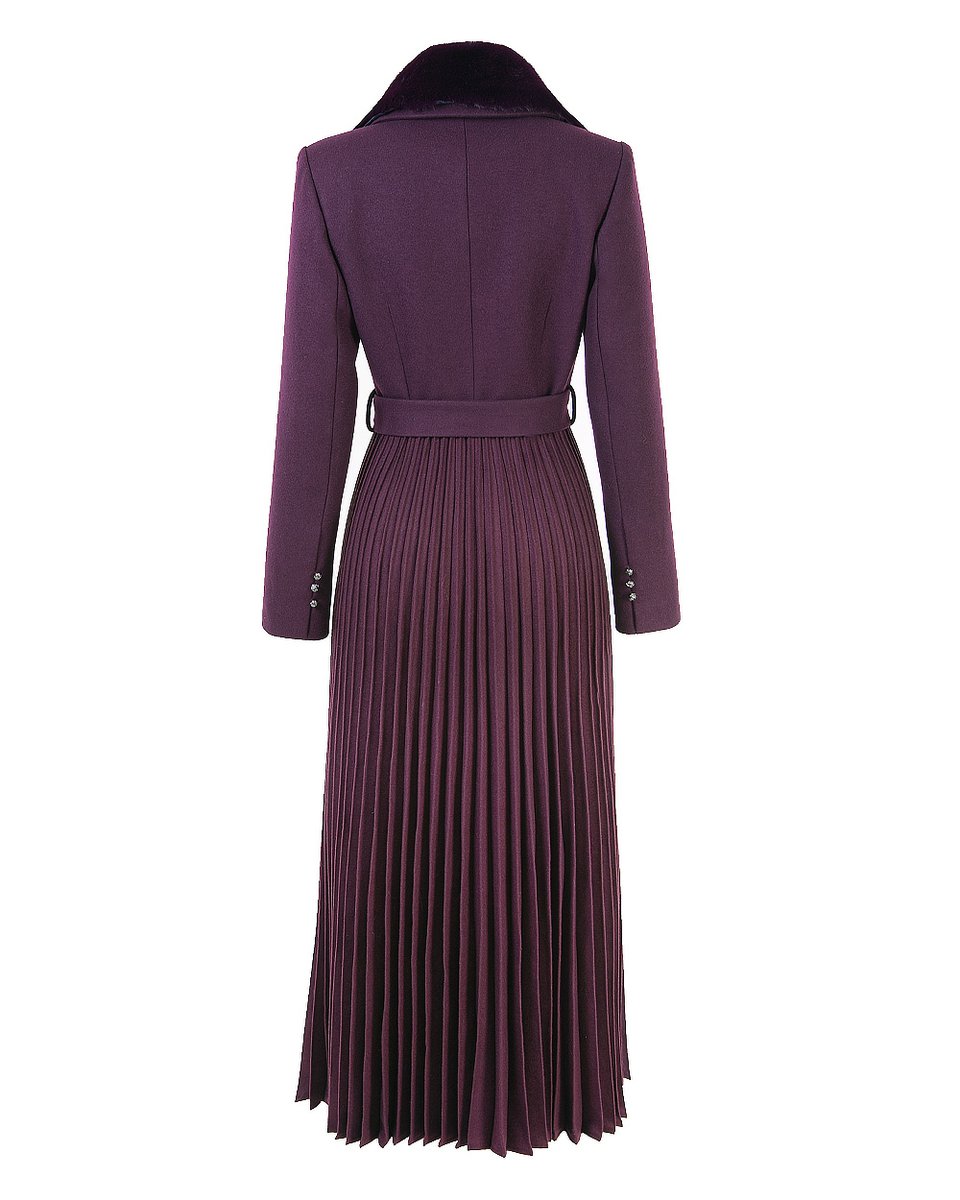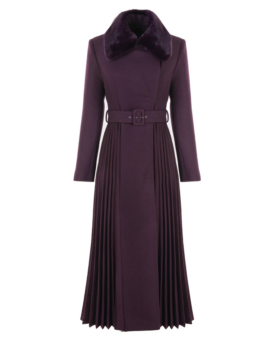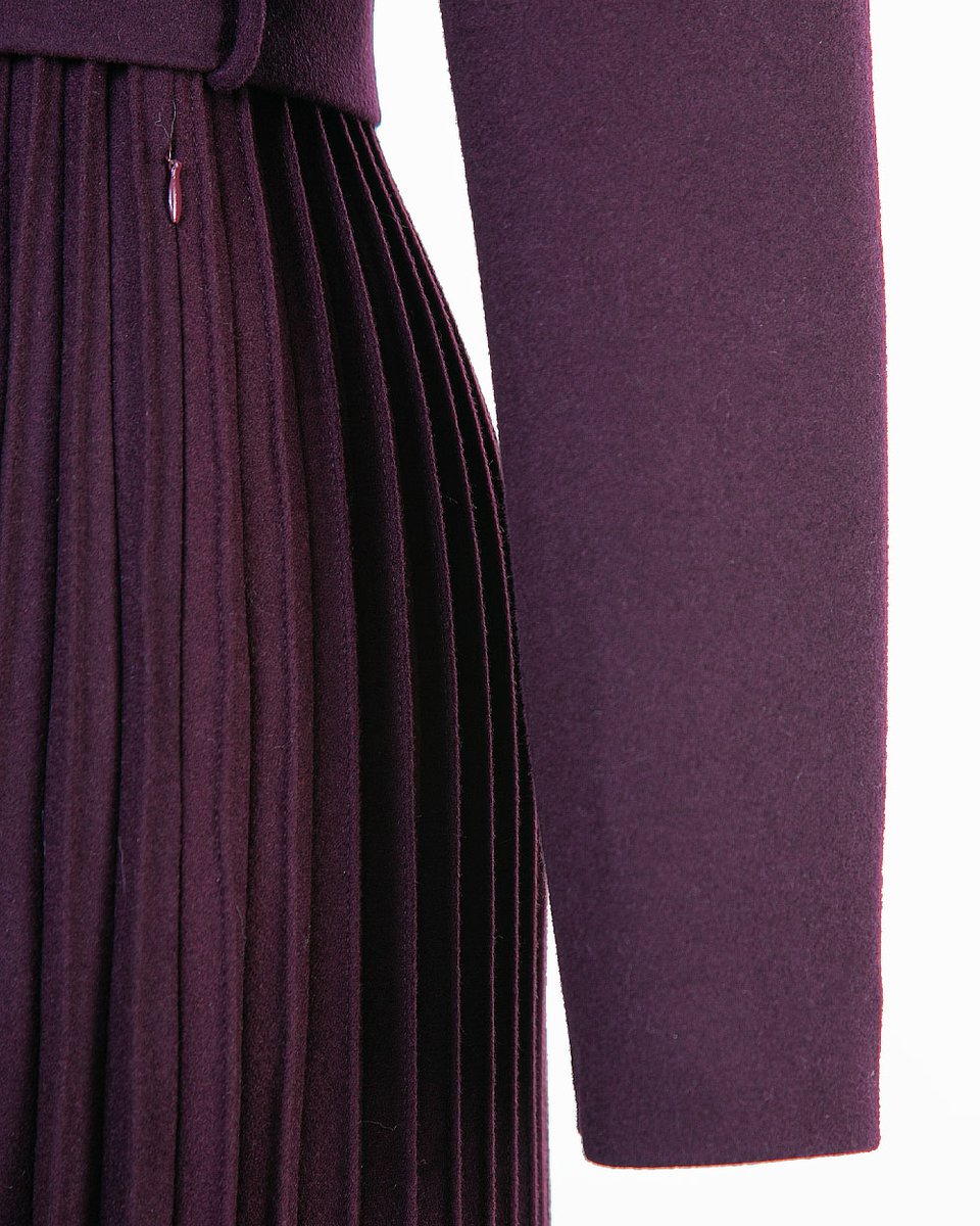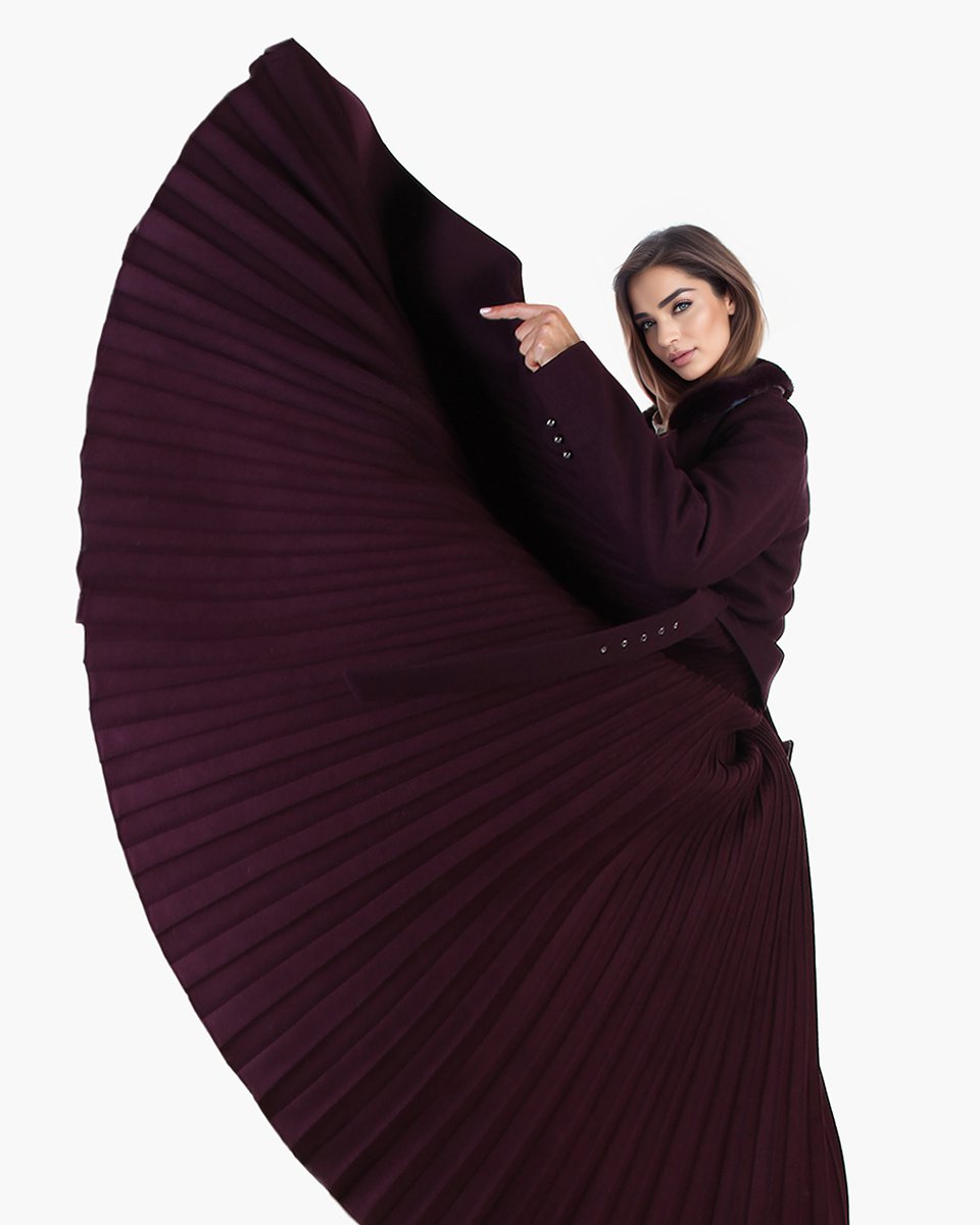 Бестселлер линии “Пальто как платье” длины макси цвета темный пурпур. Пальто из плотного драпа со скульптурным кроем, что делает посадку изящной и утонченной. Пальто с английским воротником, лацканы которого можно застегнуть на пуговицу, плотно закрыв грудь. Отложная часть воротничка из съемного эко-меха под норку в тон. Юбка-гофре длины макси, где каждая складка прострочена по краю, что делает юбку более струящейся, структурной и долговечной. Строчка закрепляет складку, не давая ей распрямиться со временем. В комплекте к пальто идет широкий текстильный ремень с обтяжной пряжкой в тон, который акцентирует талию. Сезонность: осень, зима.