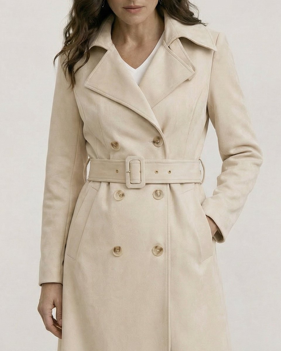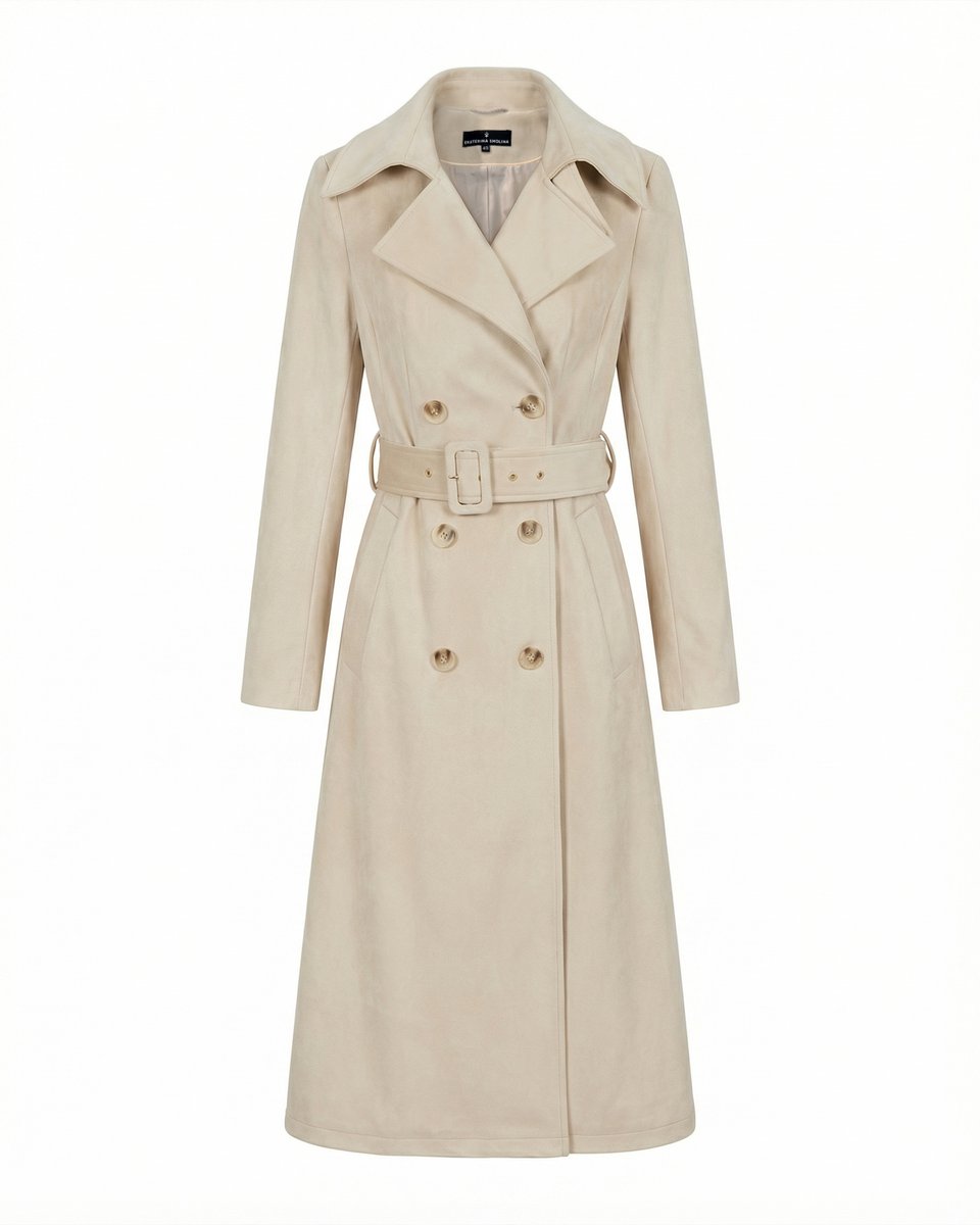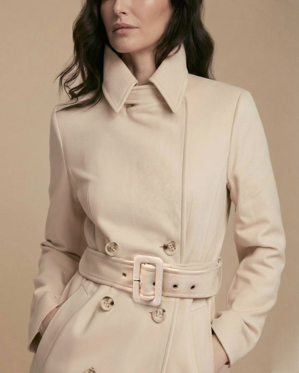 Легкое двубортное пальто-тренч из водоотталкивающего и ветрозащитного бархата кремового цвета. Тренч классического кроя с посадкой по фигуре в верхней части, английским воротником и отрезной юбкой-трапецией. Английский воротник застегивается на пуговицу, плотно закрывая грудь. Приталенная женственная модель с текстильным ремнем из бархата с пряжкой. Ткань невероятная тактильная, ее бархатная текстура в нежном оттенке создает мягкий образ. Бархат обладает водоотталкивающими свойствами и легко очищается сухой щеткой. Сезонность: теплая весна и осень.