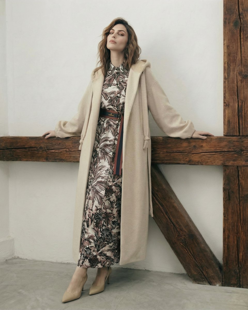 Пальто из водоотталкивающего и ветрозащитного бархата кремового оттенка создано для переменчивой весенней погоды. Широкие О-образные рукава собранные на складки добавляют объема, а большой капюшон с декоративной бархатной завязкой защитит от ветра. Расслабленный свободный крой позволяет носить пальто объемным или акцентировать талию ремнем в тон, меняя силуэт по настроению. Благодаря свободному крою модель легко утеплить манишкой, жилетом или тонкой пуховой курткой для более прохладных дней. Материал водоотталкивающий и неприхотлив в уходе — пальто достаточно чистить сухой щеткой, что особенно важно для верхней одежды светлых оттенков. Идеальный вариант для прогулок, путешествий и городской весны.