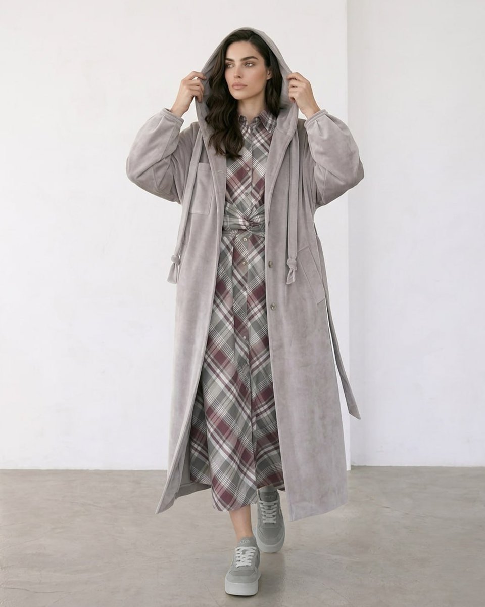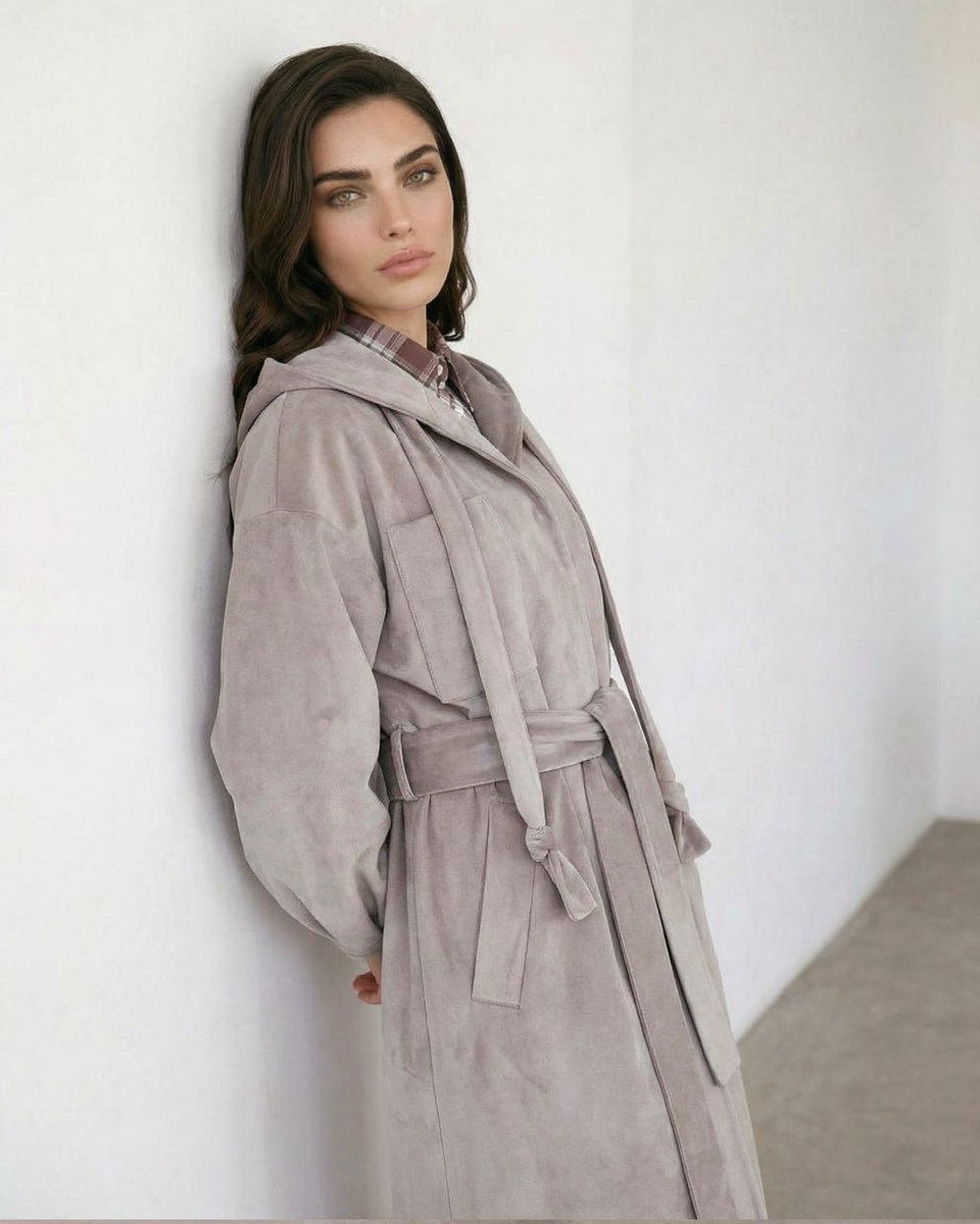 Пальто из водоотталкивающего и ветрозащитного бархата сливочного оттенка создано для переменчивой весенней погоды. Широкие О-образные рукава с заложенными складками на манжетах добавляют объема, а большой капюшон с кулиской на бархатную ленту защитит от ветра. Расслабленный свободный крой позволяет носить пальто объемным или акцентировать талию ремнем в тон, меняя силуэт по настроению. Благодаря свободному крою модель легко утеплить манишкой, жилетом или тонкой пуховой курткой для более прохладных дней. Материал водоотталкивающий и неприхотлив в уходе — пальто достаточно чистить сухой щеткой, что особенно важно для верхней одежды светлых оттенков. Идеальный вариант для прогулок, путешествий и городской весны.