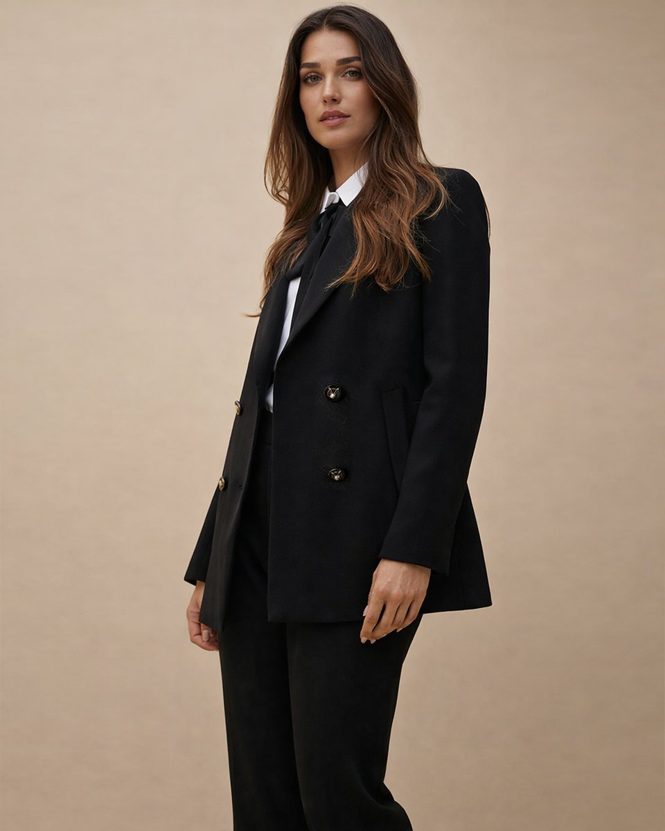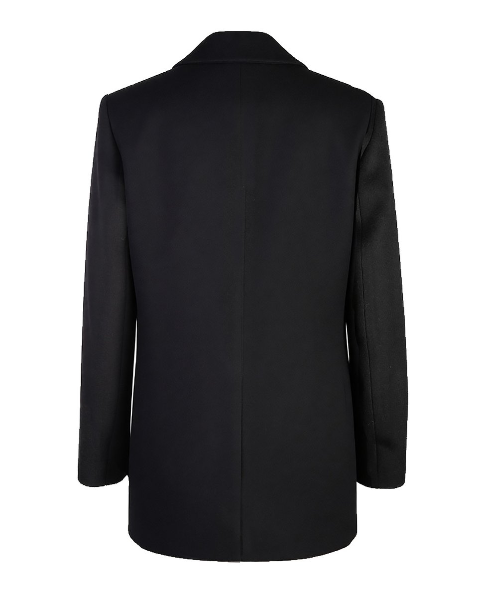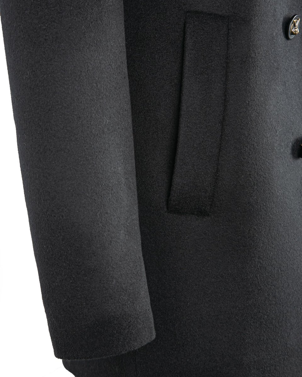 Полупальто-жакет классического кроя с двубортной застежкой. Плотность шерстяного драпа и четкая графика прямого кроя отлично держит форму и создает уверенный силуэт. Глубокий черный цвет подчеркивает лаконичность модели, делая ее основой для любых экспериментов. Полупальто одинаково органично смотрится с деловым костюмом, платьем-футляром или расслабленными джинсами и свитером крупной вязки. Вещь с характером для тех, кто ценит вневременную элегантность и качество исполнения.