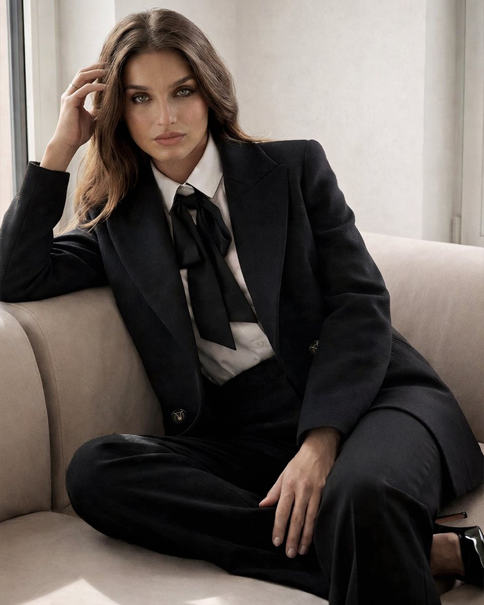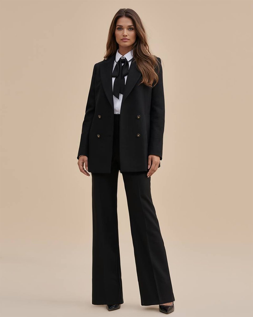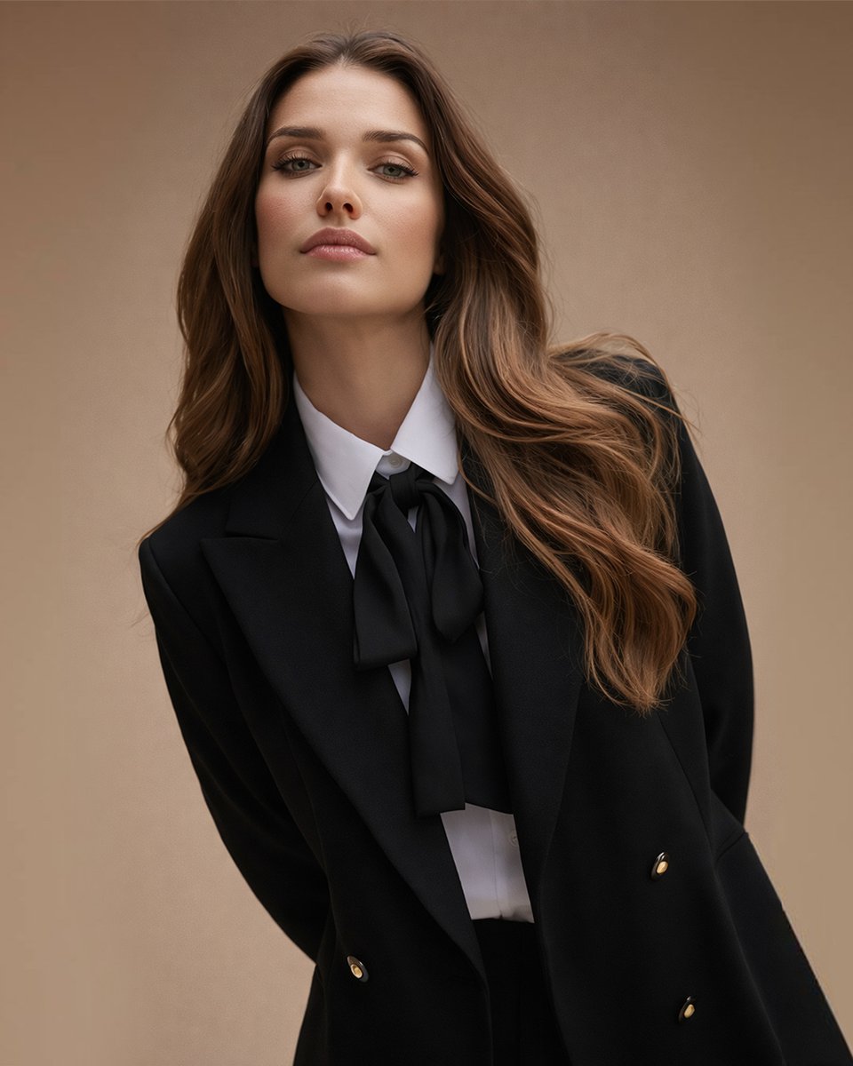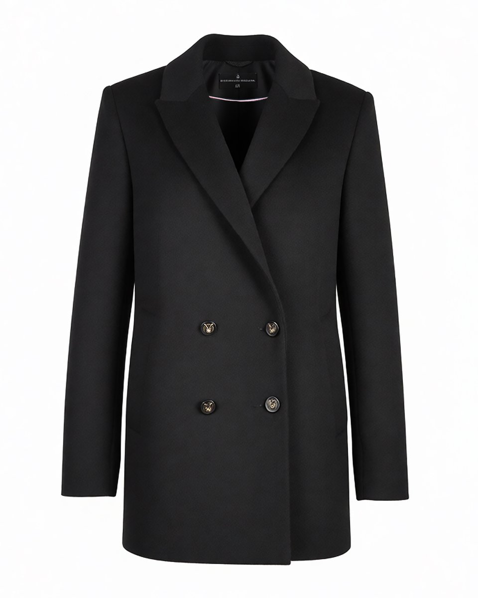 Полупальто-жакет классического кроя с двубортной застежкой. Плотность шерстяного драпа и четкая графика прямого кроя отлично держит форму и создает уверенный силуэт. Глубокий черный цвет подчеркивает лаконичность модели, делая ее основой для любых экспериментов. Полупальто одинаково органично смотрится с деловым костюмом, платьем-футляром или расслабленными джинсами и свитером крупной вязки. Вещь с характером для тех, кто ценит вневременную элегантность и качество исполнения.