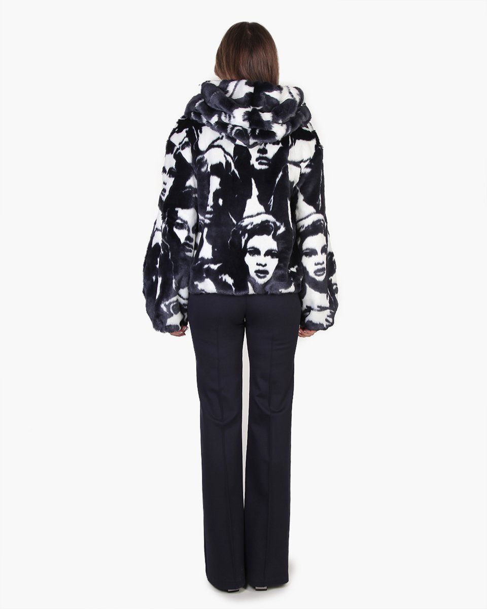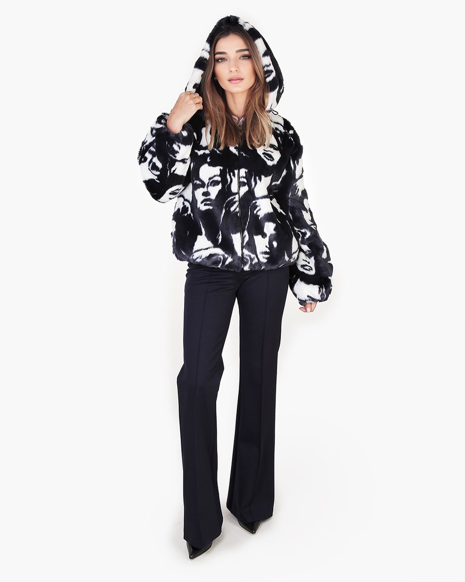 Полушубок из гладкого эко-меха с графичным черно-белым принтом “Лица”, где абстрактные силуэты лиц складываются в единый узор. Модель свободного кроя с мягкой линией плеча создает уютный силуэт-трапецию, который укутывает в объятиях тепла и комфорта. Практичные капюшон с кулиской и застёжка на молнию защитят от непогоды. Мягкие сборки-баллоны по низу и на манжетах придают силуэту лёгкость и динамику. Смелый принт делает его центром внимания, который прекрасно контрастирует с однотонными базовыми вещами — от классических джинсов до строгих брюк. Парящая, тёплая и невероятно стильная вещь. Сезонность: холодная осень, зима.