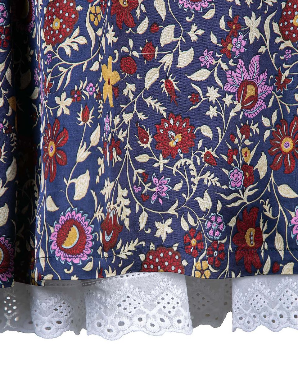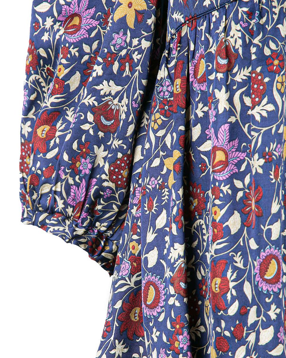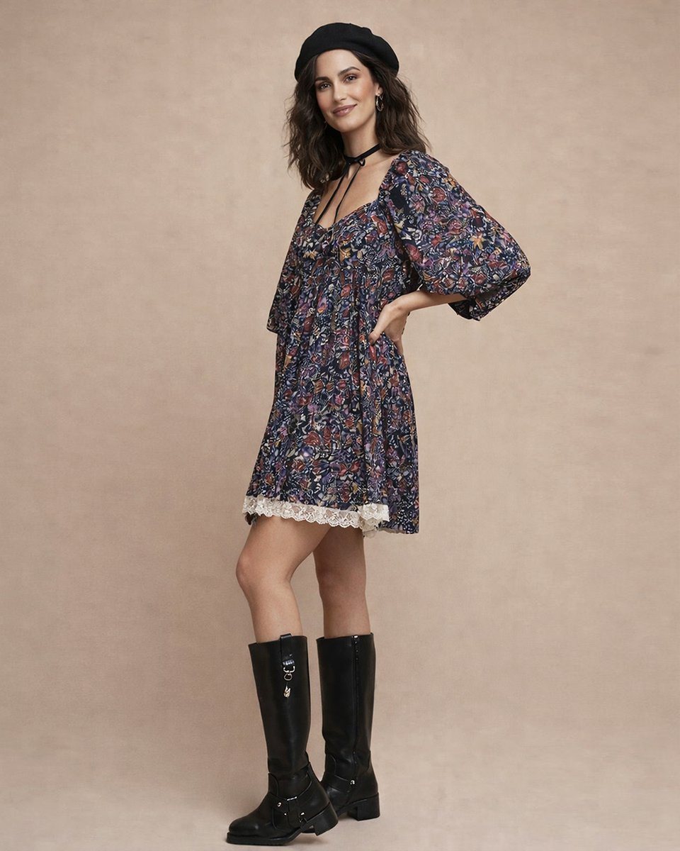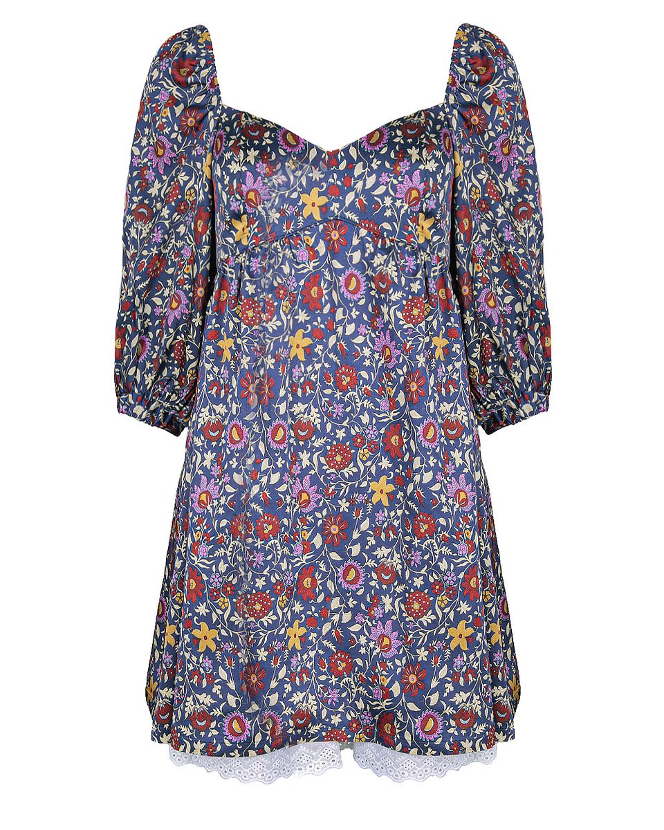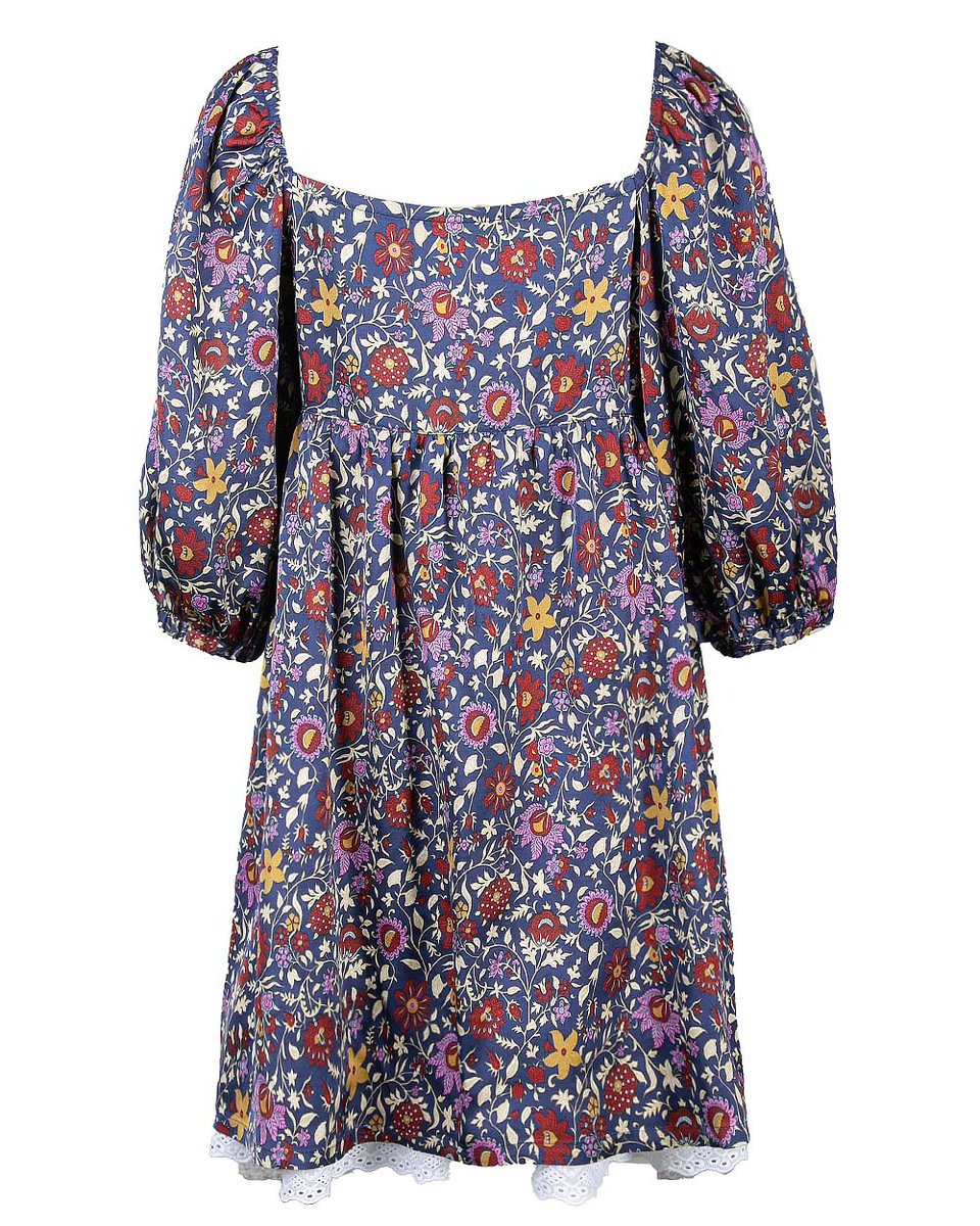 Платье с игривым настроением и романтичным характером. Модель в стиле беби-долл с декольте каре, рукавами-фонариками 3/4, которые при желании можно спустить с плеча, и клешем-трапецией от груди. Из-под мини-юбки выглядывает нежный подъюбник из белоснежного шитья — словно винтажная деталь. Богатый цветочный принт в приглушенных оттенках пурпура, брусники, золотистого меда создает сложный и благородный колорит. Играем с настроением: носите с грубыми ботинками и беретом для гранж-романтики или с ботфортами-чулками и балетками для женственных образов.