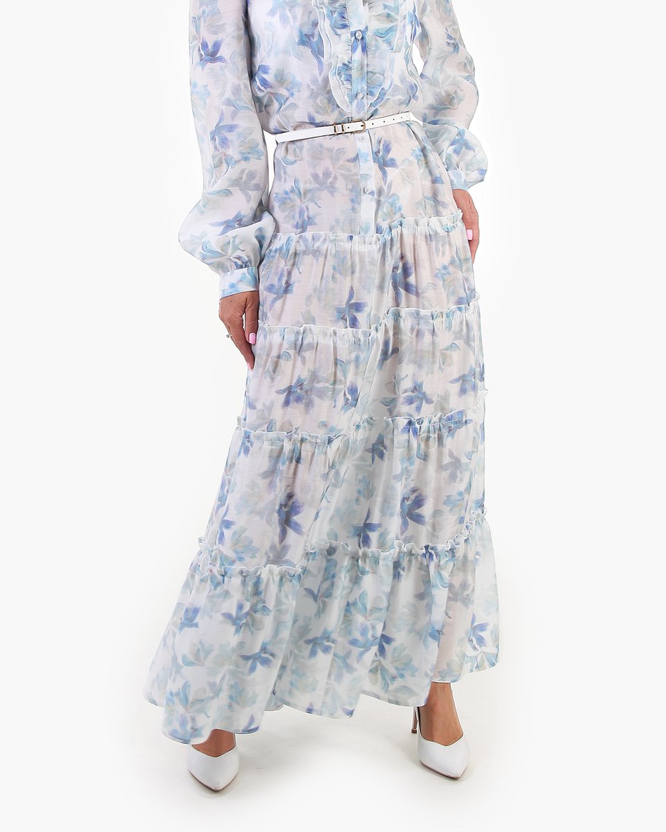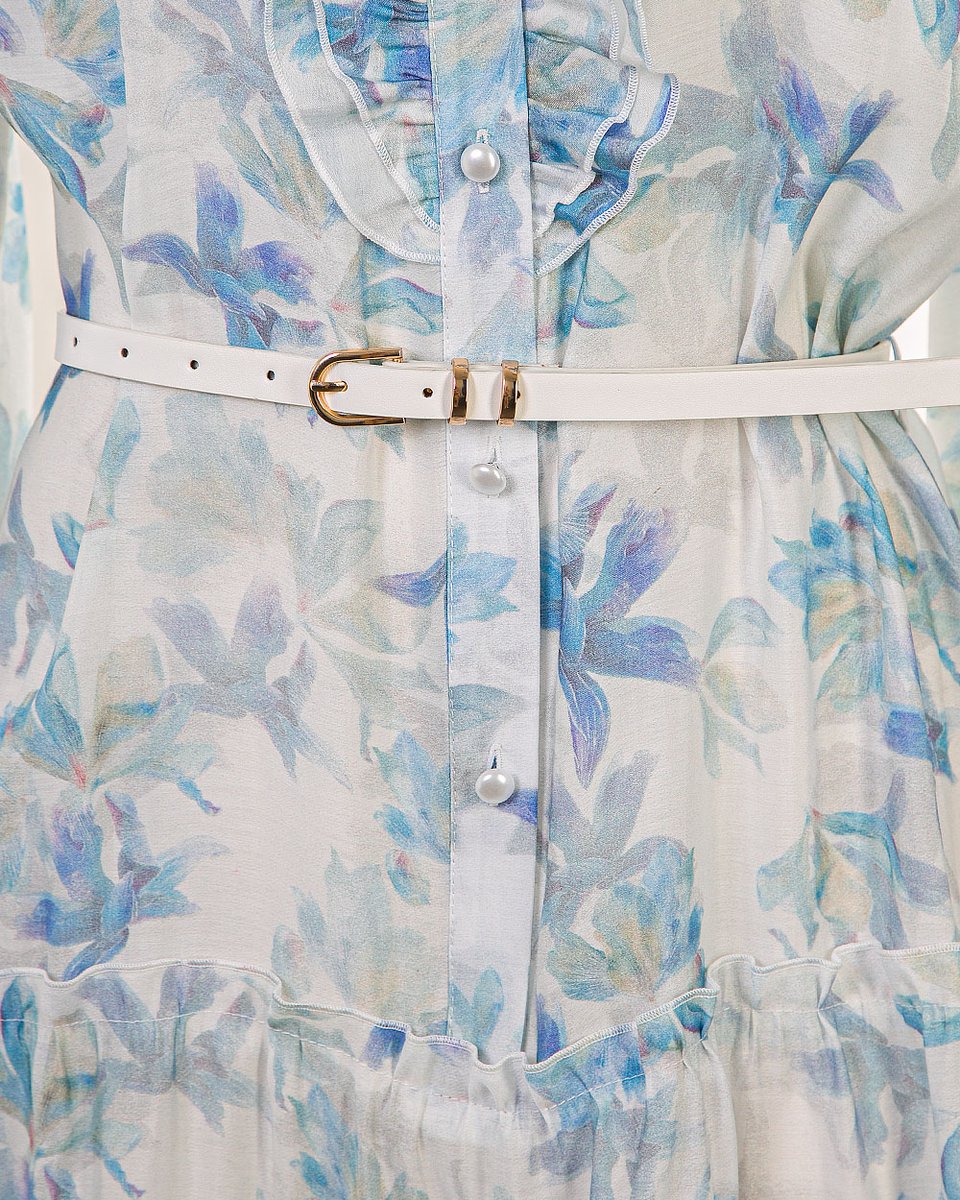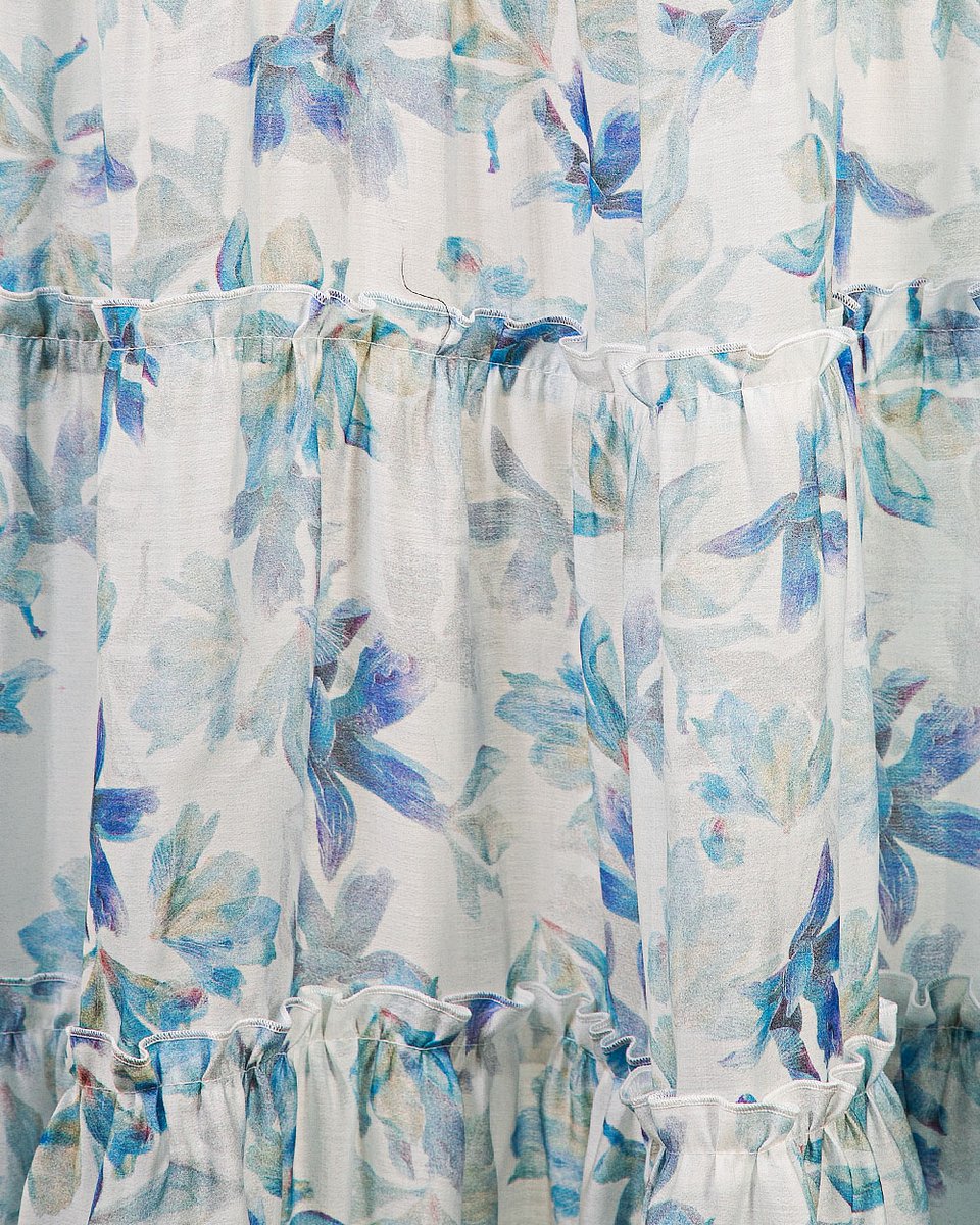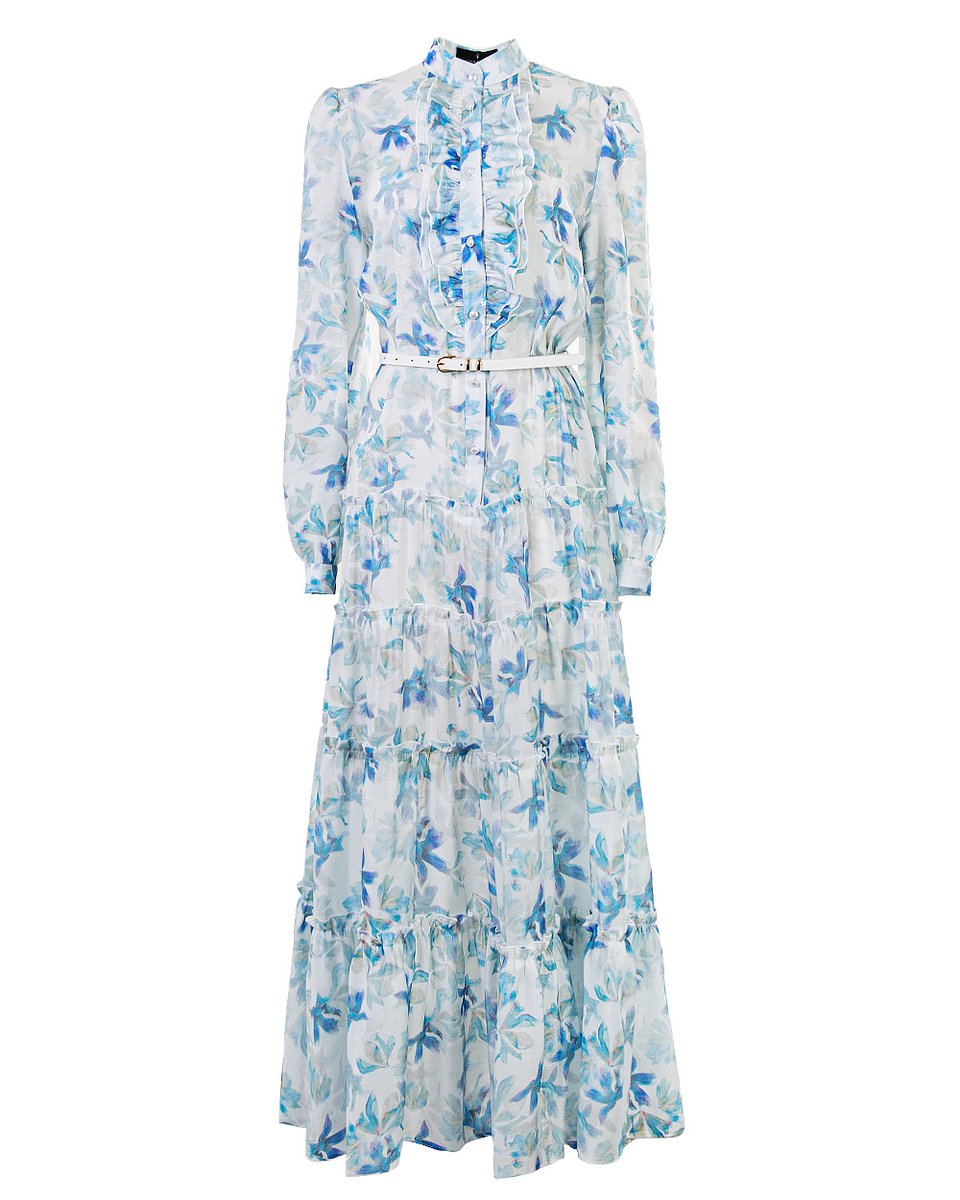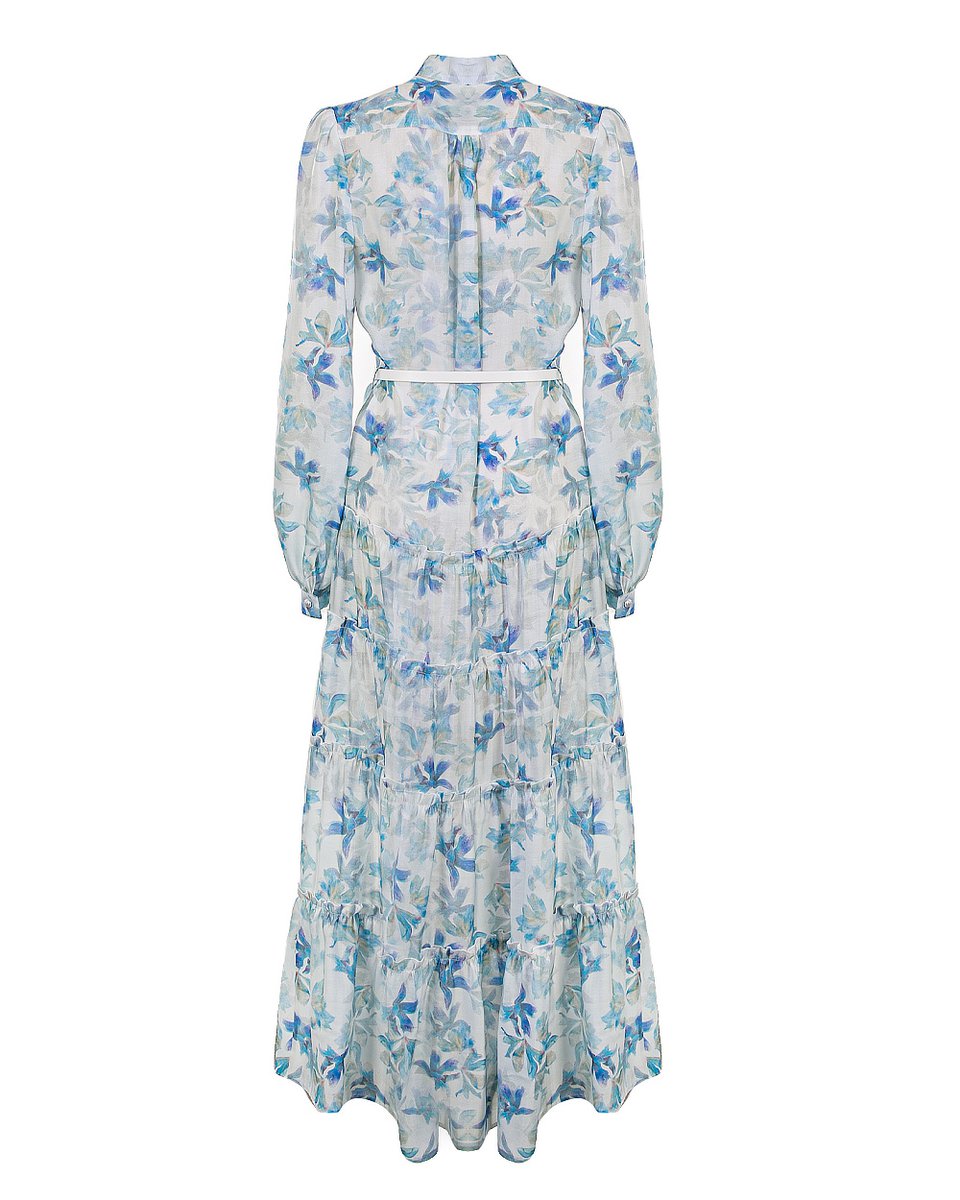 Романтичное платье-макси цвета слоновой кости в цветочный принт. Основная ткань платья - летящая воздушная органза цвета слоновой кости. Крупные листья, колокольчики и сирень в свежих натуральных оттенках принта уравновешивают многочисленные воланы, рюши и оборки на длинной юбке и декольте. Платье также украшает текстильный шнурок в тон с шелковыми кисточками на концах, которые добавляют элегантному и романтичному образу кокетства и игривости. Кисти съемные, это упрощает уход за изделием. В комплекте к платью идет нижнее платье-сорочка из эластичной сетки цвета nude. Платье роскошно смотрится самостоятельно, также его можно дополнить блейзером или кардиганом. Характер образу задаст обувь, но одинаково хорошо к нему подойдут и туфли/босоножки на каблуке, и высокие сапоги на плоском ходу, и ботинки на массивной подошве.