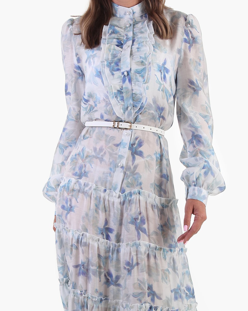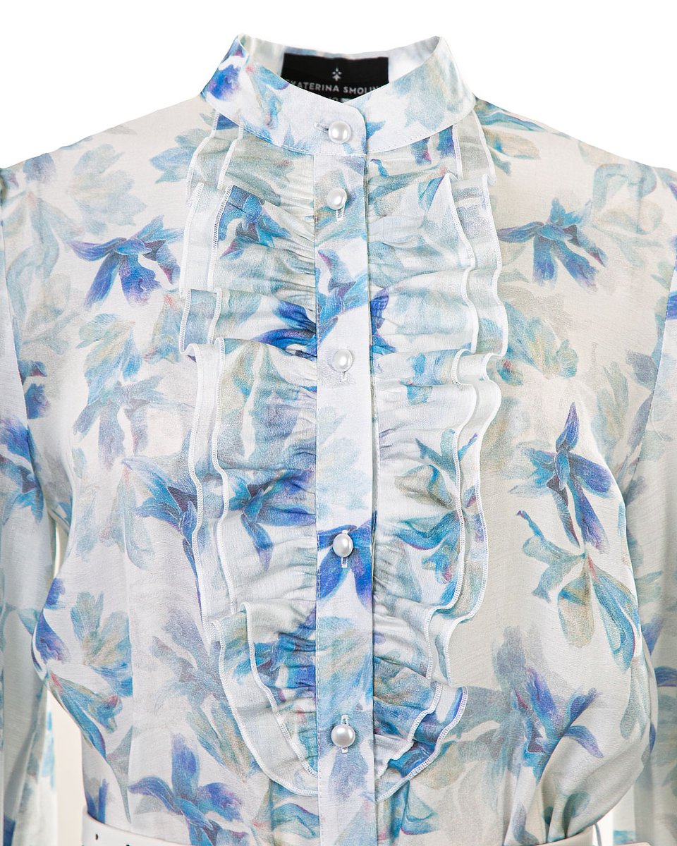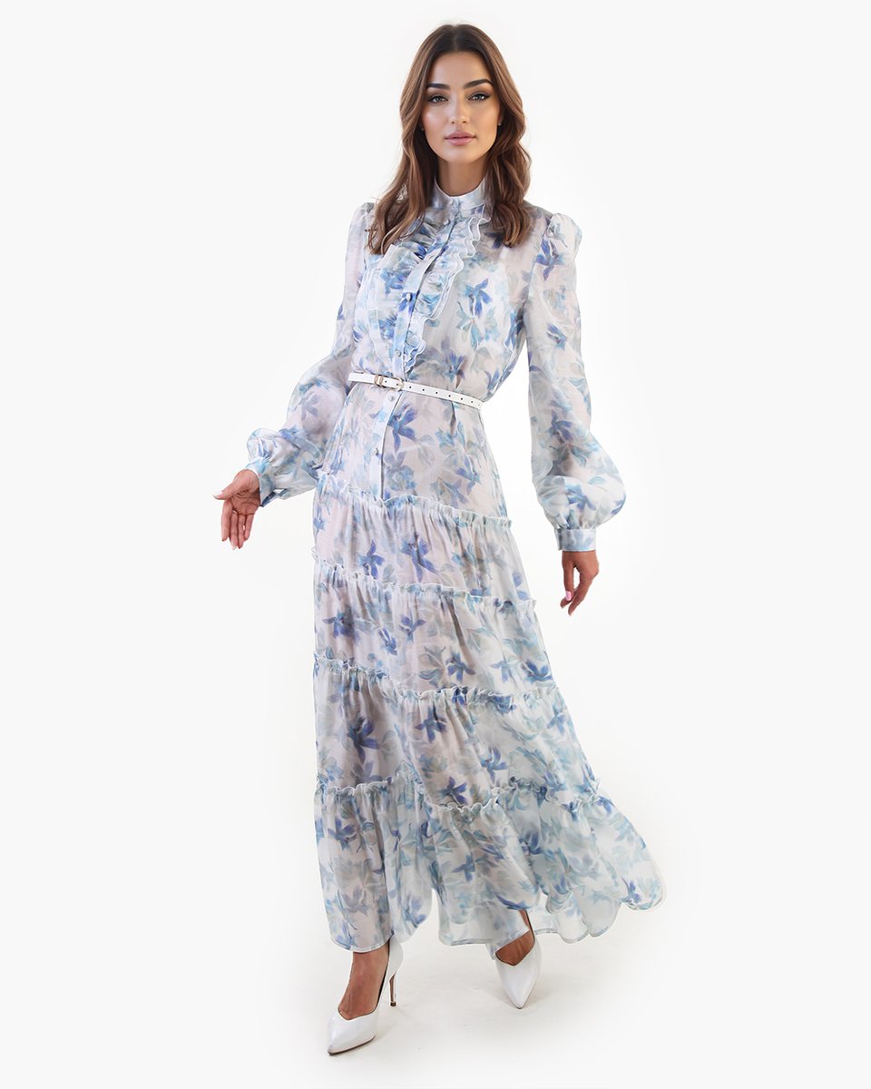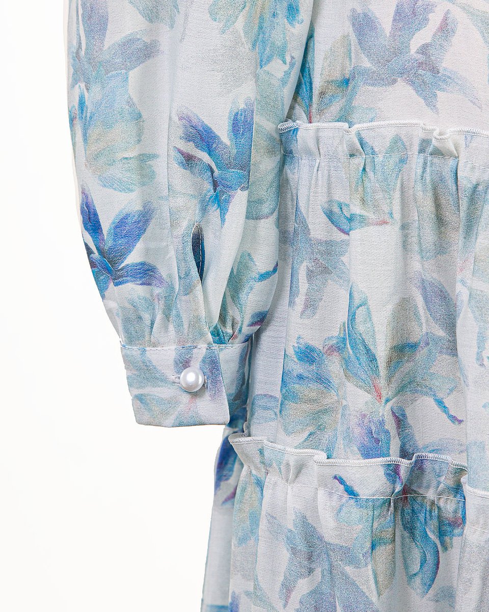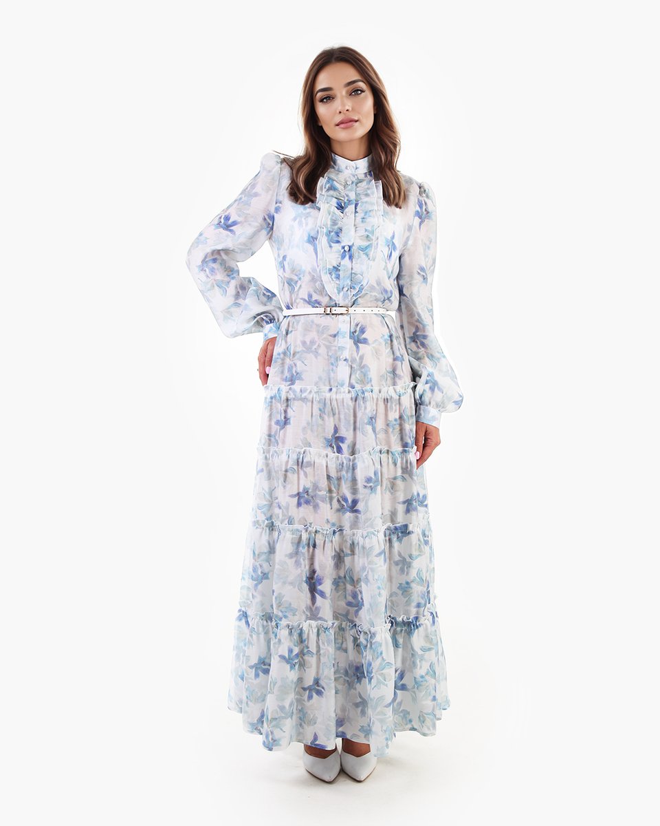 Романтичное платье-макси цвета слоновой кости в цветочный принт. Основная ткань платья - летящая воздушная органза цвета слоновой кости. Крупные листья, колокольчики и сирень в свежих натуральных оттенках принта уравновешивают многочисленные воланы, рюши и оборки на длинной юбке и декольте. Платье также украшает текстильный шнурок в тон с шелковыми кисточками на концах, которые добавляют элегантному и романтичному образу кокетства и игривости. Кисти съемные, это упрощает уход за изделием. В комплекте к платью идет нижнее платье-сорочка из эластичной сетки цвета nude. Платье роскошно смотрится самостоятельно, также его можно дополнить блейзером или кардиганом. Характер образу задаст обувь, но одинаково хорошо к нему подойдут и туфли/босоножки на каблуке, и высокие сапоги на плоском ходу, и ботинки на массивной подошве.