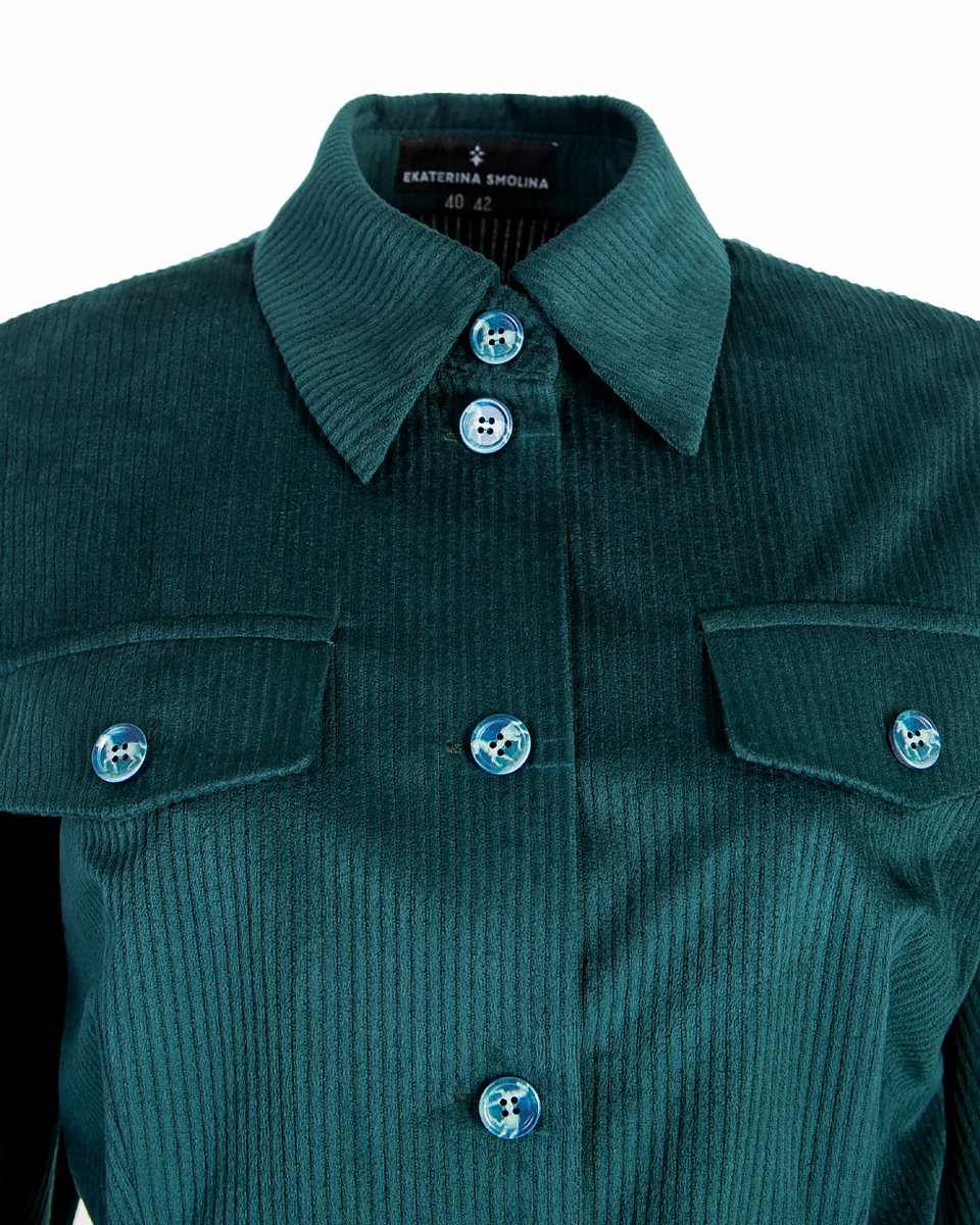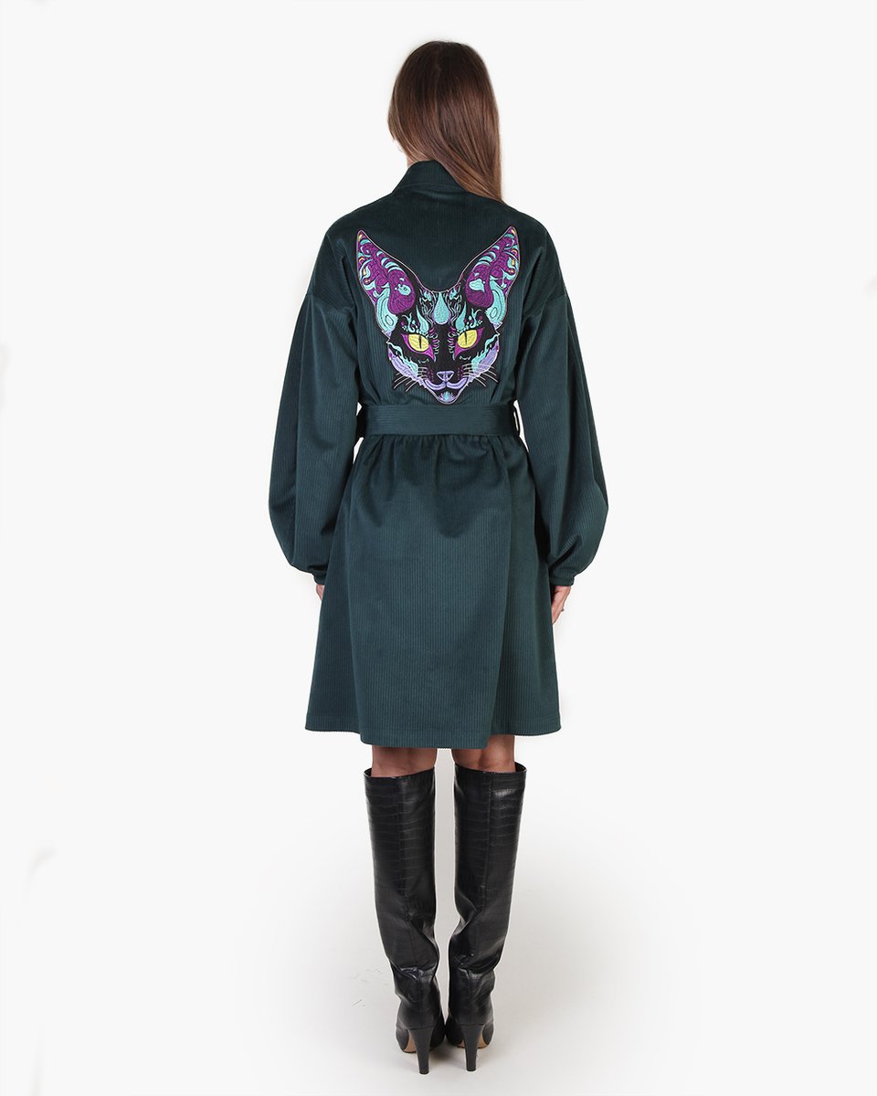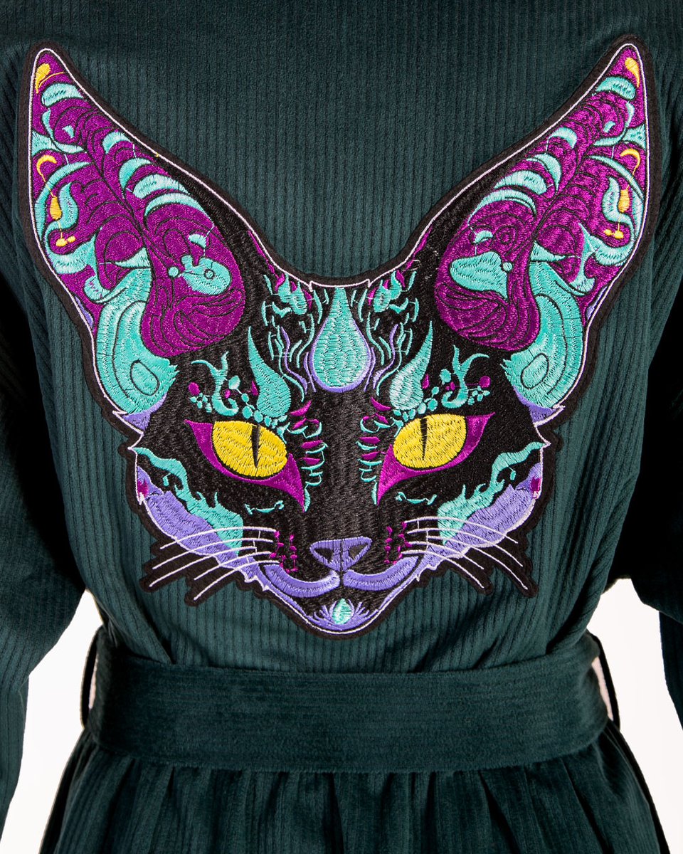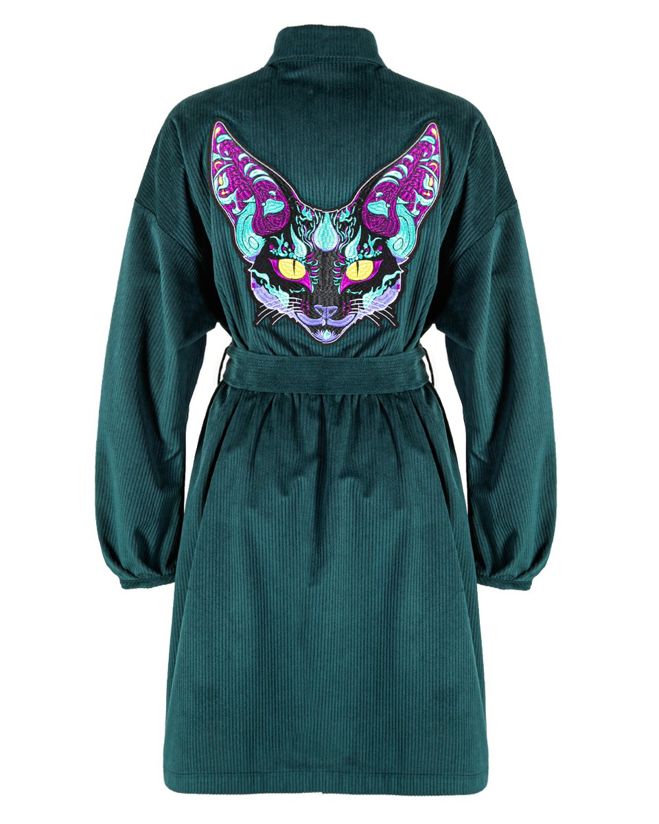 Платье-рубашка из благородного изумрудного вельвета, где классический крой обретает современный характер. Отложной воротник, застёжка на пуговицы с изящным рисунком и отрезная юбка на складах формируют элегантный силуэт. Главным украшением служит крупная художественная вышивка на спинке в виде головы кошки, выполненная яркими, почти флуоресцентными нитями, которые создают эффект витражного свечения. Пышные рукава, бархатный пояс с кистями и накладные карманы дополняют образ тонкой игрой фактур. Это платье — для тех, кто ценит баланс между строгой формой и свободой самовыражения. Носите его самостоятельно или как лёгкое пальто поверх базового трикотажа.