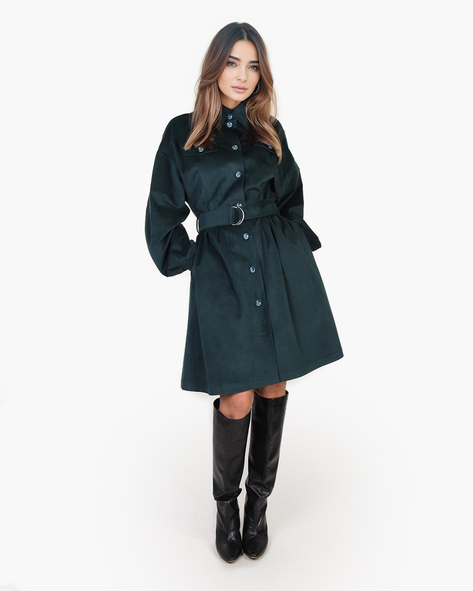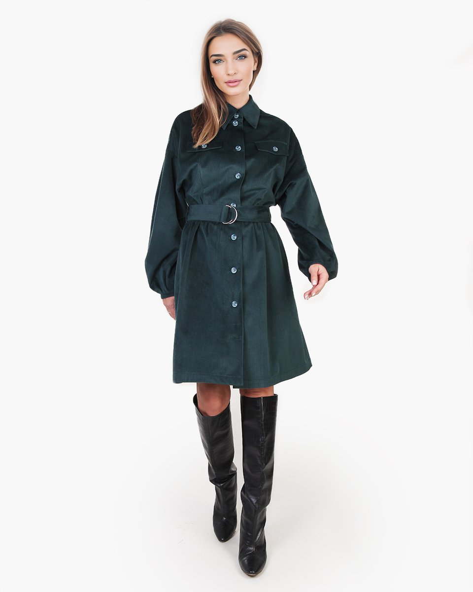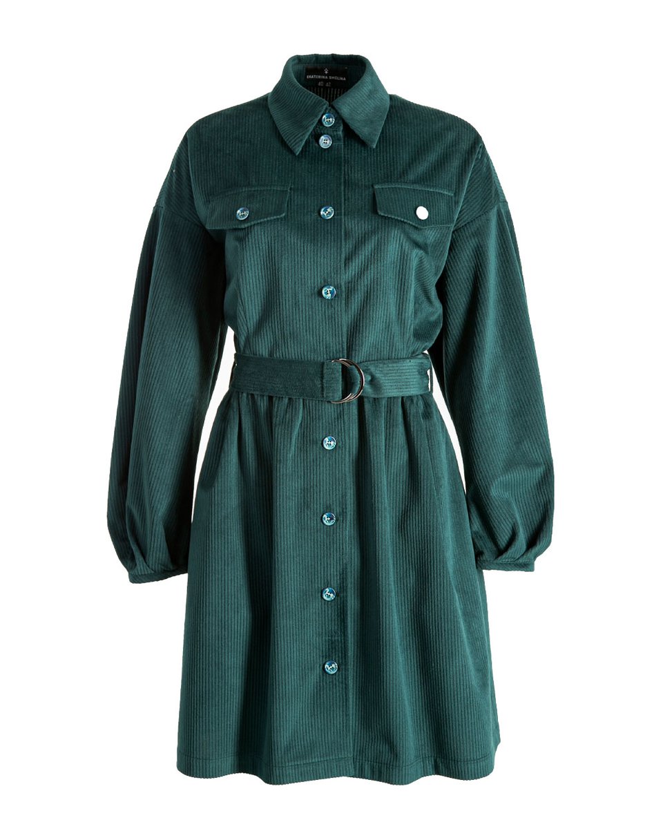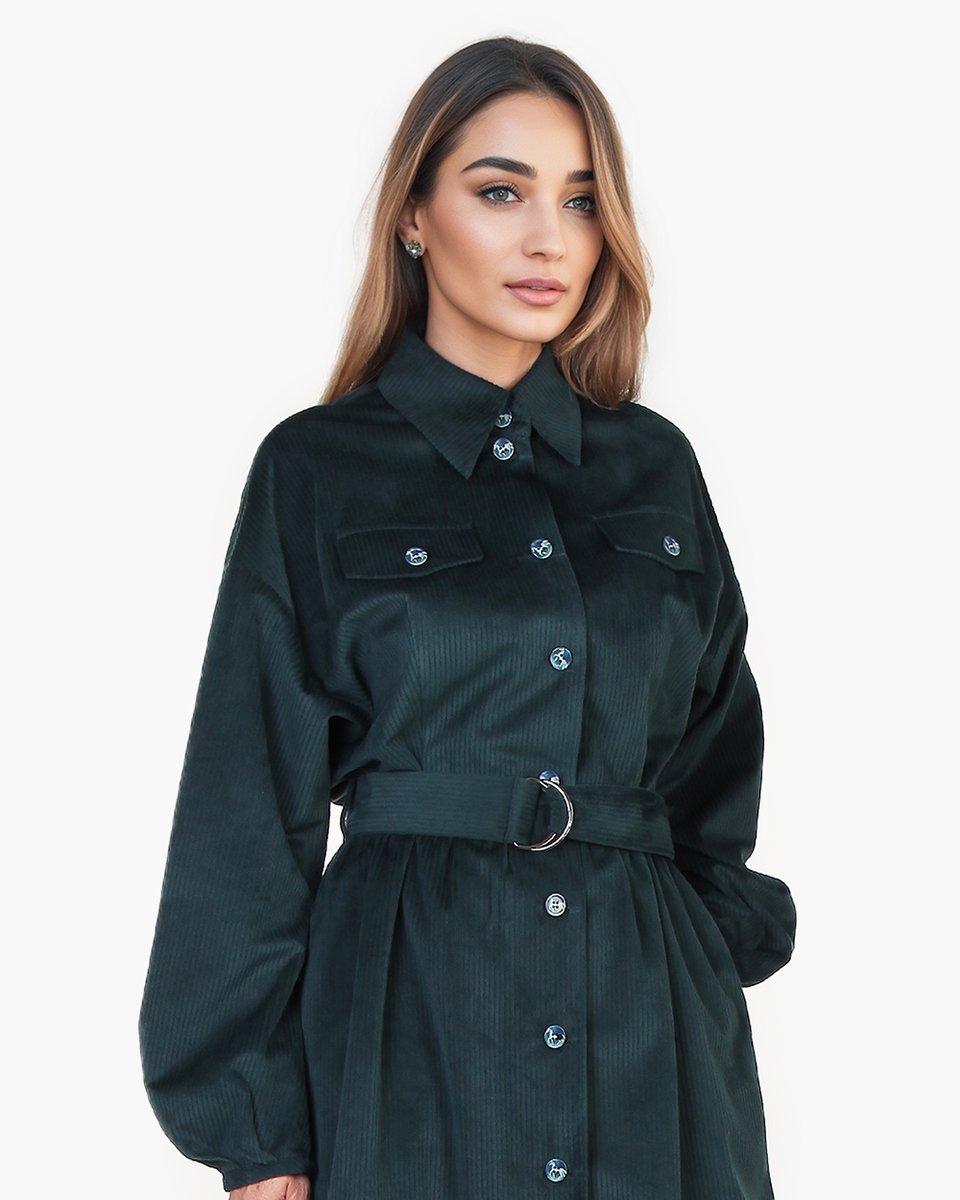 Платье-рубашка из благородного изумрудного вельвета, где классический крой обретает современный характер. Отложной воротник, застёжка на пуговицы с изящным рисунком и отрезная юбка на складах формируют элегантный силуэт. Главным украшением служит крупная художественная вышивка на спинке в виде головы кошки, выполненная яркими, почти флуоресцентными нитями, которые создают эффект витражного свечения. Пышные рукава, бархатный пояс с кистями и накладные карманы дополняют образ тонкой игрой фактур. Это платье — для тех, кто ценит баланс между строгой формой и свободой самовыражения. Носите его самостоятельно или как лёгкое пальто поверх базового трикотажа.