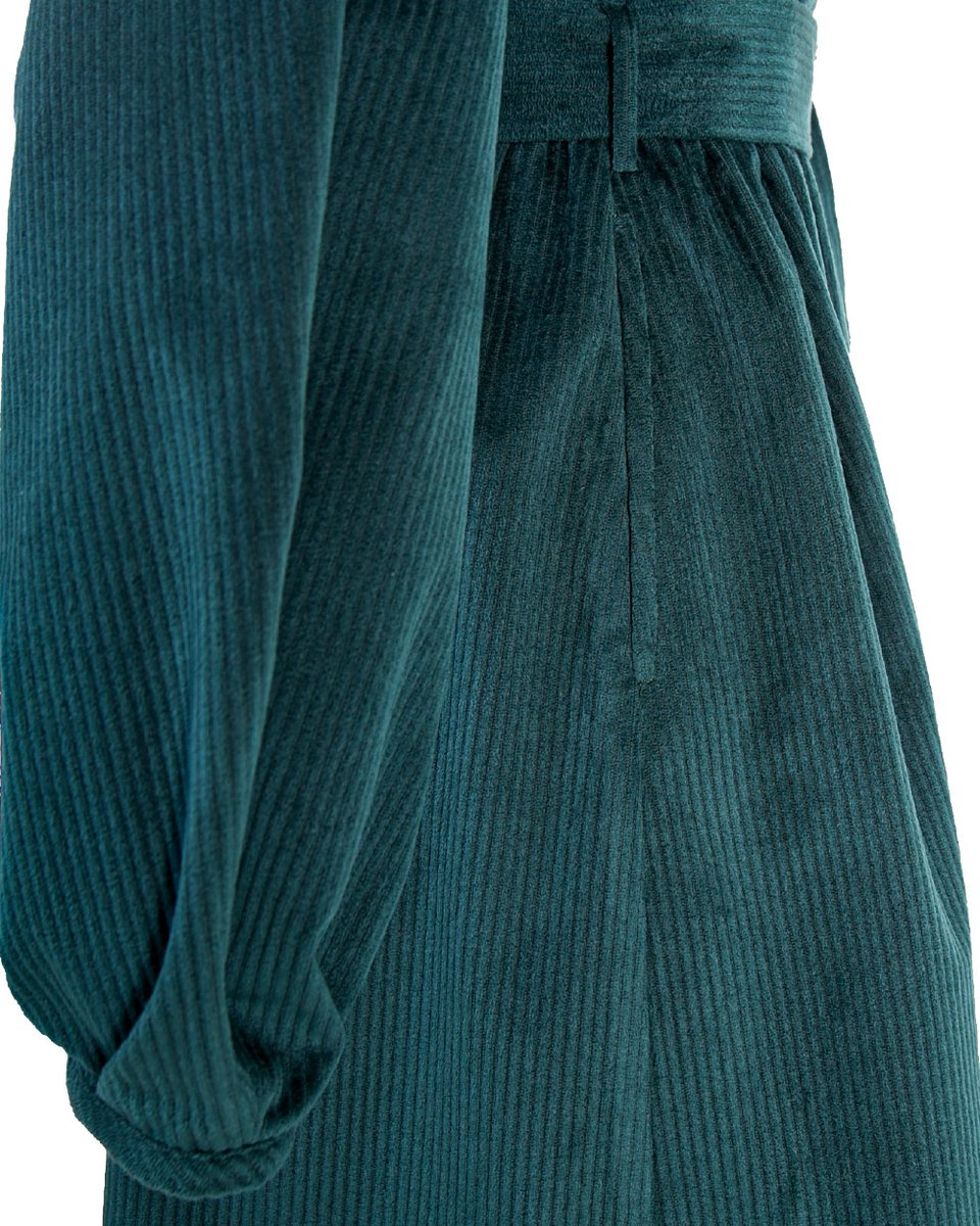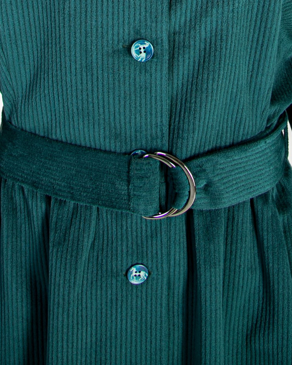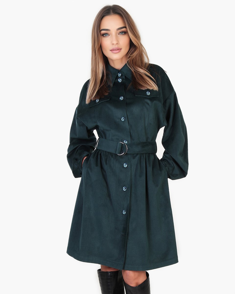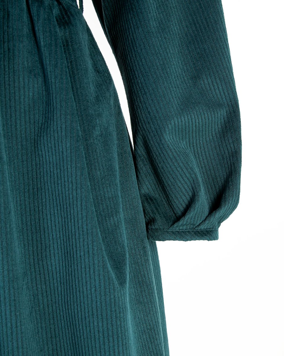 Платье-рубашка из благородного изумрудного вельвета, где классический крой обретает современный характер. Отложной воротник, застёжка на пуговицы с изящным рисунком и отрезная юбка на складах формируют элегантный силуэт. Главным украшением служит крупная художественная вышивка на спинке в виде головы кошки, выполненная яркими, почти флуоресцентными нитями, которые создают эффект витражного свечения. Пышные рукава, бархатный пояс с кистями и накладные карманы дополняют образ тонкой игрой фактур. Это платье — для тех, кто ценит баланс между строгой формой и свободой самовыражения. Носите его самостоятельно или как лёгкое пальто поверх базового трикотажа.