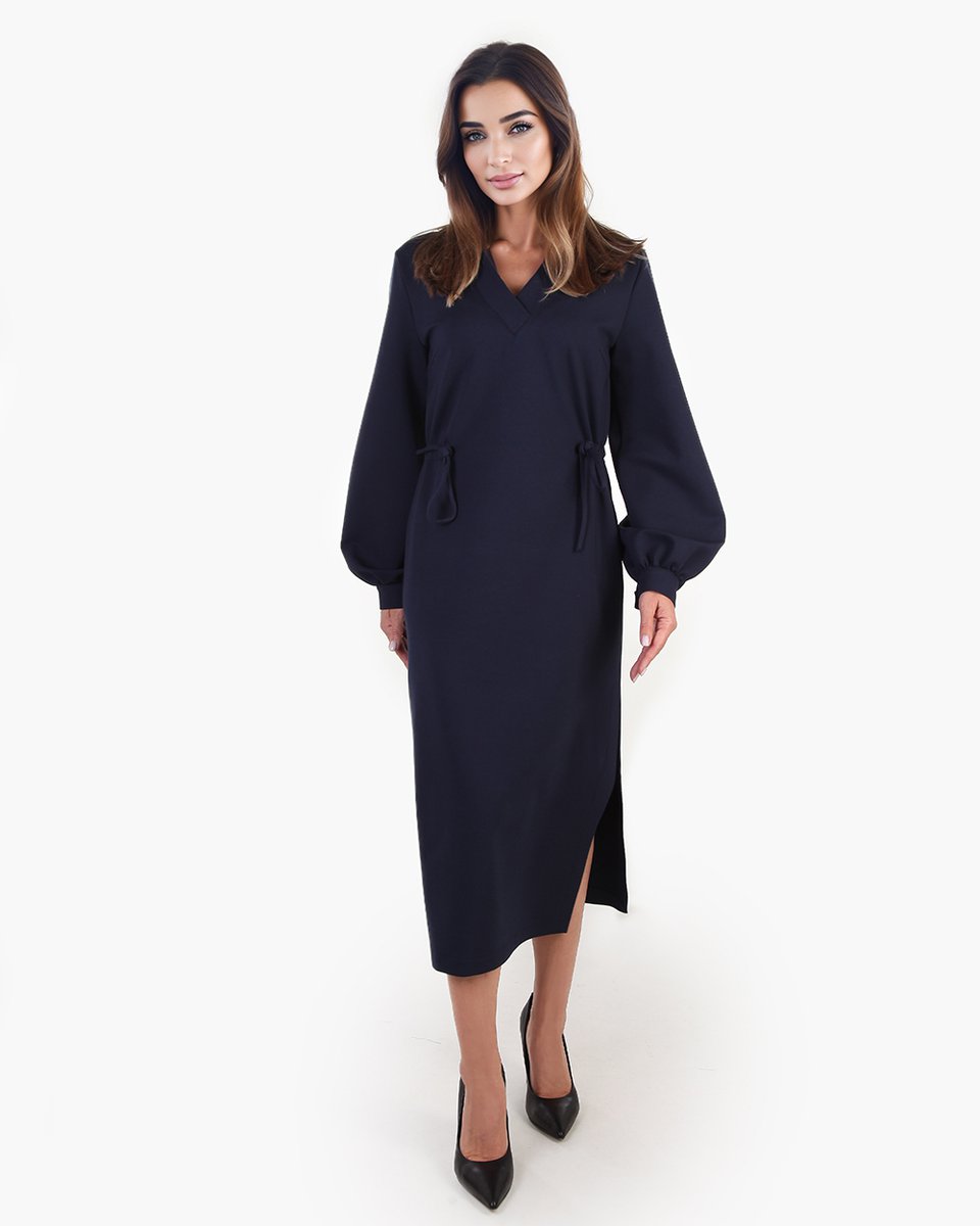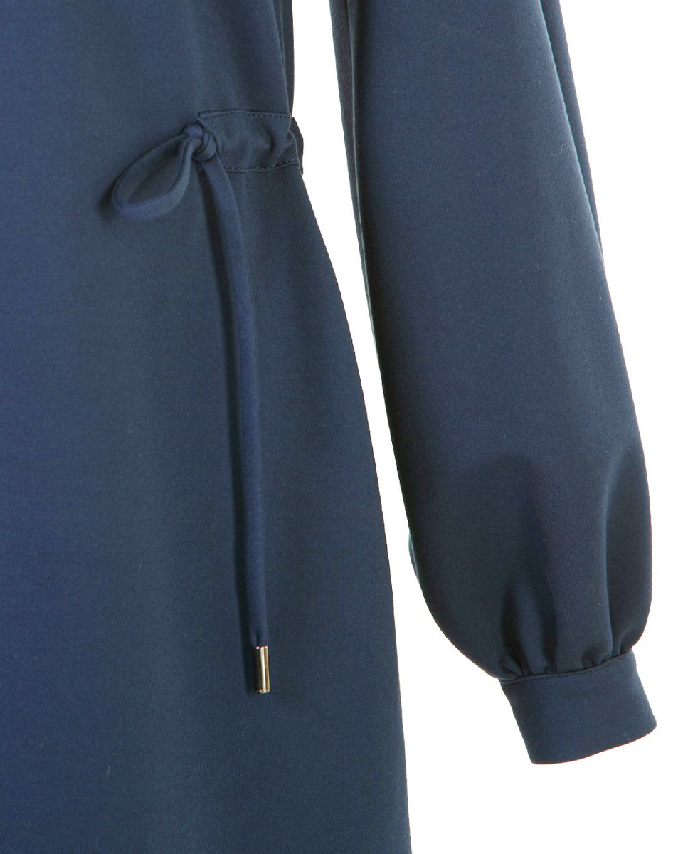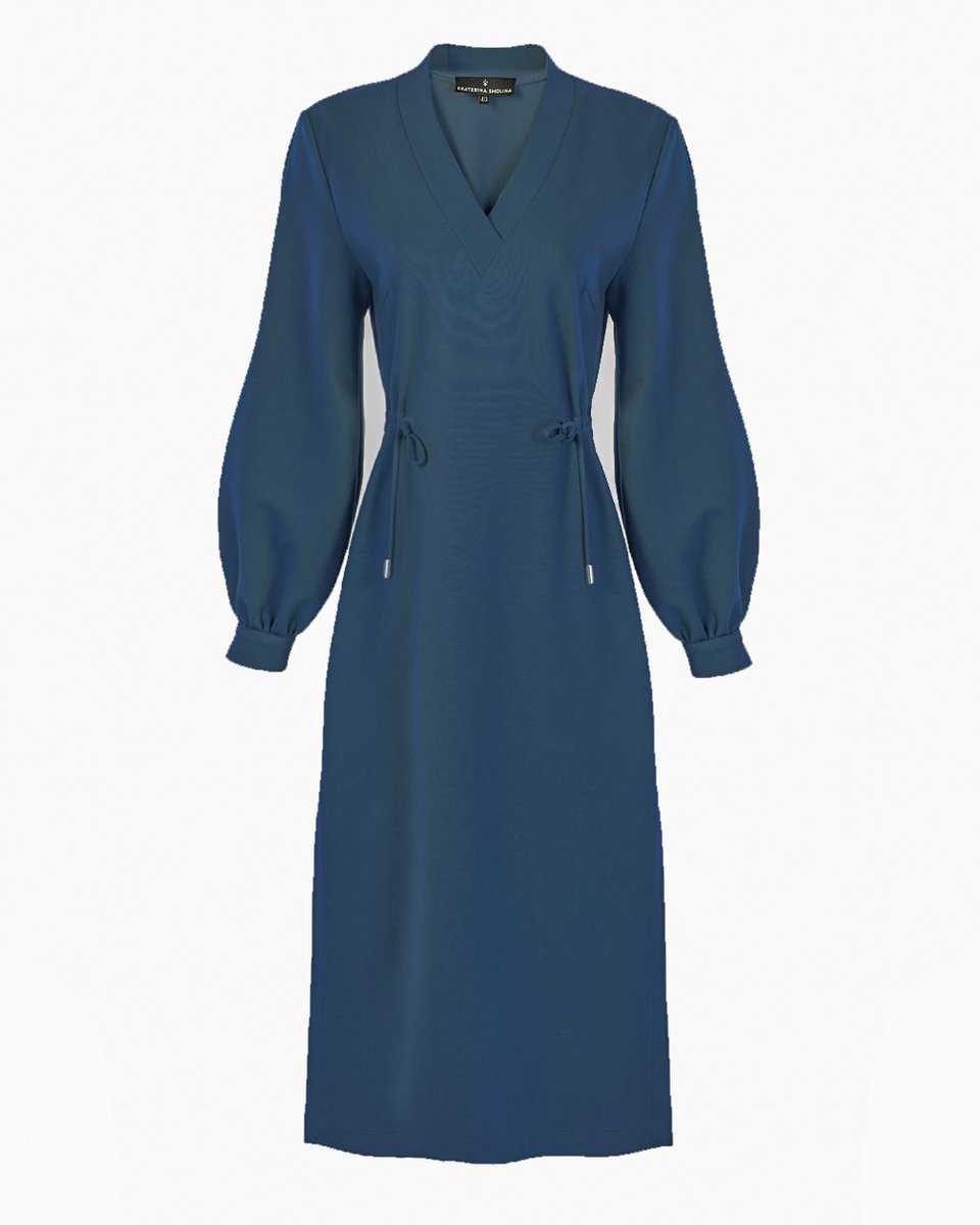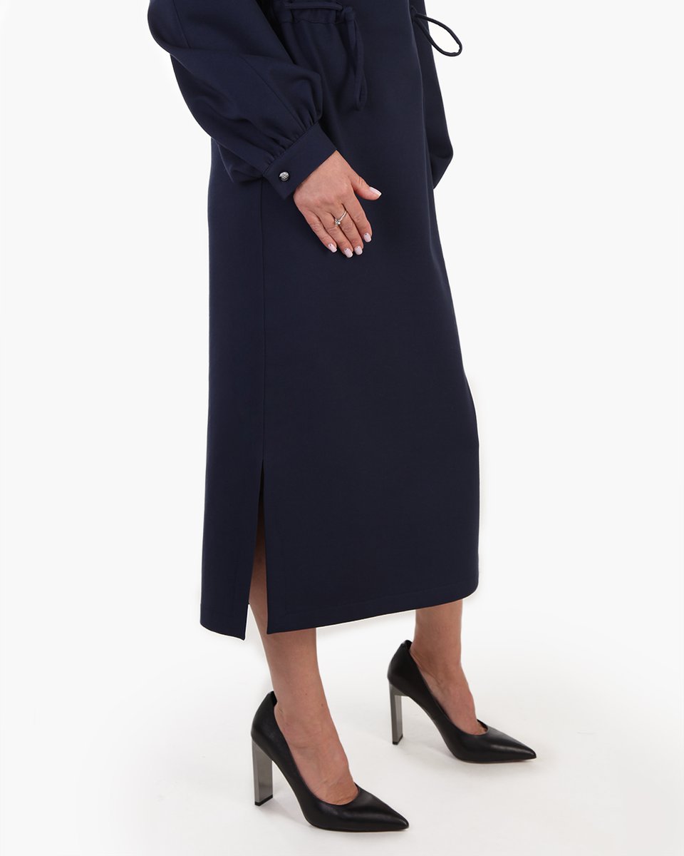 Спортшик платье из эластичной ткани сдержанного сапфирового оттенка. Ткань нежная и гладкая как снаружи, так и с изнанки, приятна тактильно. Платье свободного прямого кроя и возможностью подчерконуть талию кулиской на поясе. Пышные рукава со складкой и сборкой на манжетах создают элегантный объем и акцент. Женственное и комфортное платье идеально подойдет на каждый день.