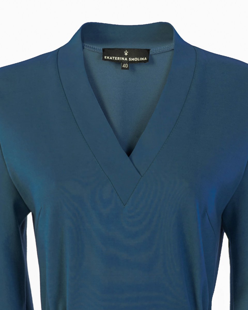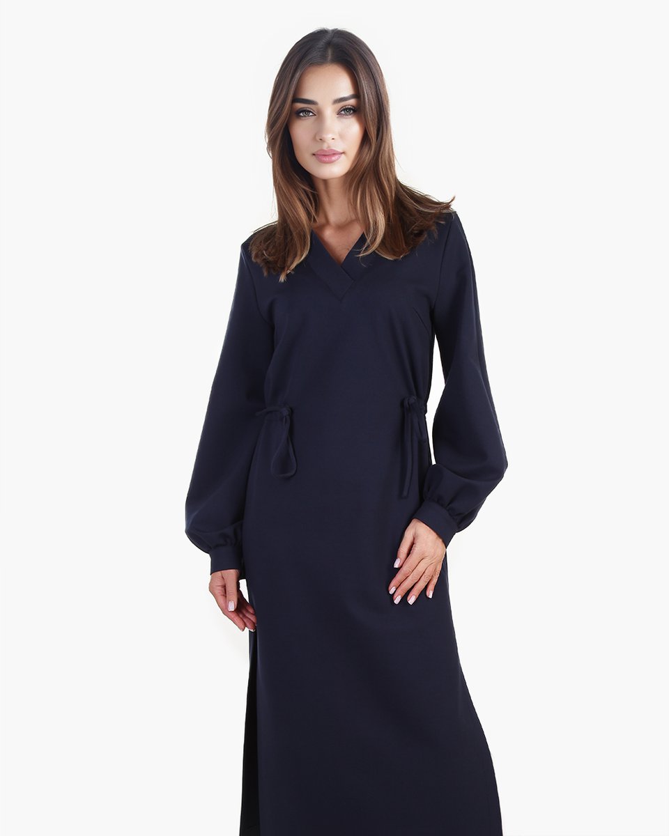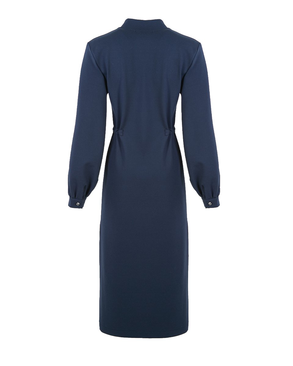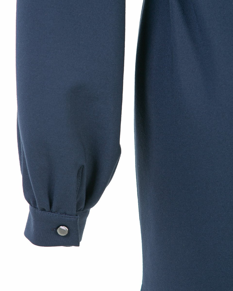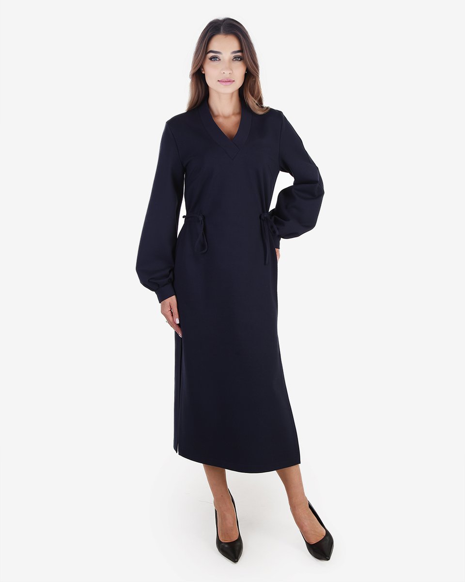 Спортшик платье из эластичной ткани сдержанного сапфирового оттенка. Ткань нежная и гладкая как снаружи, так и с изнанки, приятна тактильно. Платье свободного прямого кроя и возможностью подчерконуть талию кулиской на поясе. Пышные рукава со складкой и сборкой на манжетах создают элегантный объем и акцент. Женственное и комфортное платье идеально подойдет на каждый день.