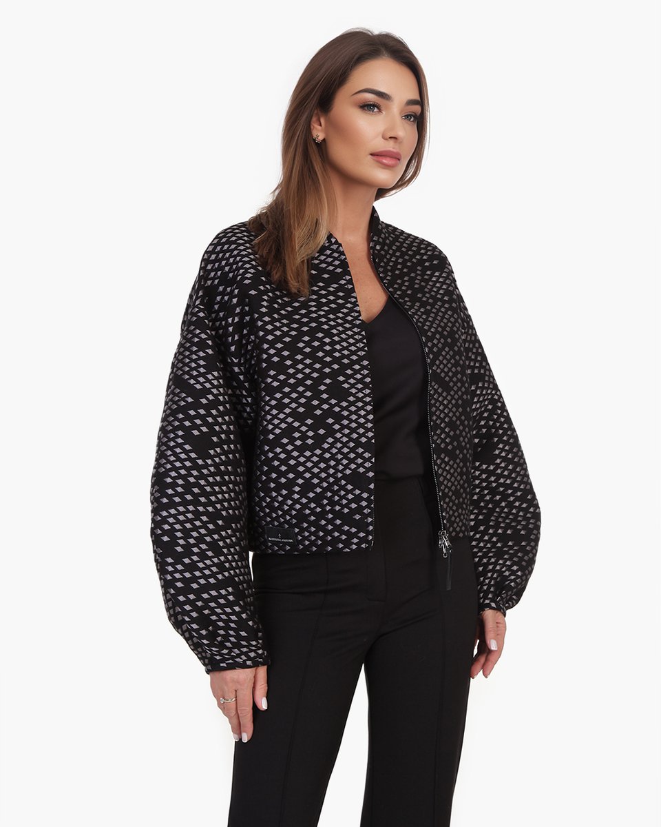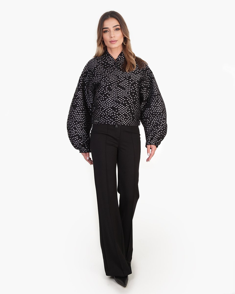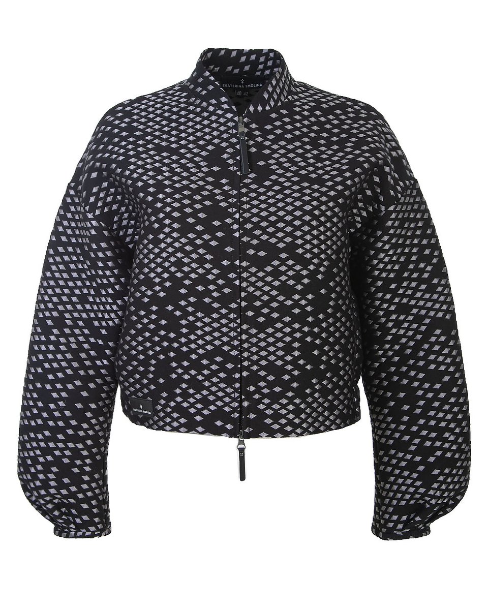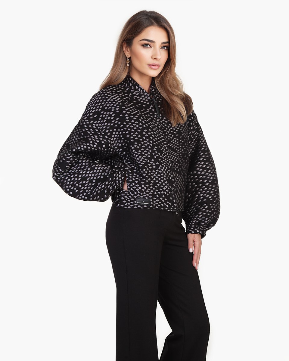 Бомбер из фактурного французского жаккарда, где на глубоком чёрном фоне мерцает узор из серебристых ромбов, напоминающих россыпь звёзд в ночном небе. Модель с прямым кроем и спущенным плечом создаёт непринуждённый, но структурированный силуэт. Пышные рукава, собранные у манжета в складки, добавляют образу объём и легкий романтичный флер. Застёжка на молнию и два боковых кармана делают жакет практичным. Универсальная вещь как для ежедневной носки, так и для вечерних образов, которая станет ярким акцентом в сочетании с однотонными юбками и брюками, джинсами или поверх атласного платья.
