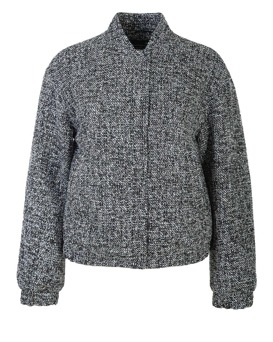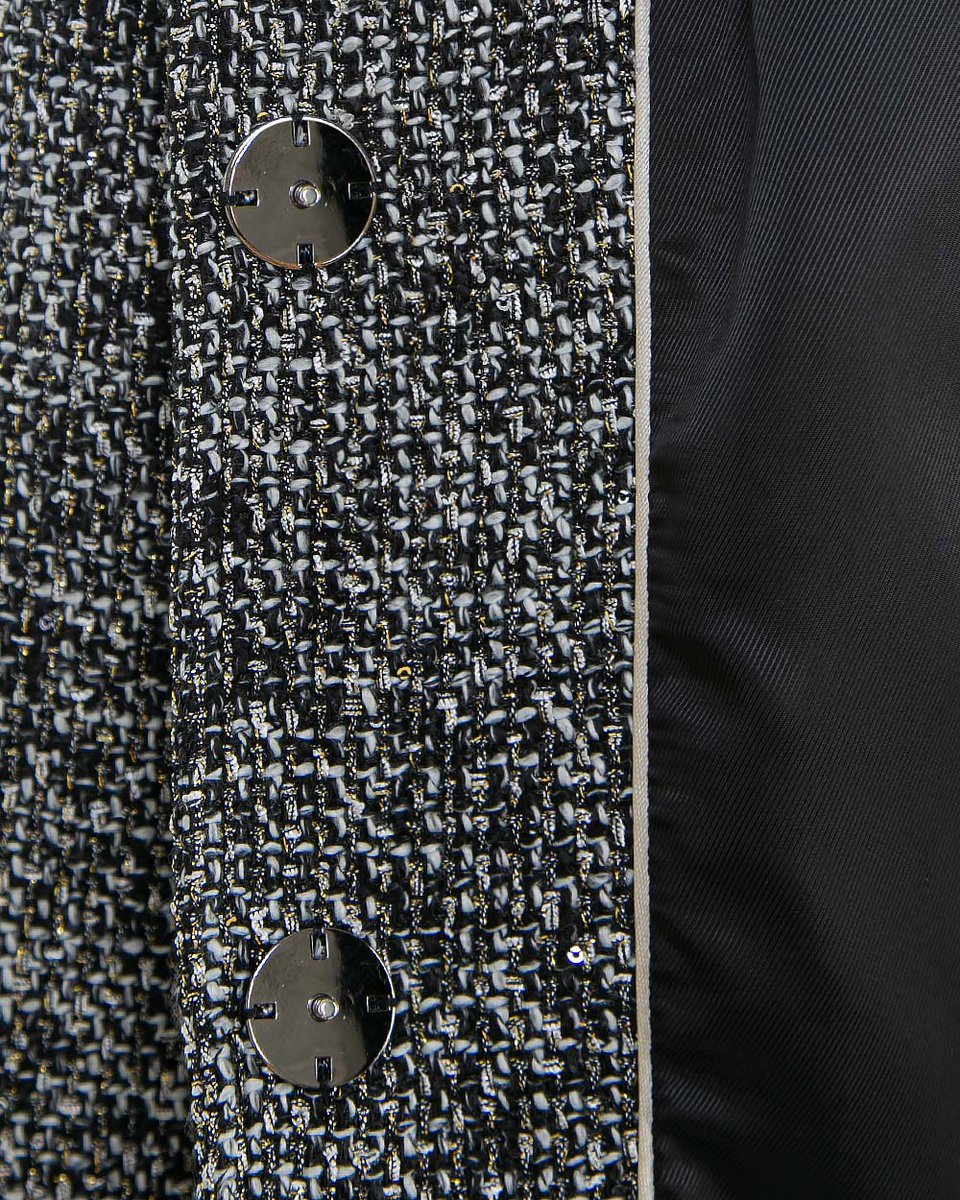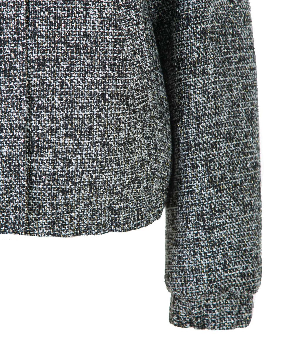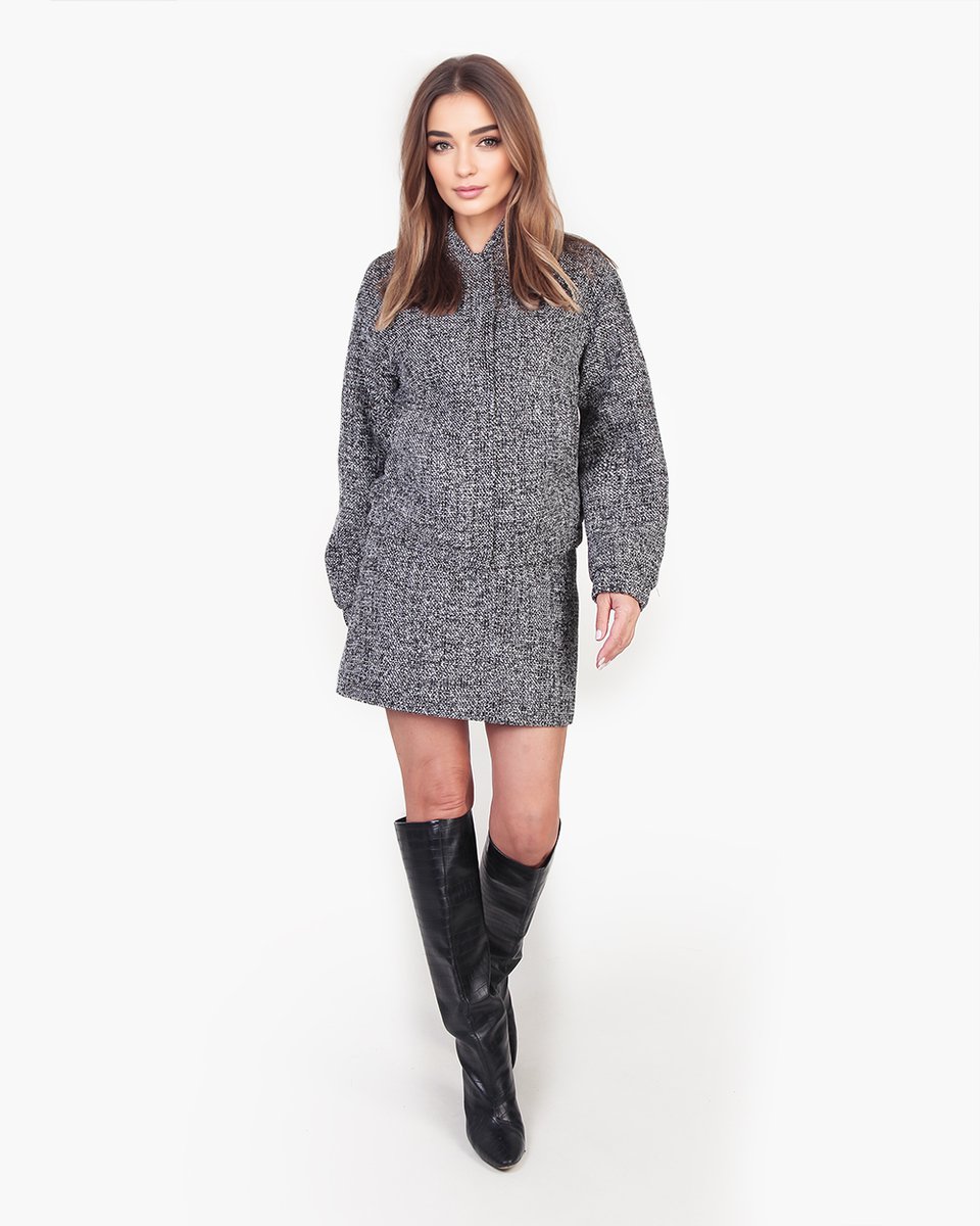 Бомбер из мерцающего роскошного твида, в котором серебристо-серый оттенок переливается золотыми нитями и мельчайшими пайетками. Прямой крой с круглым вырезом и воротником-стойкой создаёт лаконичный и универсальный силуэт. Кнопки под планкой обеспечивают аккуратную застёжку. Низ и манжеты на резинке отсылают к стилю спортшик и делают посадку комфортной. Идеальный верх для сочетания с однотонными брюками, джинсами. В коллекции представлен с мини-юбкой (арт.3128-05) для цельного костюмного образа.