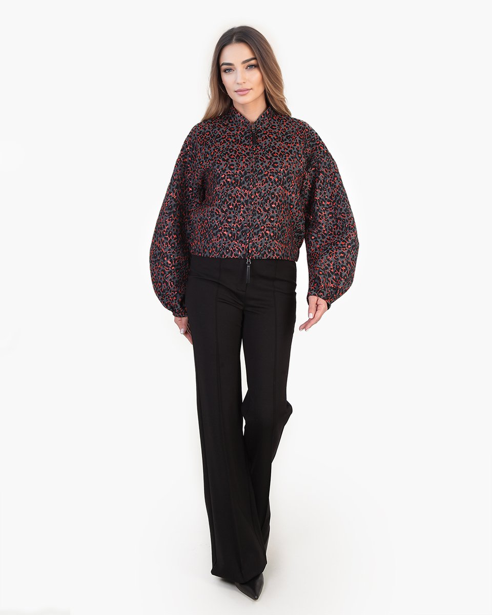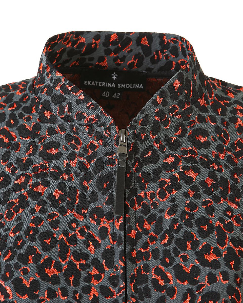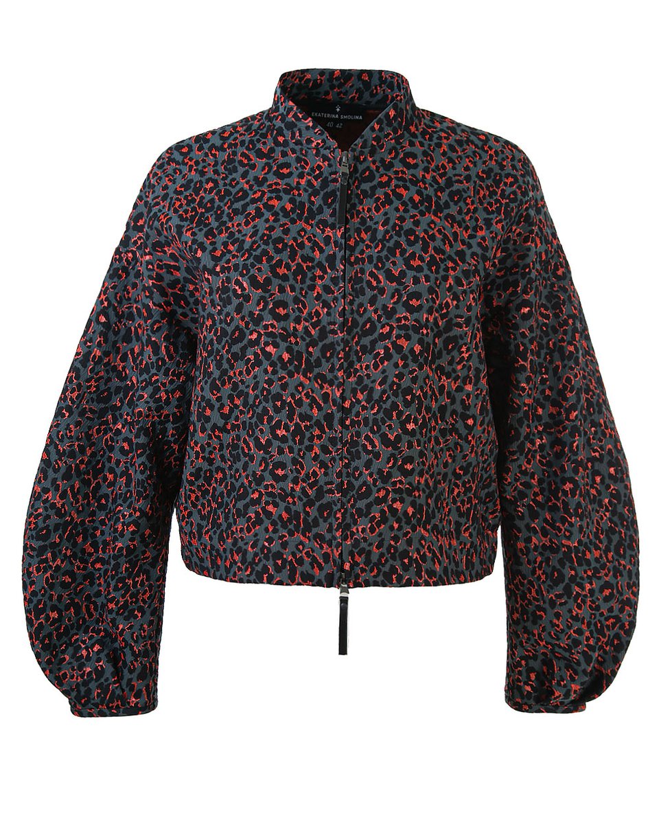 Бомбер из фактурного французского жаккарда с дерзким леопардовым принтом в необычной гамме: классические пятна переливаются оттенками графита, дымчато-чёрного и кораллово-красного. Прямой крой со спущенным плечом и пышные рукава на манжетах создают современный силуэт в духе спортшик. Застёжка на молнию и боковые карманы подчёркивают практичный характер модели. Этот бомбер — идеальный акцент для смелых комбинаций: наденьте его поверх платья для неформального выхода, с джоггерами или для прогулки или с трендовыми брюками-алладинами для выразительного образа на выход.