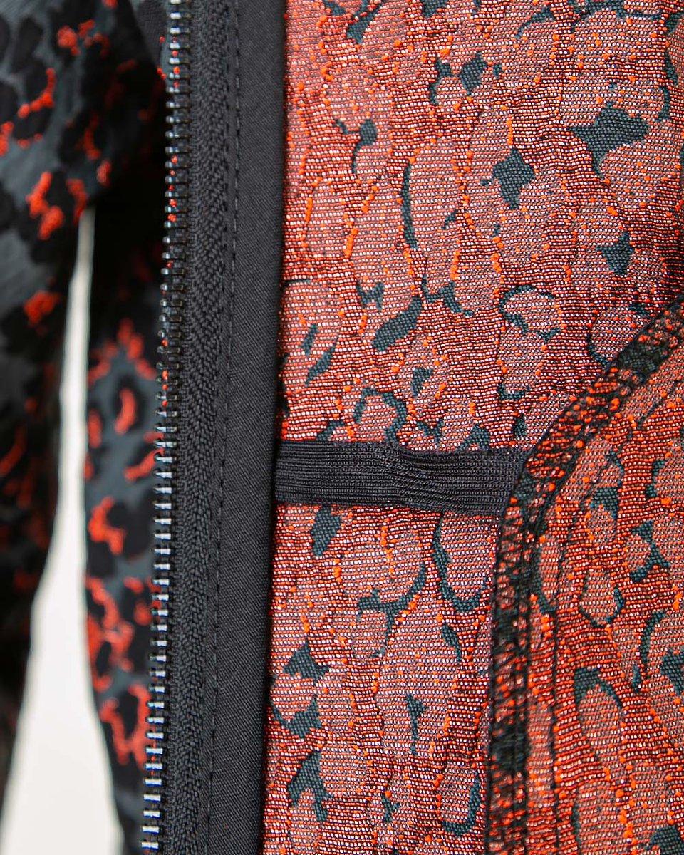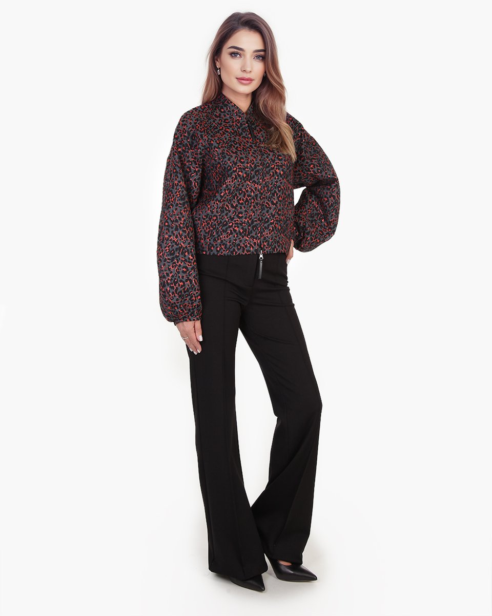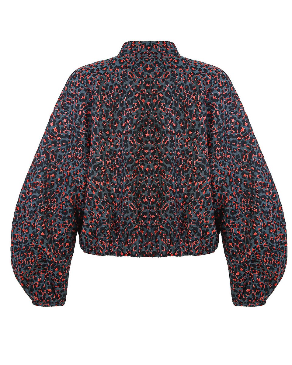 Бомбер из фактурного французского жаккарда с дерзким леопардовым принтом в необычной гамме: классические пятна переливаются оттенками графита, дымчато-чёрного и кораллово-красного. Прямой крой со спущенным плечом и пышные рукава на манжетах создают современный силуэт в духе спортшик. Застёжка на молнию и боковые карманы подчёркивают практичный характер модели. Этот бомбер — идеальный акцент для смелых комбинаций: наденьте его поверх платья для неформального выхода, с джоггерами или для прогулки или с трендовыми брюками-алладинами для выразительного образа на выход.