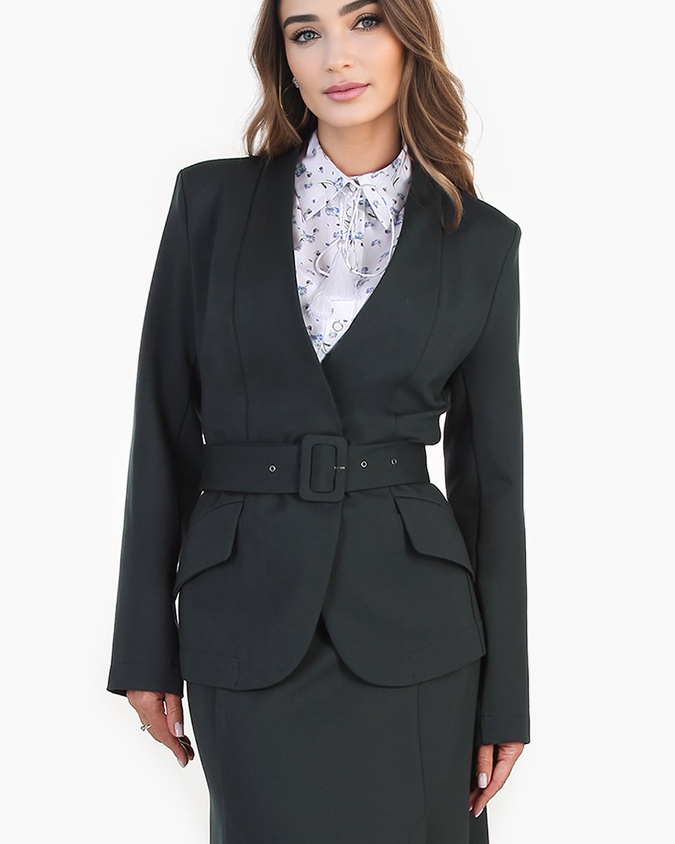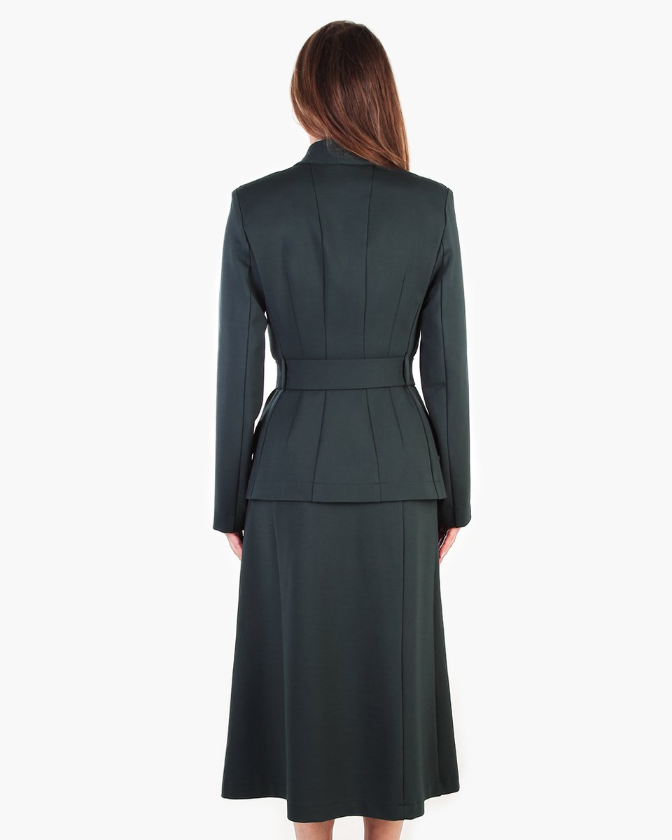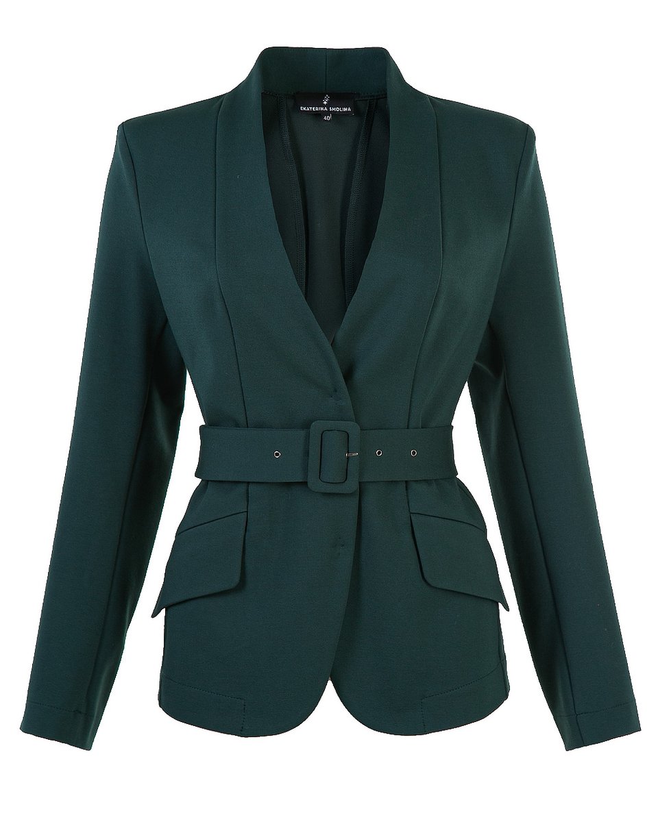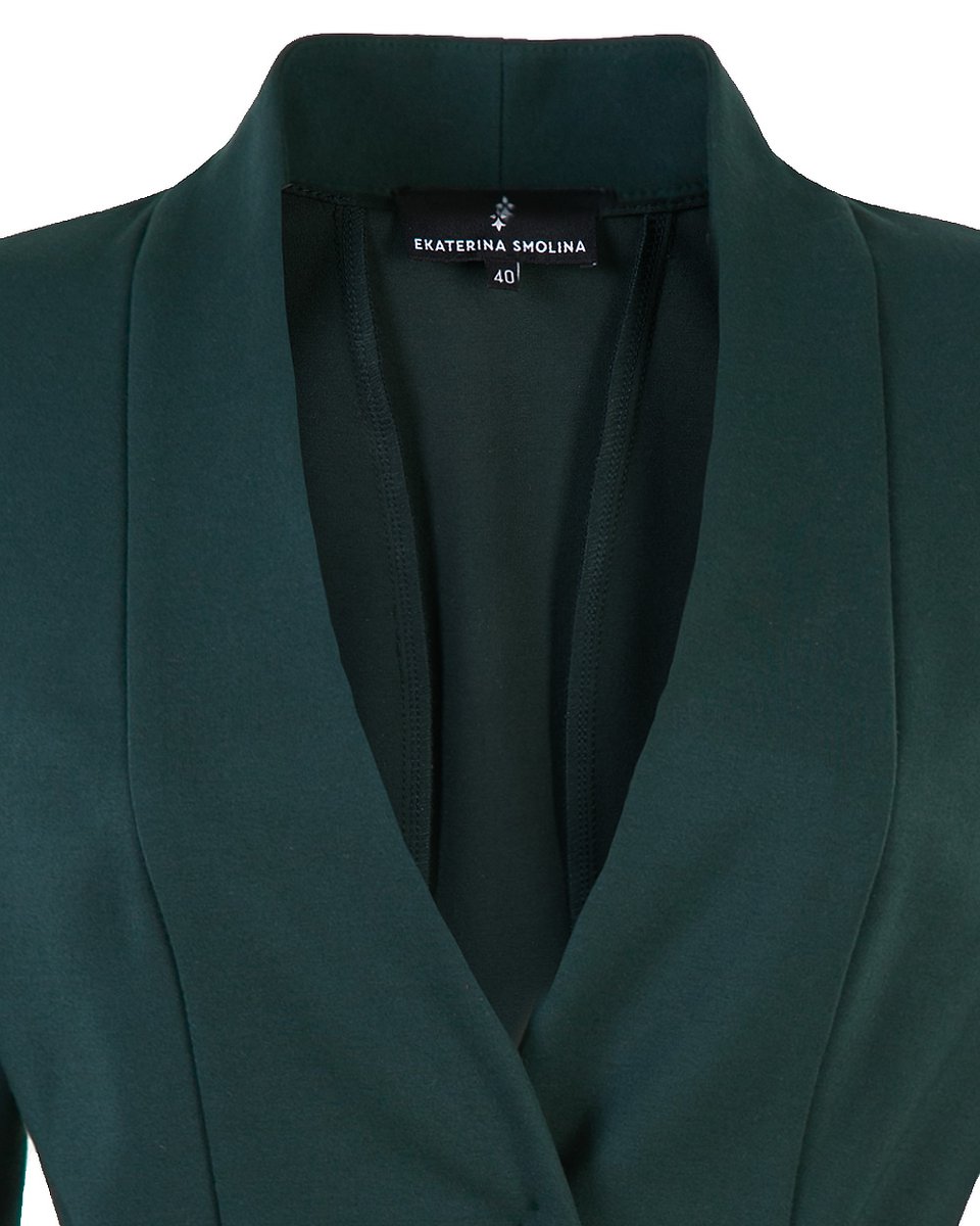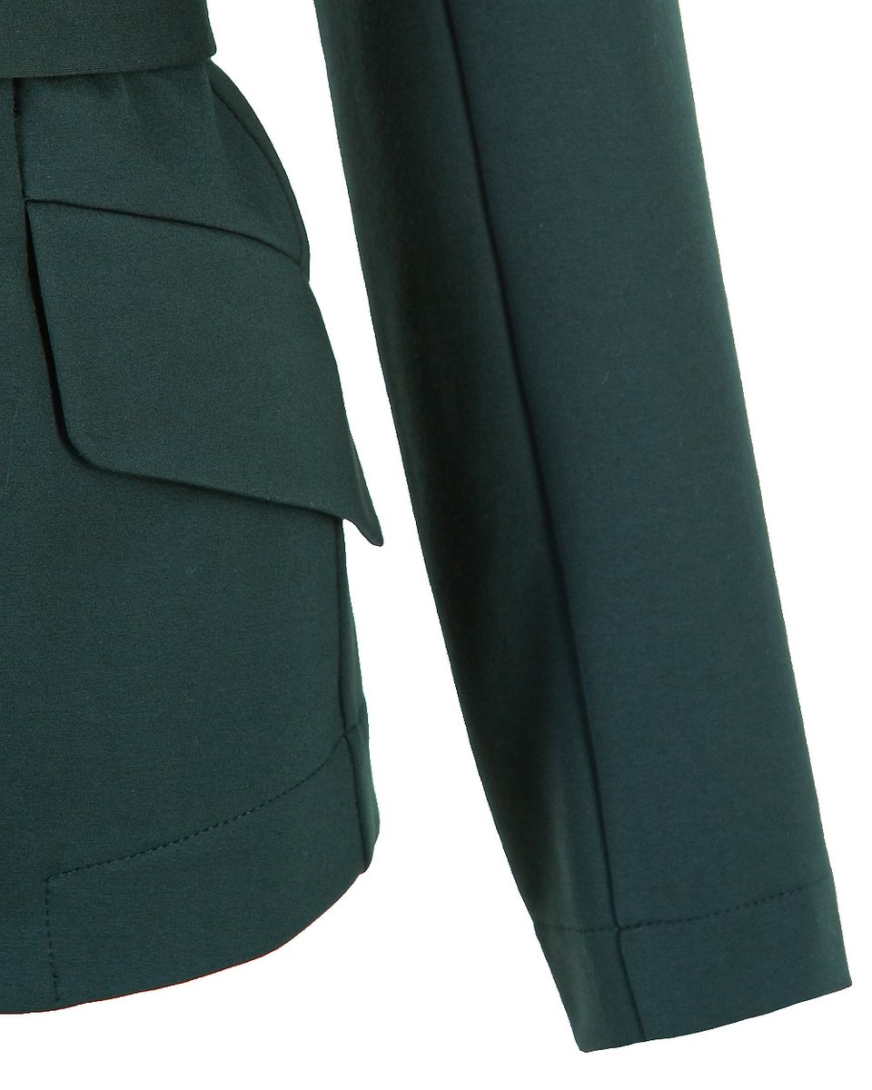 Жакет из плотной и эластичной джерси без подкладки в темно-изумрудном оттенке. Приталенная женственная модель с плотной посадкой по фигуре. Жакет с глубоким элегантным V-образным декольте без лацканов. К такому лаконичному крою подойдут топы с глубоким декольте, рубашки-поло с акцентной застежкой или блузы и платья с жабо, лентами или акцентными деталями на воротничке.