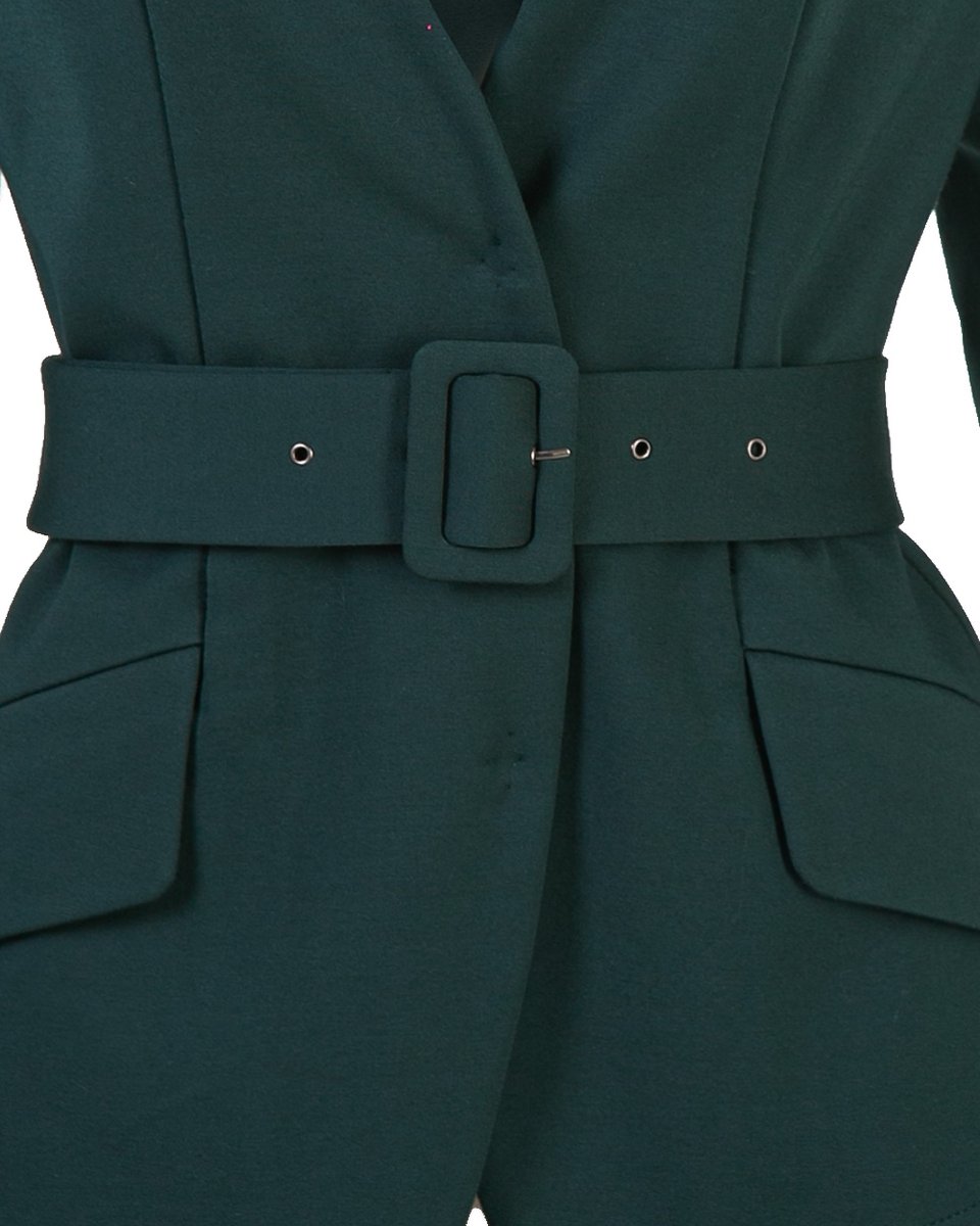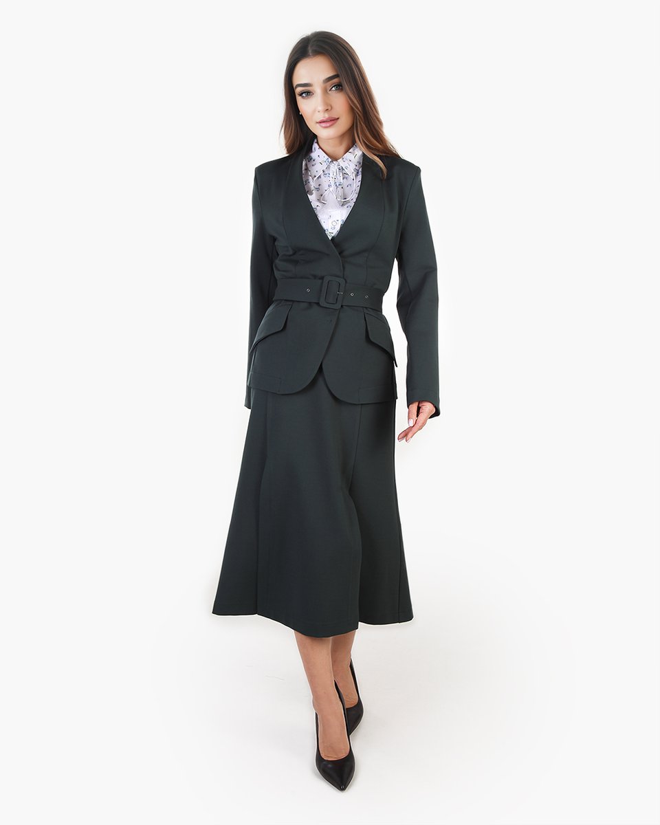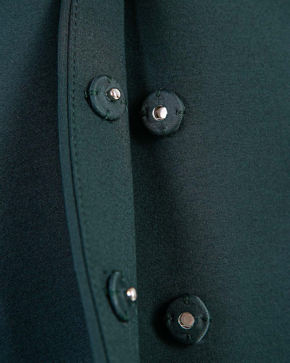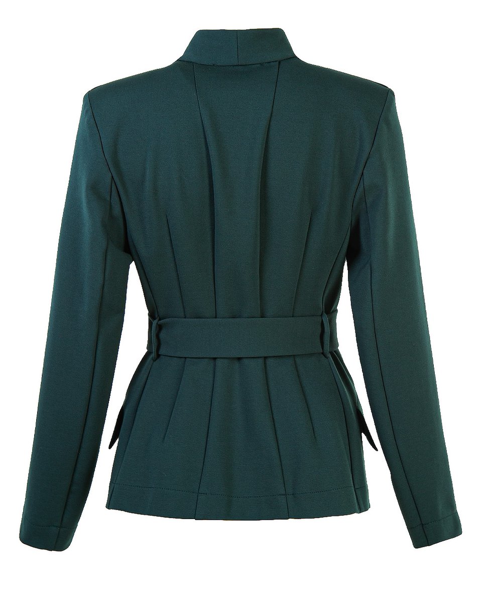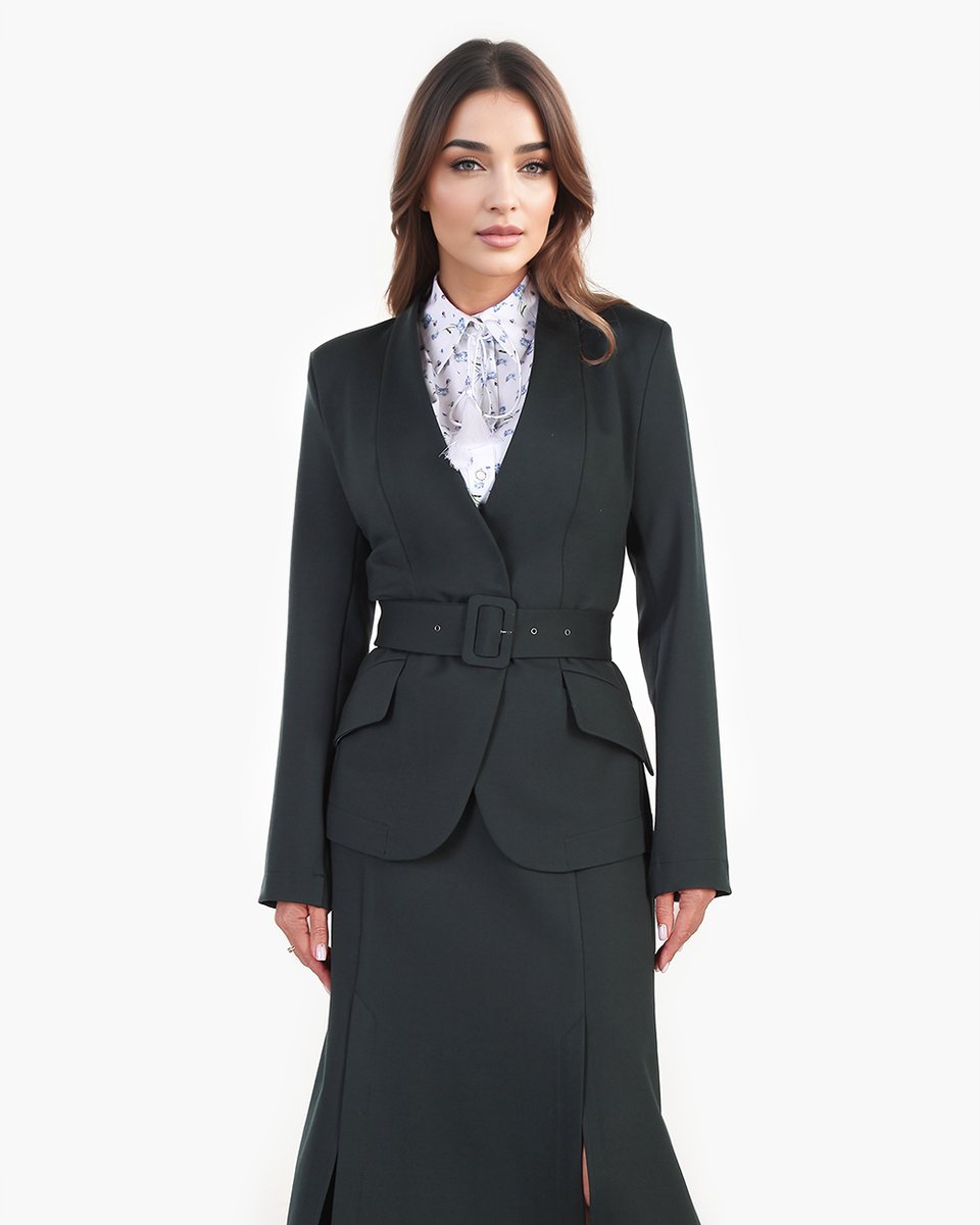Жакет из плотной и эластичной джерси без подкладки в темно-изумрудном оттенке. Приталенная женственная модель с плотной посадкой по фигуре. Жакет с глубоким элегантным V-образным декольте без лацканов. К такому лаконичному крою подойдут топы с глубоким декольте, рубашки-поло с акцентной застежкой или блузы и платья с жабо, лентами или акцентными деталями на воротничке.