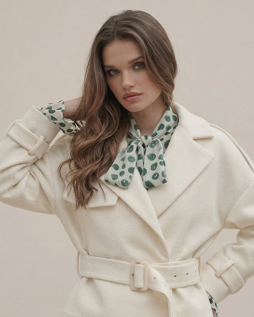 Жакет-косуха свободного кроя с мягким расслабленным силуэтом. Благородная пальтовая ткань молочного оттенка подчеркивает чистоту линий и фактуры. Спущенная линия плеча, погоны и паты на манжетах добавляют модели структурности и легкой дерзости в духе классической косухи. Застежка на потайные кнопки и широкий текстильный пояс в тон позволяют менять силуэт — от объемного до более собранного с акцентной талией. Сочетаем с мягкими фактурами: замшей, вельветом и кожей в натуральных оттенках, со строгими и пышными юбками, яркими принтами, а также с повседневным денимом.