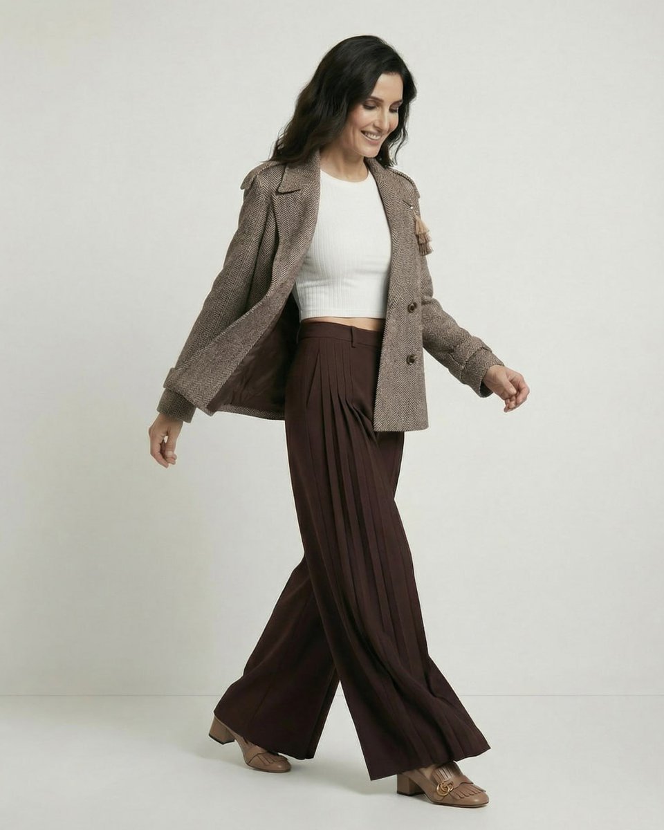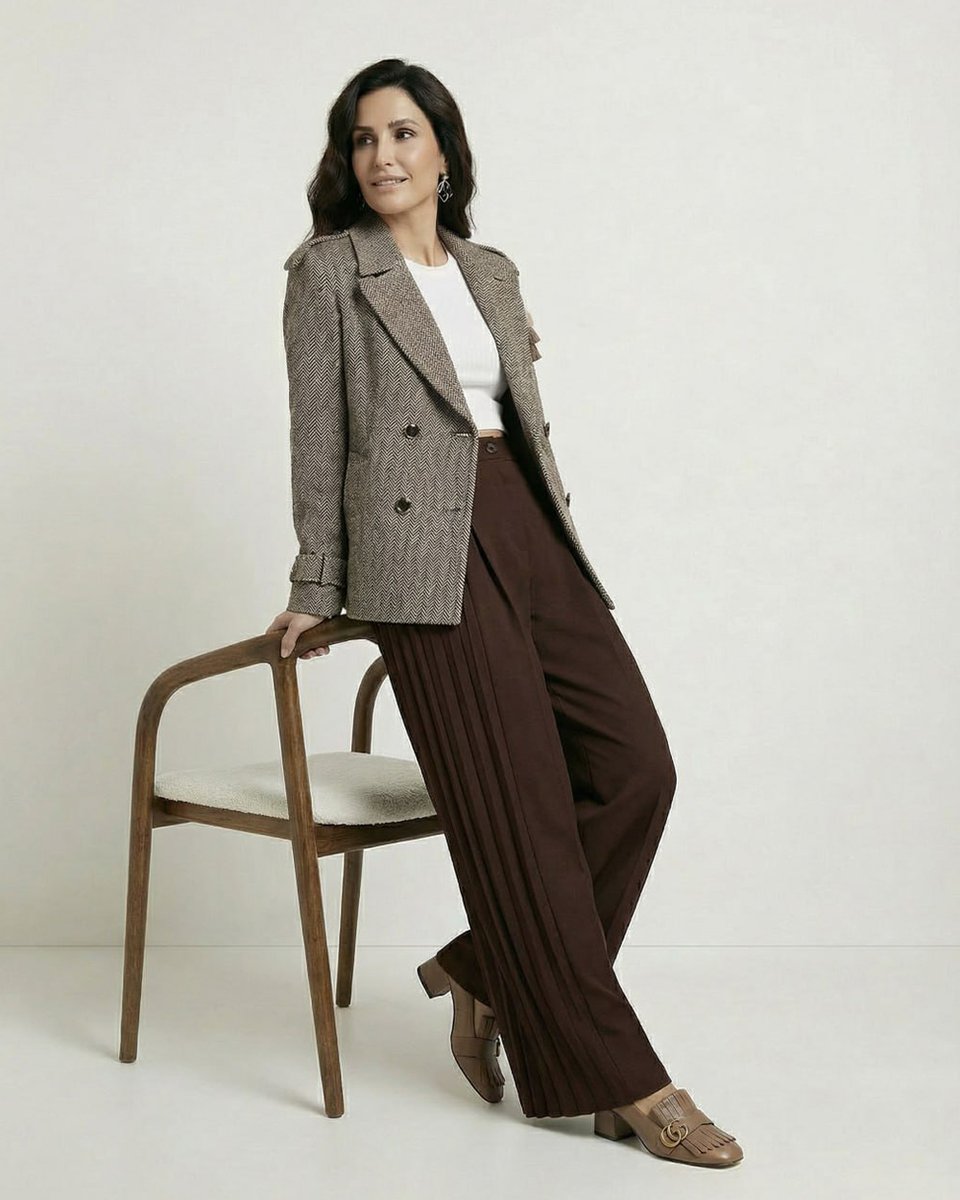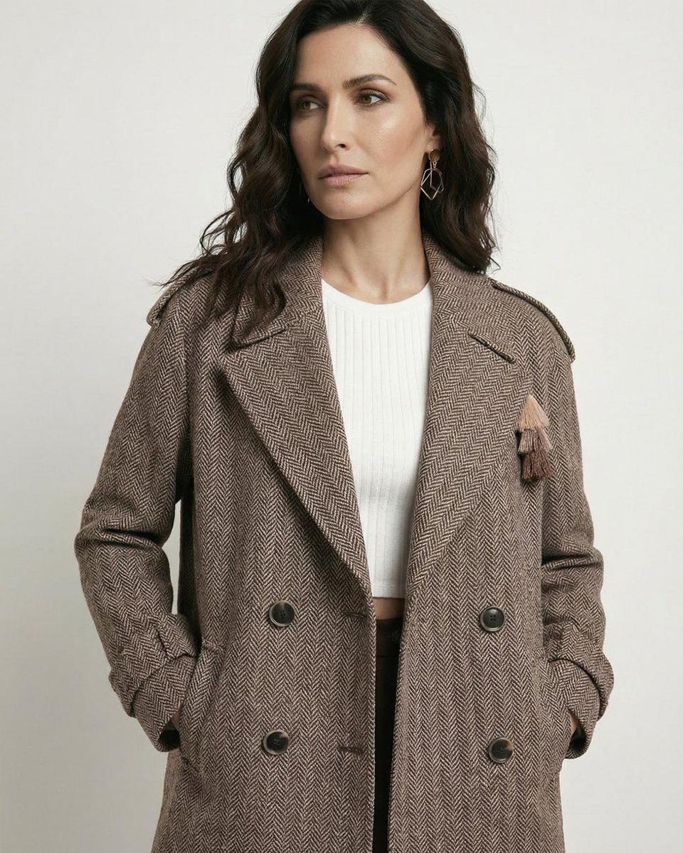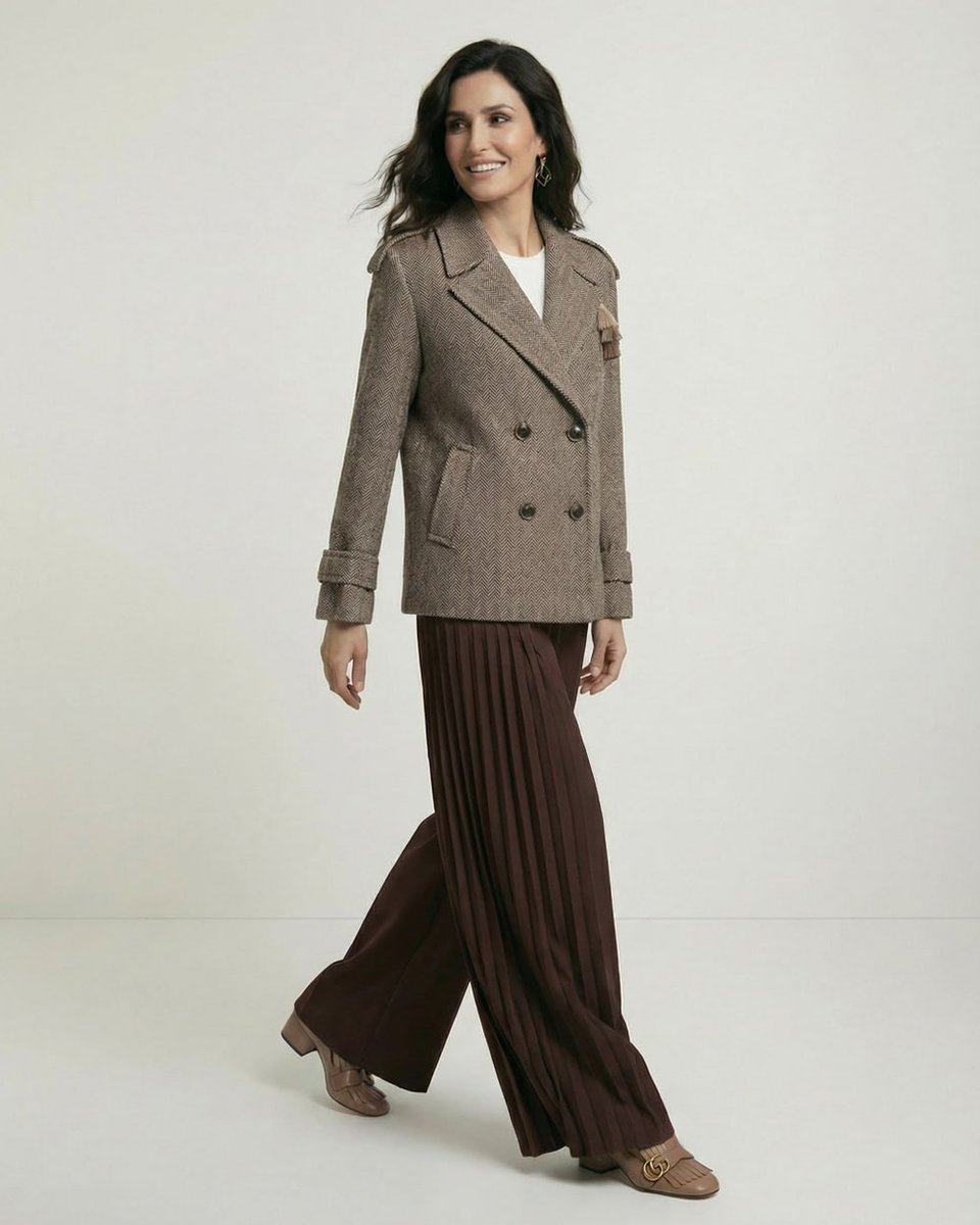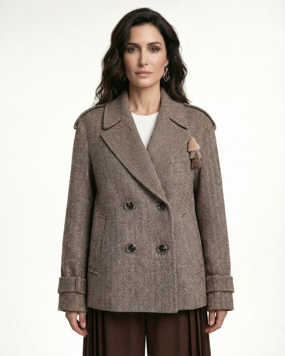 Полупальто-бушлат с характером и вниманием к деталям. Благородный шерстяной драп табачного цвета с текстурным узором «Ёлочка» создает объем и глубину. Крой легкой трапеции добавляет мягкости классическому строгому силуэту. Английский воротник украшен съемной ярусной кисточкой из нитей в трех бежевых оттенках – она крепится на пуговицу, и ее можно убрать, меняя настроение модели. Погоны на плечах и паты на манжетах подчеркивают структурность образа. Для тех, кто ценит классику и маленькие неожиданные акценты.