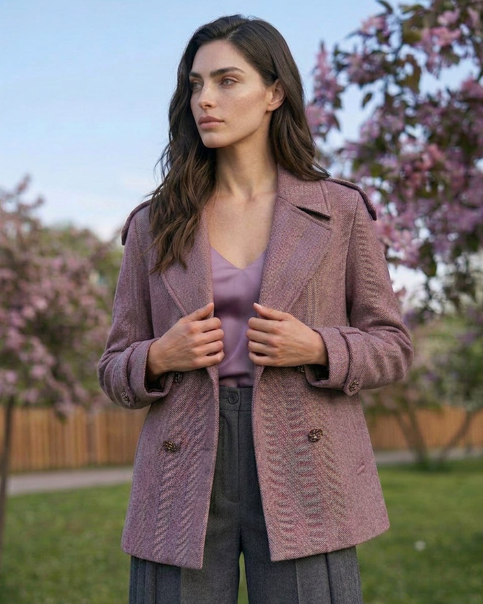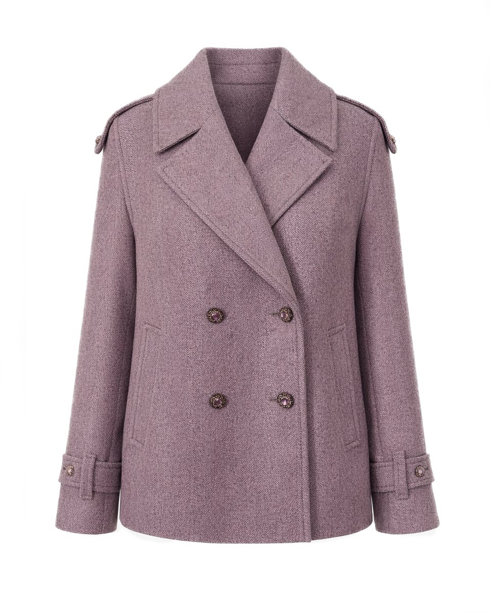 Полупальто-жакет трапециевидного кроя из тёплой шерсти с фактурным рисунком «Елочка» в сдержанном природном оттенке. Плотная, но пластичная ткань мягко держит форму, создавая лаконичный силуэт, который не сковывает движения и комфортно садится по фигуре. Погоны на плечах и паты на манжетах подчеркивают структурность образа. Для тех, кто ценит классику и маленькие неожиданные акценты. Универсальная модель для города: носите её с кедами, прямыми джинсами и объёмным шарфом или набросьте поверх платья-свитера.