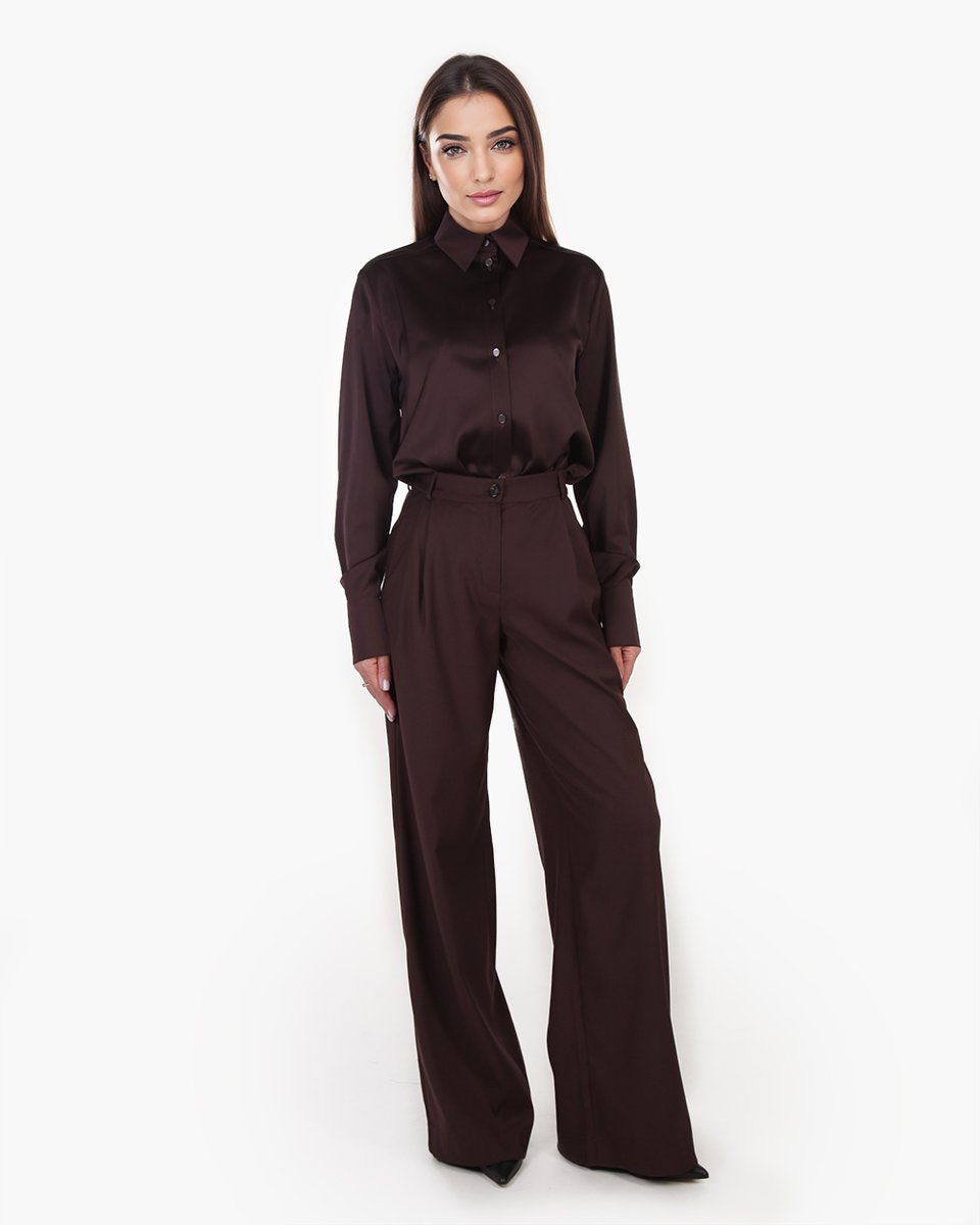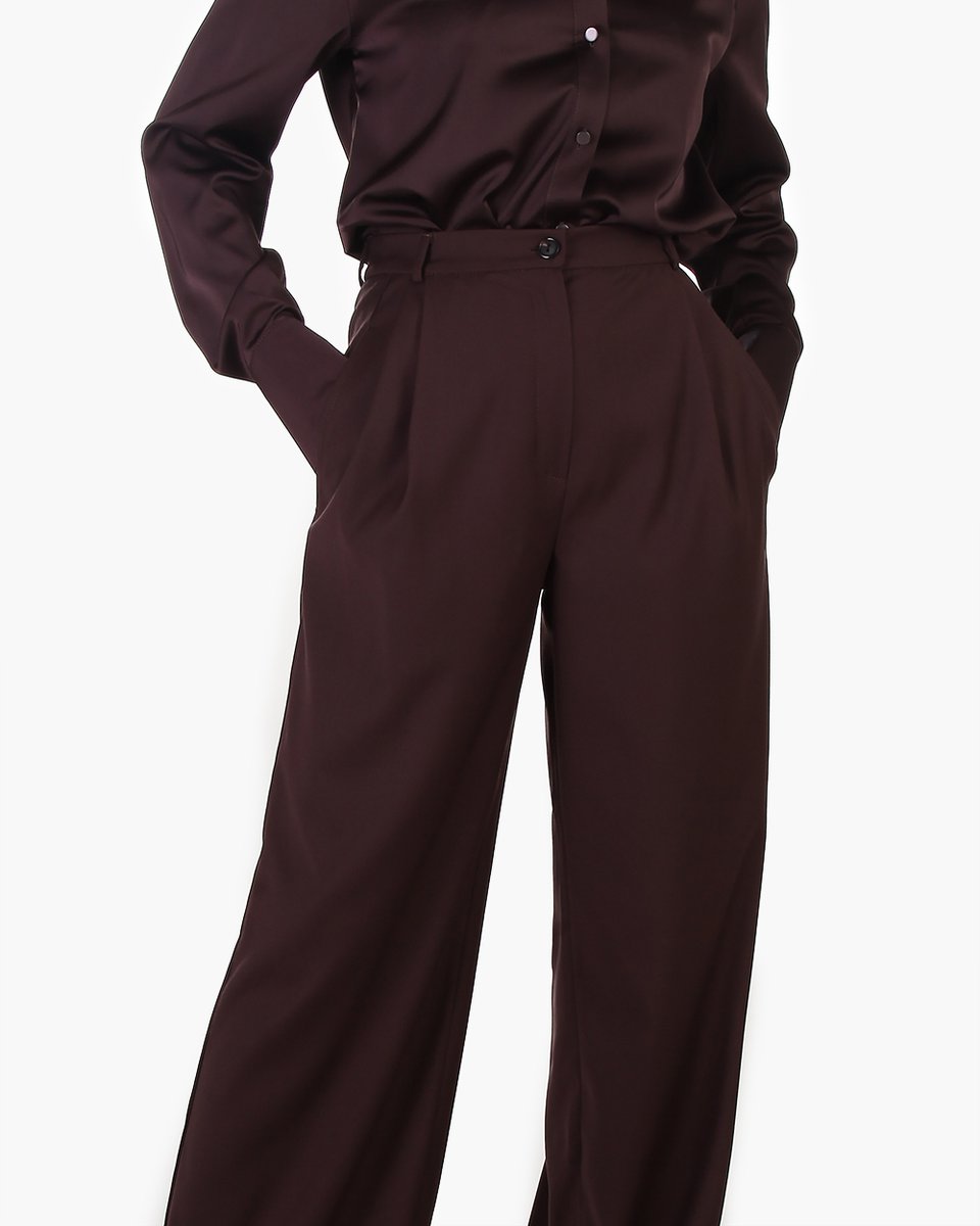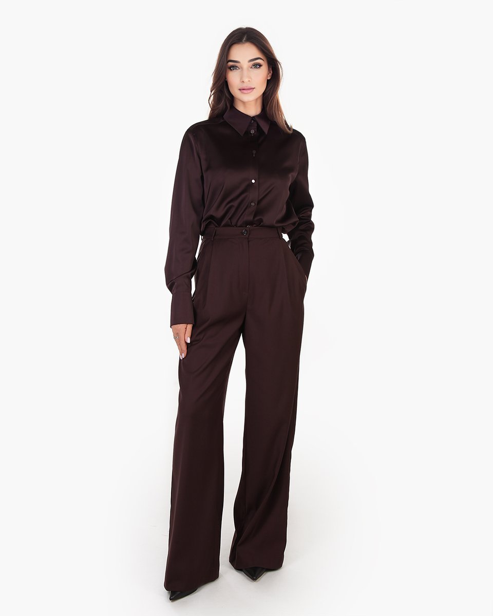 Брюки из тонкой костюмной шерсти в трендовом цвете горького шоколада. Модель прямого кроя с защипами на талии, которые обеспечивают элегантную драпировку и ширину брюк. Базовые брюки составят основу для деловых и повседневных образов. В коллекции представлены с жилетом (арт. 3091-11) и блузой (арт.3302-04) в тон.