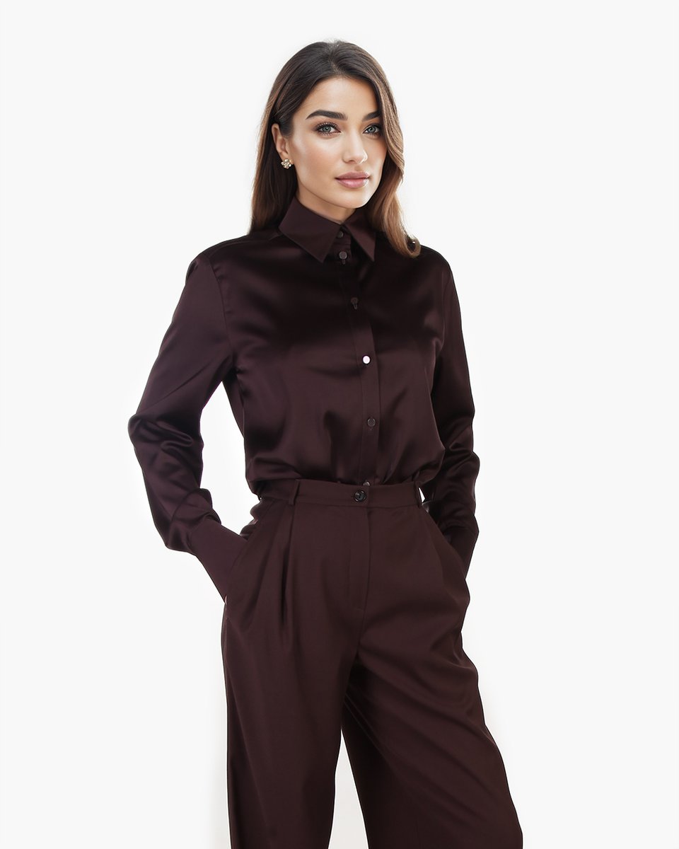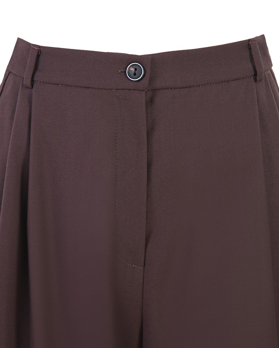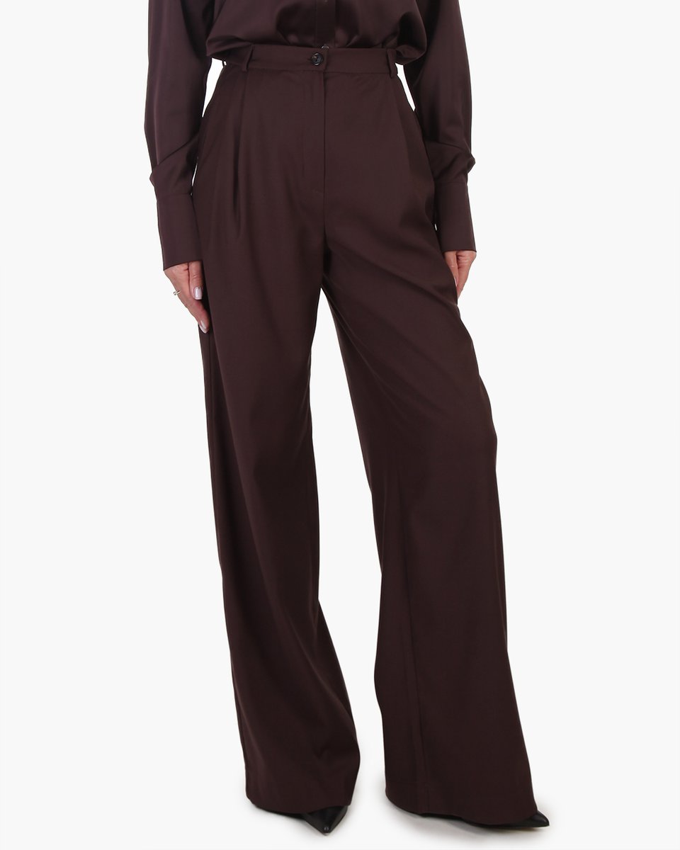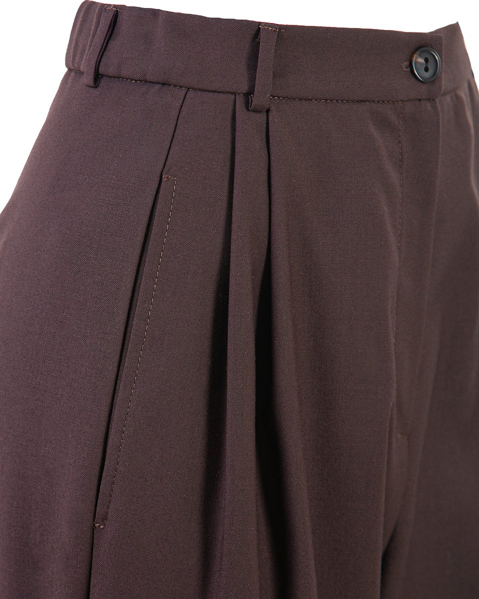 Брюки из тонкой костюмной шерсти в трендовом цвете горького шоколада. Модель прямого кроя с защипами на талии, которые обеспечивают элегантную драпировку и ширину брюк. Базовые брюки составят основу для деловых и повседневных образов. В коллекции представлены с жилетом (арт. 3091-11) и блузой (арт.3302-04) в тон.