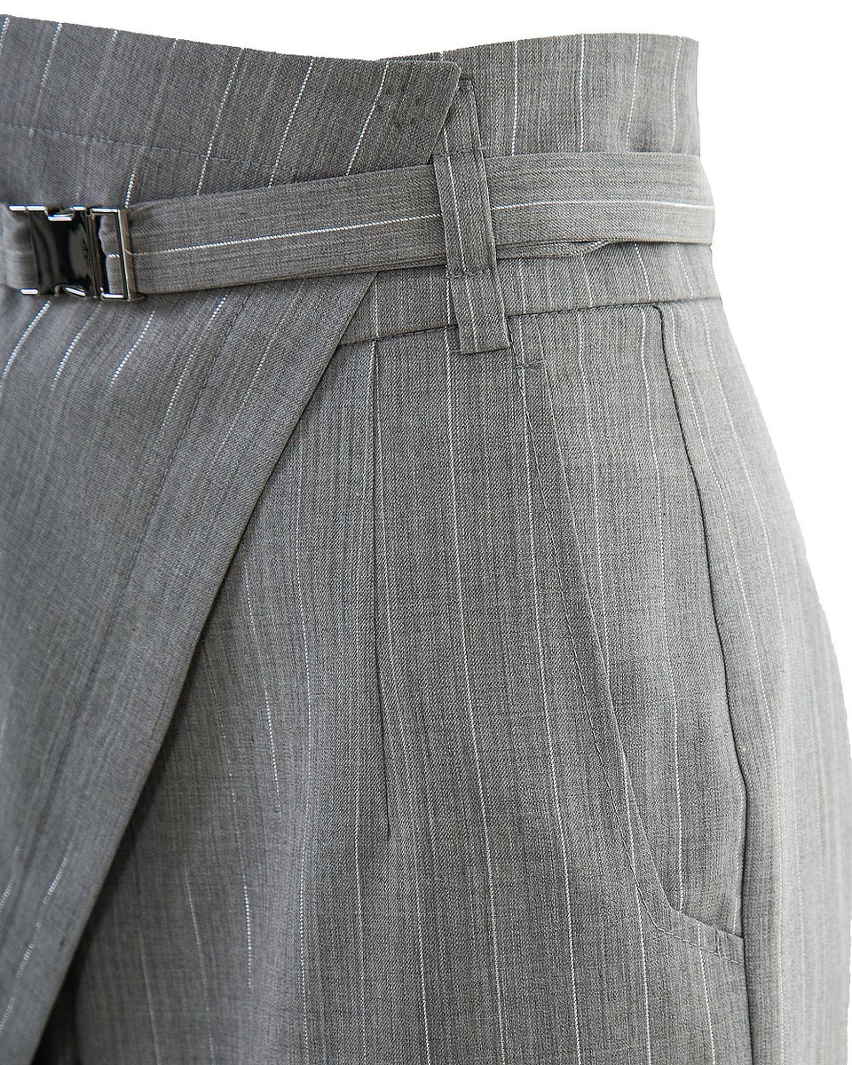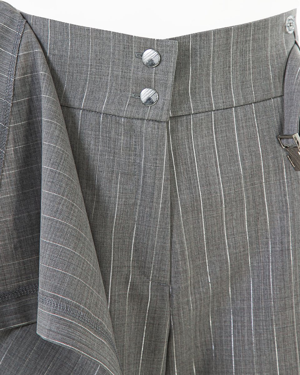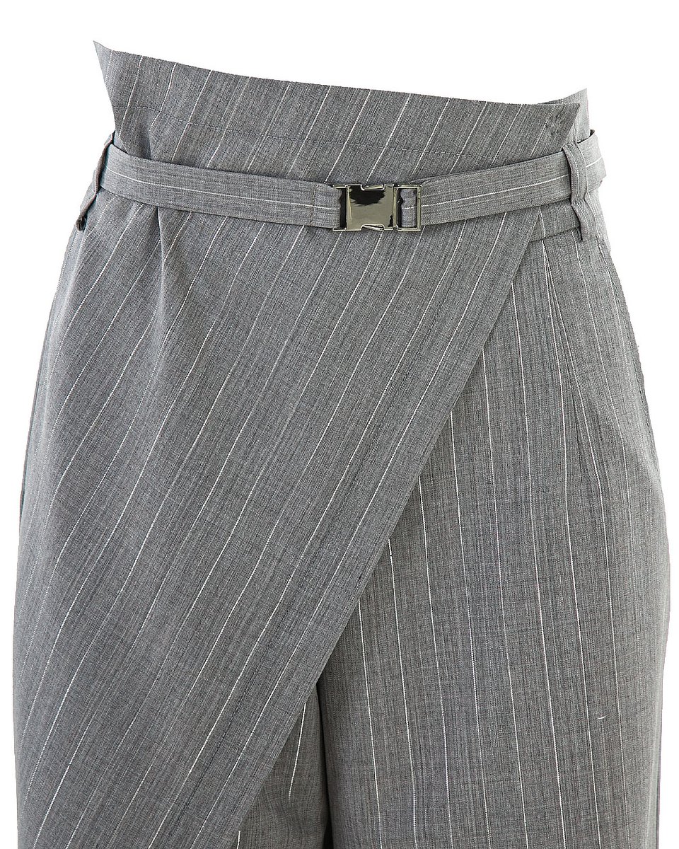 Многослойные брюки-клеш в тонкую полоску со стрелками и асимметричной полубаской. Баска не съемная и притачена к поясу с правой стороны, образуя асимметричную мини-юбку. Модель дополнена тонким поясом с металлической пряжкой фастекс. Эти детали делают классические брюки акцентными в рамках делового гардероба и подчеркивают индивидуальный стиль. Брюки в серебристо-дымчатом оттенке подойдут для деловых и smart-casual образов, а серебристая нить в полоске придаст вечернего и нарядного настроения образу.