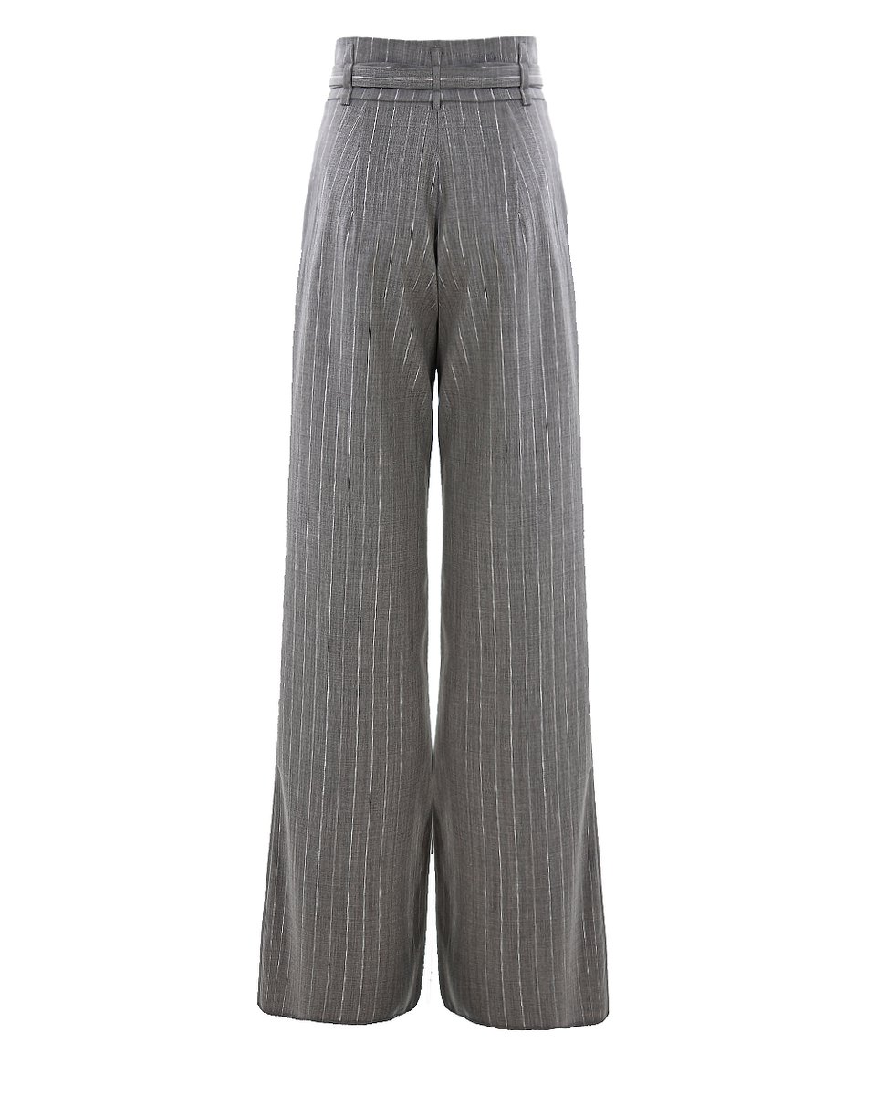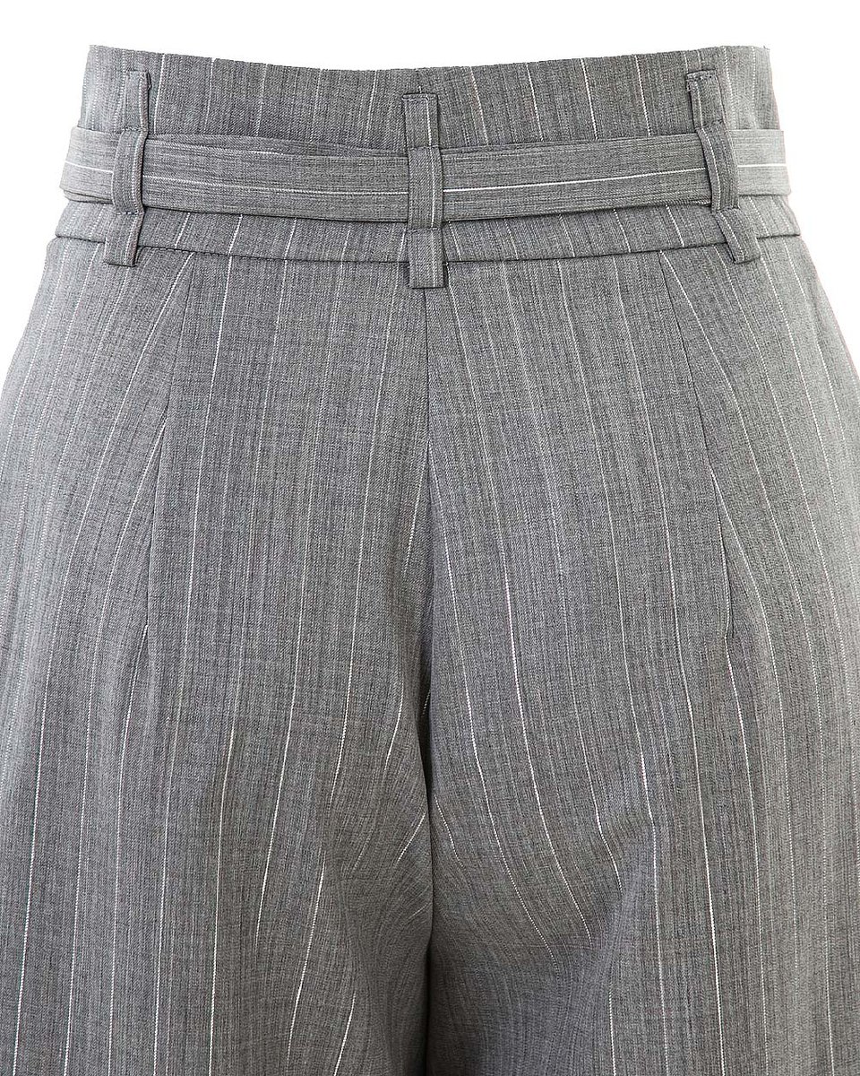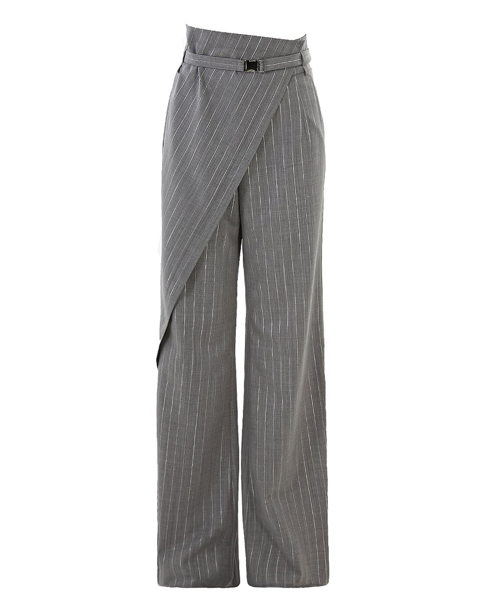 Многослойные брюки-клеш в тонкую полоску со стрелками и асимметричной полубаской. Баска не съемная и притачена к поясу с правой стороны, образуя асимметричную мини-юбку. Модель дополнена тонким поясом с металлической пряжкой фастекс. Эти детали делают классические брюки акцентными в рамках делового гардероба и подчеркивают индивидуальный стиль. Брюки в серебристо-дымчатом оттенке подойдут для деловых и smart-casual образов, а серебристая нить в полоске придаст вечернего и нарядного настроения образу.